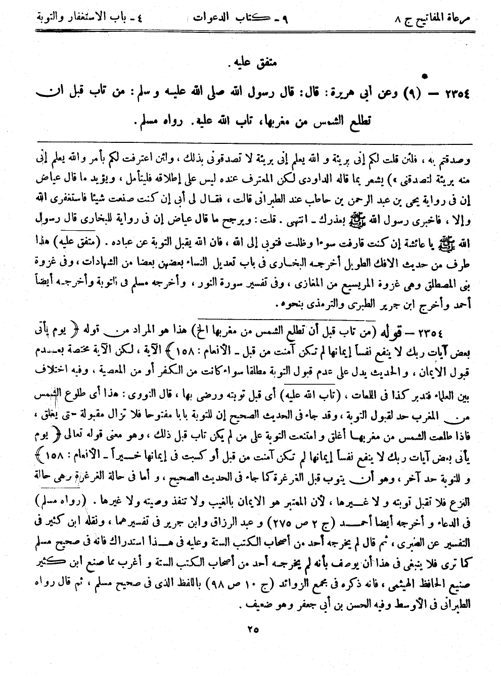 2354- (9) وَعَنْ أَبِي هُرَيْرَةَ قَالَ: قَالَ رَسُولُ اللَّهِ صَلَّى اللَّهُ عَلَيْهِ وَسَلَّمَ: مَنْ تَابَ قَبْلَ أَنْ تَطْلُعَ الشَّمْسُ مِنْ مَغْرِبِهَا تَابَ اللَّهُ عَلَيْهِ. رواه مسلم.