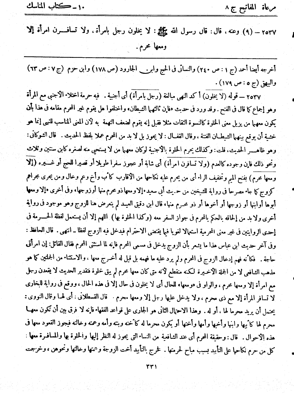 2537- (9) وعنه قال: قال رسول الله - صلى الله عليه وسلم -: لا يخلون رجل بامرأة، ولا تسافرن امرأة إلا ومعها محرم.
