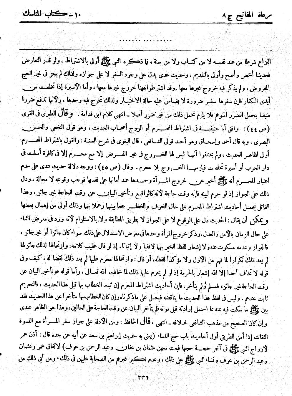 النزاع شرطًا من عند نفسه لا من كتاب ولا من سنة، فما ذكره النبي - صلى الله عليه وسلم - أولى بالاشتراط، ولو قدر التعارض فحديثنا أخص وأصح وأولى بالتقدم، وحديث عدي يدل على وجود السفر لا على جوازه ولذلك لم يجز في غير الحج المفروض، ولم يذكر فيه خروج غيرها معها، وقد اشترطوا ها هنا خروج غيرها معها، وأما الأسيرة إذا تخلصت من أيدي الكفار فإن سفرها سفر ضرورة لا يقاس عليه حالة الاختيار ولذلك تخرج فيه وحدها، ولأنها تدفع ضررًا متيقنًا بتحمل الضرر المتوهم فلا يلزم تحمل ذلك من غير ضرر أصلاً - انتهى كلام ابن قدامة. وقال الطبري في القرى (ص 44) : وافق أبا حنيفة في اشتراط المحرم أو الزوج أصحاب الحديث، وهو قول النخعي والحسن البصري، وبه قال أحمد وإسحاق وهو أحد قولي الشافعي، قال البغوي في شرح السنة: والقول باشتراط المحرم أولى لظاهر الحديث، ولم يختلفوا أنها ليس لها الخروج في غير الفرض إلا مع محرم إلا في كافرة أسلمت في دار الحرب أو أسيرة تخلصت فيلزمها الخروج بلا محرم. وقال (ص 45) : ووجه دلالة حديث عدي على عدم ذلك اعتبار المحرم أنه - صلى الله عليه وسلم - أخبر عن خروج المرأة وحدها عند أمانها على نفسها فوجب وقوعه لا محالة. ودل ذلك على الجواز إذ لو حرم لبينه فإنه وقت حاجة لأنه كالواقع وتأخير البيان عن وقت الحاجة غير جائز، وهذا القائل يحمل أحاديث اشتراط المحرم على حال الخوف والخطر جمعًا بينهما وعملاً بهما وذلك أولى من إهمال بعضها ويمكن أن يقال: الحديث دل على الوقوع لا على الجواز لا بطريق المطابقة ولا بالاستلزام لأنه ورد في معرض الثناء على حال الزمان بالأمن والعدل، وذكر خروج المرأة وحدها في معرض الاستدلال على ذلك سواء كان جائزًا أو غير جائز، فالجواز وعدمه مسكوت عنه ولا إشعار للفظ الخبر بهما لا نفيًا ولا إثباتًا، إذ لو قال عقيب كلامه: وارتحالها لذلك جائز لها لم يعد ذلك تكرارًا لما فهم من الأول ولا مؤكدًا للفظه، أو قال: وارتحالها محرم عليها لم يعد ذلك نقضًا له، كيف وفي قوله لا تخاف أحدًا إلا الله إشعار بالحرمة إذ لو يحرم عليها ذلك لما خافت الله تعالى، وأما قوله ((وتأخير البيان عن وقت الحاجة غير جائز)) فمسلم ولم يتأخر، فإن أحاديث اشتراط المحرم إن ثبت الخطاب بها قبل هذا الحديث، فالتحريم ثابت عندهم، وليس في لفظ هذا الحديث ما يناقضه فيحمل على ما ذكرناه وإن كان الخطاب بها متأخرًا عن هذا الحديث فقد بين - صلى الله عليه وسلم - ما سكت فيه عنه مما احتمل إرادته قبل موته فلم يتأخر البيان عن وقت الحاجة على الحالين، وهذا هو الظاهر عندي وإن كان الصحيح من مذهب الشافعي خلافه – انتهى. قال الحافظ: ومن الأدلة على جواز سفر المرأة مع النسوة الثقات إذا أمن الطريق أول أحاديث باب حج النساء (يعني به حديث إبراهيم بن سعد عن أبيه عن جده قال: أذن عمر لأزواج النبي - صلى الله عليه وسلم - في آخر حجة حجها فبعث معهن عثمان بن عفان وعبد الرحمن بن عوف) لاتفاق عمر وعثمان وعبد الرحمن بن عوف ونساء النبي - صلى الله عليه وسلم - على ذلك، وعدم نكير غيرهم من الصحابة عليهن في ذلك، ومن أبى ذلك من