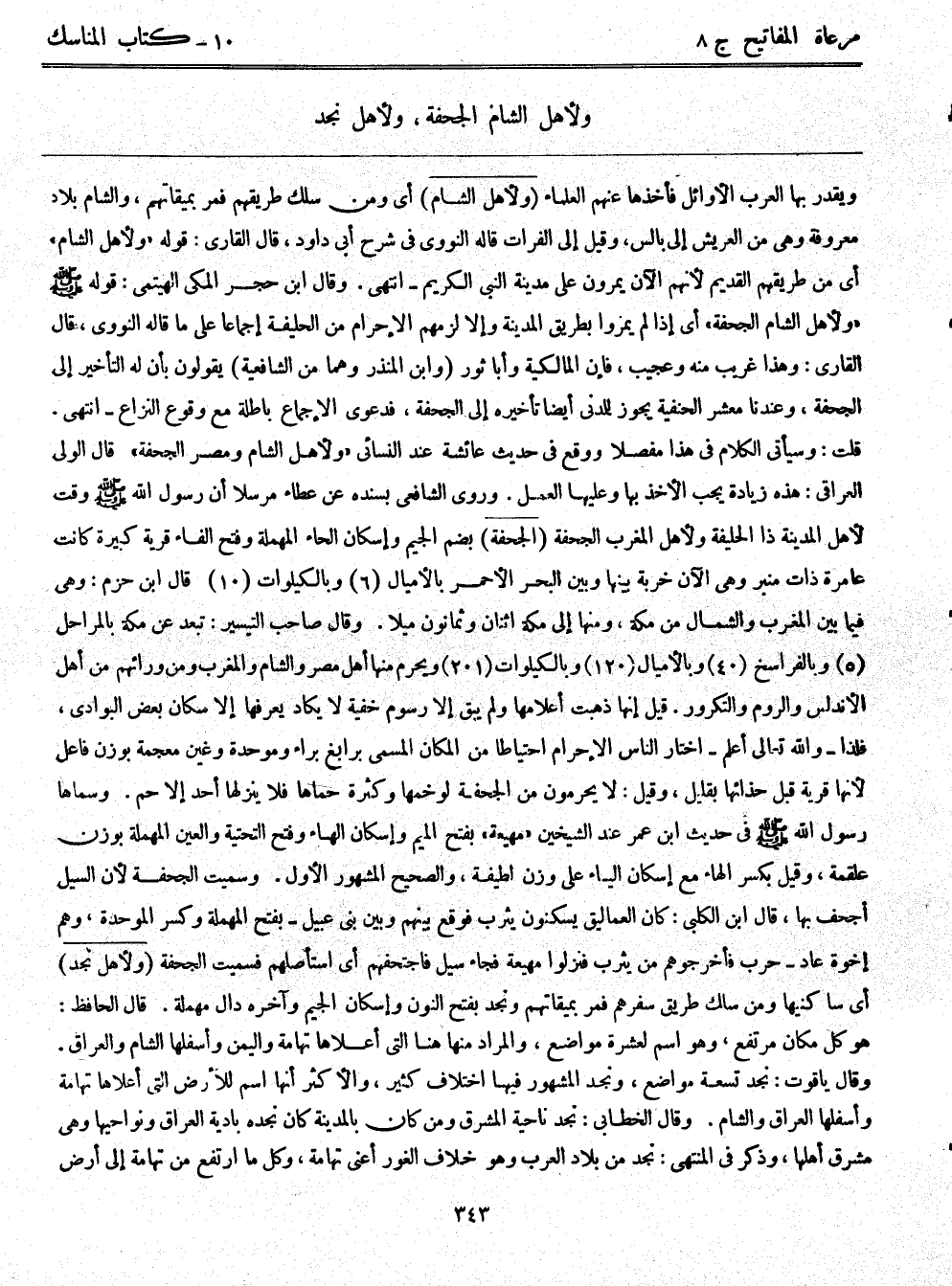ويقدر بها العرب الأوائل فأخذها عنهم العلماء (ولأهل الشام) ، أي ومن سلك طريقهم فمر بميقاتهم، والشام بلاد معروفة وهي من العريش إلى بالس، وقيل إلى الفرات قاله النووي في شرح أبي داود، قال القاري: قوله ((ولأهل الشام)) أي من طريقهم القديم لأنهم الآن يمرون على مدينة النبي الكريم - انتهى. وقال ابن حجر المكي الهيتمي: قوله - صلى الله عليه وسلم -: ((ولأهل الشام الجحفة)) ، أي إذا لم يمروا بطريق المدينة وإلا لزمهم الإحرام من الحليفة إجماعًا على ما قاله النووي، قال القاري: وهذا غريب منه وعجيب، فإن المالكية وأبا ثور (وابن المنذر وهما من الشافعية) يقولون بأن له التأخير إلى الجحفة، وعندنا معشر الحنفية يجوز للمدني أيضًا تأخيره إلى الجحفة، فدعوى الإجماع باطلة مع وقوع النزاع - انتهى. قلت: وسيأتي الكلام في هذا مفصلاً ووقع في حديث عائشة عند النسائي ((ولأهل الشام ومصر الجحفة)) قال الولي العراقي: هذه زيادة يجب الأخذ بها وعليها العمل. وروى الشافعي بسنده عن عطاء مرسلاً أن رسول الله - صلى الله عليه وسلم - وقت لأهل المدينة ذا الحليفة ولأهل المغرب (الجحفة) بضم الجيم وإسكان الحاء المهملة وفتح الفاء قرية كبيرة كانت عامرة ذات منبر وهي الآن خربة بينها وبين البحر الأحمر بالأميال (6) وبالكيلوات (10) قال ابن حزم: وهي فيما بين المغرب والشمال من مكة، ومنها إلى مكة اثنان وثمانون ميلاً. وقال صاحب التيسير: تبعد عن مكة بالمراحل (5) وبالفراسخ (40) وبالأميال (120) وبالكيلوات (201) ويحرم منها أهل مصر والشام والمغرب ومن ورائهم من أهل الأندلس والروم والتكرور. قيل: إنها ذهبت أعلامها ولم يبق إلا رسوم خفية لا يكاد يعرفها إلا سكان بعض البوادي، فلذا - والله تعالى أعلم - اختار الناس الإحرام احتياطًا من المكان المسمى برابغ براء وموحدة وغين معجمة بوزن فاعل لأنها قرية قبل حذائها بقليل، وقيل: لا يحرمون من الجحفة لوخمها وكثرة حماها فلا ينزلها أحد إلا حم. وسماها رسول الله - صلى الله عليه وسلم - في حديث ابن عمر عند الشيخين ((مهيعة)) بفتح الميم وإسكان الهاء وفتح التحتية والعين المهملة بوزن علقمة، وقيل: بكسر الهاء مع إسكان الياء على وزن لطيفة، والصحيح المشهور الأول. وسميت الجحفة لأن السيل أجحف بها، قال ابن الكلبي: كان العماليق يسكنون يثرب فوقع بينهم وبين بني عبيل - بفتح المهملة وكسر الموحدة، وهم إخوة عاد - حرب فأخرجوهم من يثرب فنزلوا مهيعة فجاء سيل فاجتحفهم أي: استأصلهم فسميت الجحفة (ولأهل نجد) أي: ساكنيها ومن سلك طريق سفرهم فمر بمياقتهم. ونجد بفتح النون وإسكان الجيم وآخره دال مهملة. قال الحافظ: هو كل مكان مرتفع، وهو اسم لعشرة مواضع، والمراد منها هنا التي أعلاها تهامة واليمن وأسفلها الشام والعراق. وقال ياقوت: نجد تسعة مواضع، ونجد المشهور فيها اختلاف كثير، والأكثر أنها اسم للأرض التي أعلاها تهامة وأسفلها العراق والشام. وقال الخطابي: نجد ناحية المشرق ومن كان بالمدينة كان نجده بادية العراق ونواحيها وهي مشرق أهلها، وذكر في المنتهى: نجد من بلاد العرب وهو خلاف الغور أعني تهامة، وكل ما ارتفع من تهامة إلى أرض