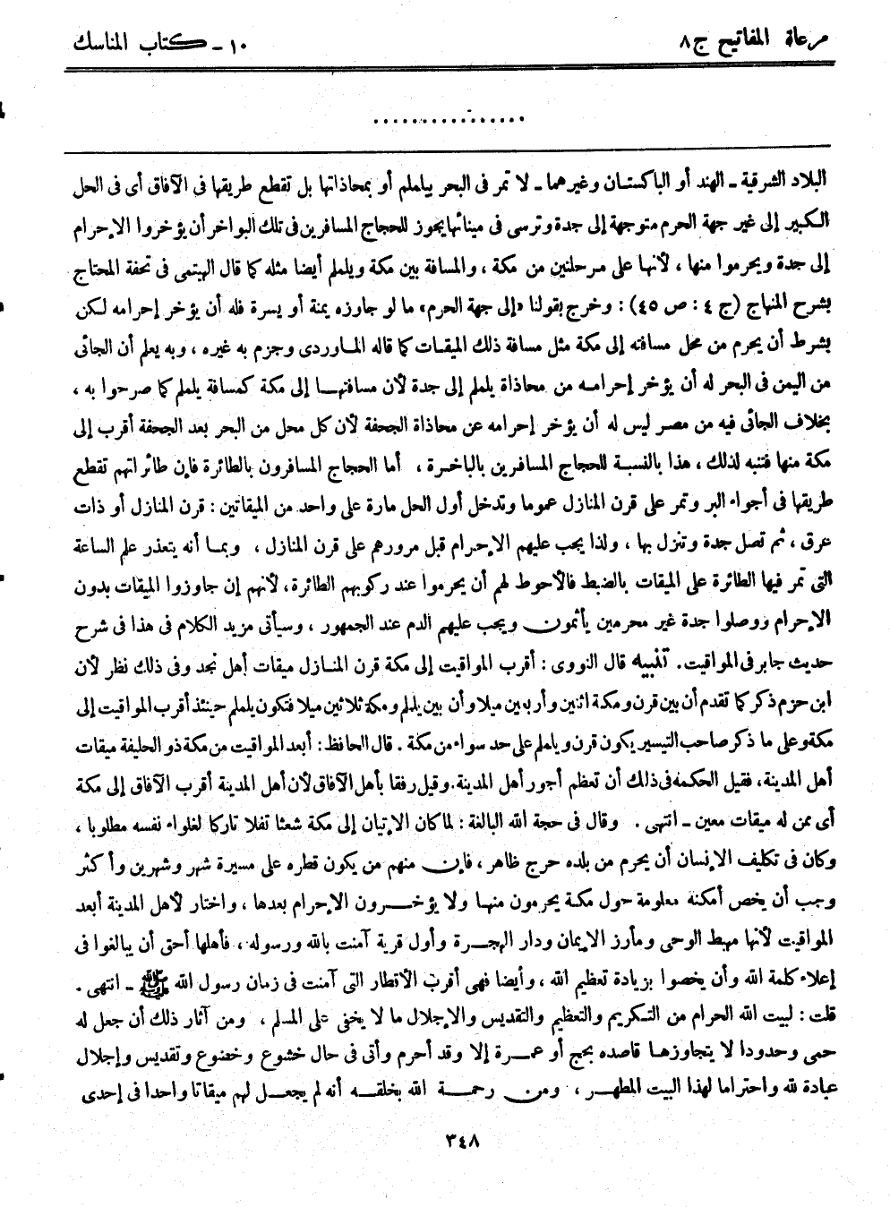 البلاد الشرقية - الهند أو الباكستان وغيرهما - لا تمر في البحر بيلملم أو بمحاذاتها بل تقطع طريقها في الآفاق، أي في الحل الكبير إلى غير جهة الحرم متوجهة إلى جدة وترسي في مينائها يجوز للحجاج المسافرين في تلك البواخر أن يؤخروا الإحرام إلى جدة ويحرموا منها، لأنها على مرحلتين من مكة، والمسافة بين مكة ويلملم أيضًا مثله كما قال الهيتمي في تحفة المحتاج بشرح المنهاج (ج 4 ص 45) : وخرج بقولنا ((إلى جهة الحرم)) ما لو جاوزه يمنة أو يسرة فله أن يؤخر إحرامه لكن بشرط أن يحرم من محل مسافته إلى مكة مثل مسافة ذلك الميقات كما قاله الماوردي وجزم به غيره، وبه يعلم أن الجائي من اليمن في البحر له أن يؤخر إحرامه من محاذاة يلملم إلى جدة لأن مسافتها إلى مكة كمسافة يلملم كما صرحوا به بخلاف الجائي فيه من مصر ليس له أن يؤخر إحرامه عن محاذاة الجحفة لأن كل محل من البحر بعد الجحفة أقرب إلى مكة منها فتنبه لذلك، هذا بالنسبة للحجاج المسافرين بالباخرة، أما الحجاج المسافرون بالطائرة فإن طائراتهم تقطع طريقها في أجواء البر وتمر على قرن المنازل عمومًا وتدخل أول الحل مارة على واحد من الميقاتين: قرن المنازل أو ذات عرق، ثم تصل جدة وتنزل بها، ولذا يجب عليهم الإحرام قبل مرورهم على قرن المنازل، وبما أنه يتعذر علم الساعة التي تمر فيها الطائرة على الميقات بالضبط فالأحوط لهم أن يحرموا عند ركوبهم الطائرة، لأنهم إن جاوزوا الميقات بدون الإحرام ووصلوا جدة غير محرمين يأثمون ويجب عليهم الدم عند الجمهور، وسيأتي مزيد الكلام في هذا في شرح حديث جابر في المواقيت. تنبيه قال النووي: أقرب المواقيت إلى مكة قرن المنازل ميقات أهل نجد وفي ذلك نظر لأن ابن حزم ذكر كما تقدم أن بين قرن ومكة اثنين وأربعين ميلاً وأن بين يلملم ومكة ثلاثين ميلاً فتكون يلملم حينئذ أقرب المواقيت إلى مكة وعلى ما ذكر صاحب التيسير يكون قرن ويلملم على حد سواء من مكة. قال الحافظ: أبعد المواقيت من مكة ذو الحليفة ميقات أهل المدينة، فقيل: الحكمة في ذلك أن تعظم أجور أهل المدينة. وقيل رفقًا بأهل الآفاق لأن أهل المدينة أقرب الآفاق إلى مكة أي: ممن له ميقات معين - انتهى. وقال في حجة الله البالغة: لما كان الإتيان إلى مكة شعثًا تفلاً تاركًا لغلواء نفسه مطلوبًا، وكان في تكليف الإنسان أن يحرم من بلده حرج ظاهر، فإن منهم من يكون قطره على مسيرة شهر وشهرين وأكثر وجب أن يخص أمكنة معلومة حول مكة يحرمون منها ولا يؤخرون الإحرام بعدها، واختار لأهل المدينة أبعد المواقيت لأنها مهبط الوحي ومأرز الإيمان ودار الهجرة وأول قرية آمنت بالله ورسوله، فأهلها أحق أن يبالغوا في إعلاء كلمة الله وأن يخصوا بزيادة تعظيم الله، وأيضًا فهي أقرب الأقطار التي آمنت في زمان رسول الله - صلى الله عليه وسلم - انتهى. قلت: لبيت الله الحرام من التكريم والتعظيم والتقديس والإجلال ما لا يخفى على مسلم، ومن آثار ذلك أن جعل له حمى وحدودًا لا يتجاوزها قاصده بحج أو عمرة إلا وقد أحرم وأتى في حال خشوع وخضوع وتقديس وإجلال عبادة لله واحترامًا لهذا البيت المطهر، ومن رحمة الله بخلقه أنه لم يجعل لهم ميقاتًا واحدًا في إحدى