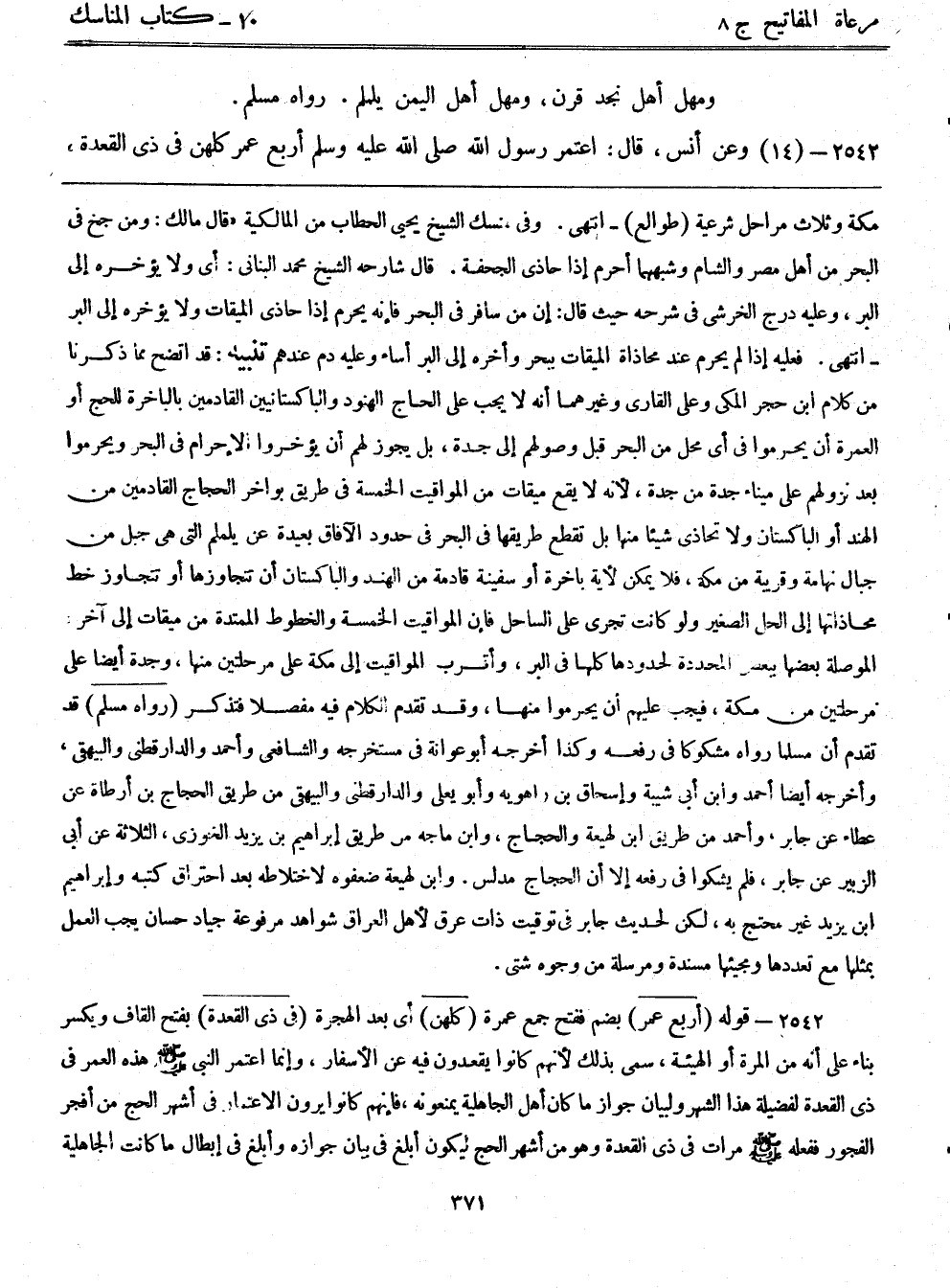 مكة وثلاث مراحل شرعية (طوالع) - انتهى. وفي منسك الشيخ يحيى الحطاب من المالكية ((قال مالك)) : ومن حج في البحر من أهل مصر والشام وشبههما أحرم إذا حاذى الجحفة. قال شارحه الشيخ محمد البناني: أي ولا يؤخره إلى البر، وعليه درج الخرشي في شرحه حيث قال: إن من سافر في البحر فإنه يحرم إذا حاذى الميقات ولا يؤخره إلى البر - انتهى. فعليه إذا لم يحرم عند محاذاة الميقات ببحر وأخره إلى البر أساء وعليه دم عندهم تنبيه: قد اتضح مما ذكرنا من كلام ابن حجر المكي، وعلي القاري وغيرهما أنه لا يجب على الحاج الهنود والباكستانيين القادمين بالباخرة للحج أو العمرة أن يحرموا في أي محل من البحر قبل وصولهم إلى جدة، بل يجوز لهم أن يؤخروا الإحرام في البحر ويحرموا بعد نزولهم على ميناء جدة من جدة، لأنه لا يقع ميقات من المواقيت الخمسة في طريق بواخر الحجاج القادمين من الهند أو الباكستان ولا تحاذي شيئًا منها بل تقطع طريقها في البحر في حدود الآفاق بعيدة عن يلملم التي هي جبل من جبال نهامة وقريبة من مكة، فلا يمكن لأية باخرة أو سفينة قادمة من الهند والباكستان أن تتجاوزها أو تتجاوز خط محاذاتها إلى الحل الصغير ولو كانت تجري على الساحل فإن المواقيت الخمسة والخطوط الممتدة من ميقات إلى آخر الموصلة بعضها ببعض المحددة لحدودها كلها في البر، وأقرب المواقيت إلى مكة على مرحلتين منها، وجدة أيضًا على مرحلتين من مكة، فيجب عليهم أن يحرموا منها، وقد تقدم الكلام فيه مفصلاً فتذكر. (رواه مسلم) ، قد تقدم أن مسلمًا رواه مشكوكًا في رفعه وكذا أخرجه أبو عوانة في مستخرجه، والشافعي، وأحمد، والدارقطني، والبيهقي، وأخرجه أيضًا أحمد، وابن أبي شيبة، وإسحاق بن راهويه، وأبو يعلى والدارقطني، والبيهقي من طريق الحجاج بن أرطاة عن عطاء بن جابر، وأحمد من طريق ابن لهيعة، والحجاج، وابن ماجة من طريق إبراهيم بن يزيد الخوزي، الثلاثة عن أبي الزبير عن جابر، فلم يشكوا في رفعه إلا أن الحجاج مدلس. وابن لهيعة ضعفوه لاختلاطه بعد احتراق كتبه، وإبراهيم ابن يزيد غير محتج به، لكن لحديث جابر في توقيت ذات عرق لأهل العراق شواهد مرفوعة جياد حسان يجب العمل بمثلها مع تعددها ومجيئها مسندة ومرسلة من وجوه شتى.