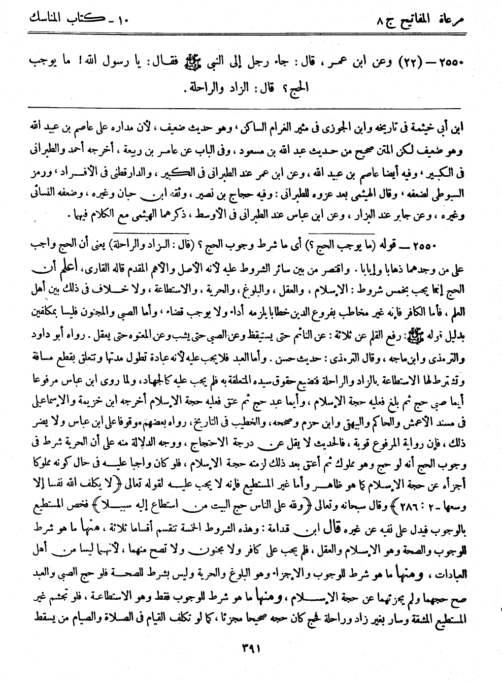 2550- (22) وعن ابن عمر قال: جاء رجل إلى النبي - صلى الله عليه وسلم - فقال: يا رسول الله! ما يوجب الحج؟