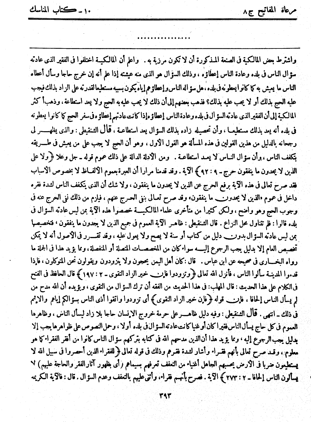 واشترط بعض المالكية في الصنعة المذكورة أن لا تكون مرزية به. واعلم أن المالكية اختلفوا في الفقير الذي عادته سؤال الناس في بلده وعادة الناس إعطاؤه، وذلك السؤال هو الذي منه عيشته إذا علم أنه إن خرج حاجًا وسأل أعطاه الناس ما يعيش به كما كانوا يعطونه في بلده، هل سؤاله الناس وإعطاؤهم إياه يكون بسببه مستطيعًا لقدرته على الزاد بذلك فيجب عليه الحج بذلك أو لا يجب عليه بذلك؟ فذهب بعضهم إلى أن ذلك لا يجب عليه به الحج ولا يعد استطاعة، وذهب أكثر المالكية إلى أن الفقير الذي عادته السؤال في بلده وعادة الناس إعطاؤه إذا كانت عادتهم إعطاؤه في سفر الحج كما كانوا يعطونه في بلده أنه يعد بذلك مستطيعًا، وأن تحصيله زاده بذلك السؤال يعد استطاعة. قال الشنقيطي: والذي يظهر لي رجحانه بالدليل من هذين القولين في هذه المسألة هو: القول الأول، وهو أن الحج لا يجب على من يعيش في طريقه بتكفف الناس، وأن سؤال الناس لا يعد استطاعة. ومن الأدلة الدالة على ذلك عموم قوله جل وعلا: {وَلاَ عَلَى الَّذِينَ لاَ يَجِدُونَ مَا يُنفِقُونَ حَرَجٌ} (9: 92) الآية. وقد قدمنا مرارًا أن العبرة بعموم الألفاظ لا بخصوص الأسباب فقد صرح تعالى في هذه الآية برفع الحرج عن الذين لا يجدون ما ينفقون، ولا شك أن الذي يتكفف الناس لشدة فقره داخل في عموم {الَّذِينَ لاَ يَجِدُونَ مَا يُنفِقُونَ} وقد صرح تعالى بنفي الحرج عنهم، فيلزم من ذلك نفي الحرج عنه في وجوب الحج وهو واضح، ولكن كثيرًا من متأخري علماء المالكية خصصوا هذه الآية بمن ليس عادته السؤال في بلده قالوا: فلم تتناول محل النزاع. قال الشنقيطي: ظاهر الآية العموم في جميع {الَّذِينَ لاَ يَجِدُونَ مَا يُنفِقُونَ} ، فتخصيصها بمن ليس عادته السؤال بدون دليل من كتاب أو سنة لا يصح ولا يعول عليه، وقد تقرر في الأصول أنه لا يمكن تخصيص العام إلا بدليل يجب الرجوع إليه سواء كان من المخصصات المتصلة أو المنفصلة، ومما يؤيد هذا في الجملة ما رواه البخاري في صحيحه عن ابن عباس. قال: كان أهل اليمن يحجون ولا يتزودون ويقولون: نحن المتوكلون، فإذا قدموا المدينة سألوا الناس، فأنزل الله تعالى: {وَتَزَوَّدُواْ فَإِنَّ خَيْرَ الزَّادِ التَّقْوَى} (2: 197) قال الحافظ في الفتح في الكلام على هذا الحديث: قال المهلب: في هذا الحديث من الفقه أن ترك السؤال من التقوى، ويؤيده أن الله مدح من لم يسأل الناس إلحافًا، فإن قوله: {فَإِنَّ خَيْرَ الزَّادِ التَّقْوَى} أي: تزودوا واتقوا أذى الناس بسؤالكم إياهم والإثم في ذلك - انتهى. قال الشنقيطي: وفيه دليل ظاهر على حرمة خروج الإنسان حاجًا بِلا زاد ليسأل الناس، وظاهرها العموم في كل حاج يسأل الناس فقيرًا كان أو غنيًا كانت عادته السؤال في بلده أولاً وحمل النصوص على ظواهرها يجب إلا بدليل يجب الرجوع إليه، ومما يؤيد هذا أن الذين مدحهم الله في كتابه بتركهم سؤال الناس كانوا من أفقر الفقراء كما هو معلوم، وقد صرح تعالى بأنهم فقراء وأشار لشدة فقرهم وذلك في قوله تعالى: {لِلْفُقَرَاء الَّذِينَ أُحصِرُواْ فِي سَبِيلِ اللهِ لاَ يَسْتَطِيعُونَ ضَرْباً فِي الأَرْضِ يَحْسَبُهُمُ الْجَاهِلُ أَغْنِيَاء مِنَ التَّعَفُّفِ تَعْرِفُهُم بِسِيمَاهُمْ} (أي بظهور آثار الفقر والحاجة عليهم) {لاَ يَسْأَلُونَ النَّاسَ إِلْحَافاً} (2: 273) الآية. فصرح بأنهم فقراء، وأثنى عليهم بالتعفف وعدم السؤال. قال: فالآية الكريمة