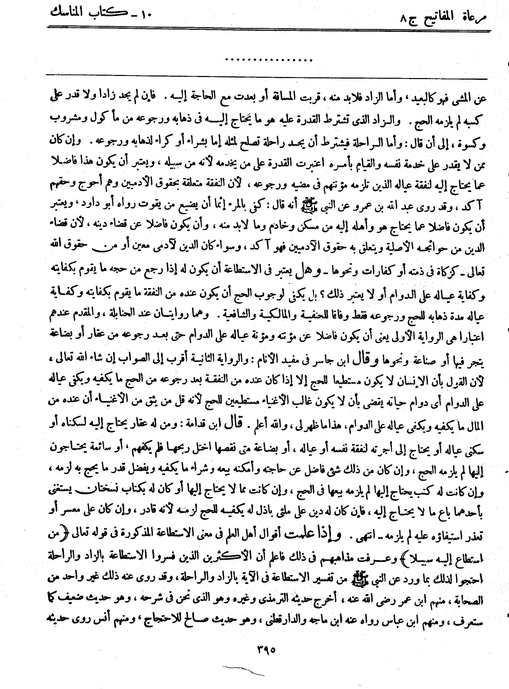 عن المشي فهو كالبعيد، وأما الزاد فلا بد منه، قربت المسافة أو بعدت مع الحاجة إليه. فإن لم يجد زادًا ولا قدر على كسبه لم يلزمه الحج. والزاد الذي تشترط القدرة عليه هو ما يحتاج إليه في ذهابه ورجوعه من مأكول ومشروب وكسوة، إلى أن قال: وأما الراحلة فيشترط أن يجد راحلة تصلح لمثله إما بشراء أو كراء لذهابه ورجوعه. وإن كان ممن لا يقدر على خدمة نفسه والقيام بأمره اعتبرت القدرة على من يخدمه لأنه من سبيله، ويعتبر أن يكون هذا فاضلاً عما يحتاج إليه لنفقة عياله الذين تلزمه مئونتهم في مضيه ورجوعه، لأن النفقة متعلقة بحقوق الآدميين وهم أحوج وحقهم آكد، وقد روى عبد لله بن عمرو عن النبي - صلى الله عليه وسلم - أنه قال: كفى بالمرء إثمًا أن يضيع من يقوت. رواه أبو داود، ويعتبر أن يكون فاضلاً عما يحتاج هو وأهله إليه من مسكن وخادم، وما لا بد منه، وأن يكون فاضلاً عن قضاء دينه، لأن قضاء الدين من حوائجه الأصلية ويتعلق به حقوق الآدميين فهو آكد، وسواء كان الدين لآدمي معين أو من حقوق الله تعالى - كزكاة في ذمته أو كفارات ونحوها - وهل يعتبر في الاستطاعة أن يكون له إذا رجع من حجه ما يقوم بكفايته وكفاية عياله على الدوام أولاً يعتبر ذلك؟ بل يكفي لوجوب الحج أن يكون عنده من النفقة ما يقوم بكفايته وكفاية عياله على الدوام أو لا يعتبر ذلك؟ بل يكفي لوجوب الحج أن يكون عنده من النفقة ما يقوم بكفايته وكفاية عياله مدة ذهابه للحج ورجوعه فقط وفاقًا: للحنفية، والمالكية، والشافعية. وهما روايتان عند الحنابلة، والمقدم عندهم اعتبارًا هي الرواية الأولى يعني: أن يكون فاضلاً عن مئونته ومؤنت عياله على الدوام حتى بعد رجوعه من عقار أو بضاعة يتجر فيها أو صناعة ونحوها. وقال ابن جاسر في مفيد الأنام: والرواية الثانية أقرب إلى الصواب إن شاء الله تعالى، لأن القول بأن الإنسان لا يكون مستطيعًا للحج إلا إذا كان عنده من النفقة بعد رجوعه من الحج ما يكفيه ويكفي عياله على الدوام أي دوام حياته يقضي بأن لا يكون غالب الأغنياء مستطيعين للحج لأنه قل من يثق من الأغنياء أن عنده من المال ما يكفيه ويكفي عياله على الدوام، هذا ما ظهر لي والله أعلم. قال ابن قدامة: ومن له عقار يحتاج إليه لسكناه أو سكنى عياله أو يحتاج إلى أجرته لنفقة نفسه أو عياله، أو بضاعة متى نقصها اختل ربحها فلم يكفيهم، أو سائمة يحتاجون إليها لم يلزمه الحج، وإن كان من ذلك شيء فاضل عن حاجته وأمكنه بيعه وشراء ما يكفيه ويفضل قدر ما يحج به لزمه، وإن كانت له كتب يحتاج إليها لم يلزمه بيعها في الحج، وإن كانت مما لا يحتاج إليها أو كان له بكتاب نسختان يستغني بأحدهما باع ما لا يحتاج إليه، فإن كان له دين على ملئ باذل له يكفيه للحج لزمه لأنه قادر، وإن كان على معسر أو تعذر استيفاؤه عليه لم يلزمه – انتهى. وإذا علمت أقوال أهل العلم ففي معنى الاستطاعة المذكورة في قوله تعالى: {مَنِ اسْتَطَاعَ إِلَيْهِ سَبِيلاً} وعرفت مذاهبهم في ذلك فاعلم أن الأكثرين الذين فسروا الاستطاعة بالزاد والراحلة احتجوا لذلك بما ورد عن النبي - صلى الله عليه وسلم - من تفسير الاستطاعة في الآية بالزاد والراحلة، وقد روى عنه ذلك غير واحد من الصحابة، منهم ابن عمر رضي الله عنه، أخرج حديثه الترمذي وغيره وهو الذي نحن في شرحه، وهو حديث ضعيف كما ستعرف، ومنهم ابن عباس رواه عنه ابن ماجة والدارقطني، وهو حديث صالح للاحتجاج، ومنهم أنس روى حديثه