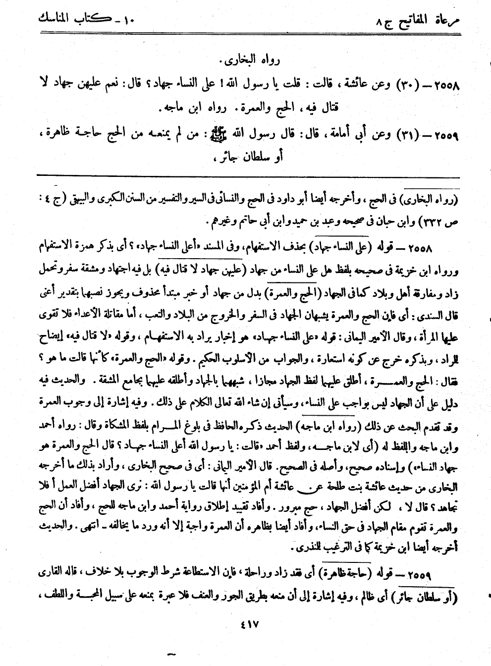 2558- (30) وعن عائشة، قالت: قلت: يا رسول الله! على النساء جهاد؟ قال: نعم عليهن جهاد لا قتال فيه، الحج والعمرة. رواه ابن ماجة.