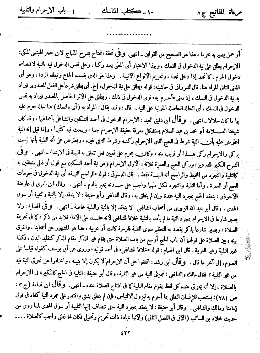 وفى تحفة المحتاج بشرح المنهاج لابن حجر الهيتمى المكي: الإحرام يطلق على نية الدخول في النسك، وبهذا الاعتبار أي المعنى يعد ركنًا، وعلى نفس الدخول فيه بالنية لاقتضاءه دخول الحرم، كأنجد إذا دخل نجدًا، وتحريم الأنواع الآتية. وهذا هو الذي يفسده الجماع وتبطله الردة، وهو أي المعنى الثاني المراد هنا. قال الشرواني في حاشيته: قوله: ((يطلق على نية الدخول)) إلخ. أي يطلق شرعًا على الفعل المصدري فيراد به نية الدخول في النسك، إذ معنى ((أحرم به)) نوى الدخول في ذلك، ويطلق على الأثر الحاصل بالمصدر فيراد به نفس الدخول في النسك، أي الحالة الحاصلة المترتبة على النية. قال: وقد يقال: المراد به (أي بالنسك) هنا حالة حرم عليه بها ما كان حلالاً - انتهى. وقال ابن دقيق العيد: الإحرام الدخول في أحد النسكين والتشاغل بأعمالهما، وقد كان شيخنا العلامة أبو محمد بن عبد السلام يستشكل معرفة حقيقة الإحرام جدًا، ويبحث فيه كثيرًا، وإذا قيل: إنه النية اعترض عليه بأن النية شرط في الحج الذي الإحرام ركنه وشرط الشيء غيره، ويعترض على أنه التلبية بأنها ليست بركن، والإحرام ركن هذا أو قريب منه، وكان يحرم على تعيين فعل تتعلق به النية في الابتداء - انتهى. وفى الشرح الكبير للدردير: وركن الحج والعمرة ثلاثة: الأول: الإحرام وهو: نية أحد النسكين مع قول أو فعل متعلقين به كالتلبية والتجرد من المخيط والراجح أنه النية فقط. قال الدسوقي: قوله ((الراجح النية)) أي نية الدخول في حرمات الحج أو العمرة، وأما التلبية والتجرد فكل منهما واجب على حدته يجبر بالدم - انتهى. وقال ابن العربي في عارضة الأحوذى: ينعقد الحج بمجرد النية عندنا وإن لم ينطق به، وقال الشافعي، وأبو حنيفة: لا ينعقد إلا بالنية والتلبية أو سوق الهدي. وقال أبو عبد الله الزبيري من أصحاب الشافعي: لا ينعقد إلا بالنية والتلبية خاصة - انتهى. وفى الهداية: ولا يصير شارعًا في الإحرام بمجرد النية ما لم يأت بالتلبية خلافًا للشافعي لأنه عقد على الأداء فلابد من ذكر، كما في تحريمه الصلاة، ويصير شارعًا بذكر يقصد به التعظيم سوى التلبية فارسية كانت أو عربية، هذا هو المشهور عن أصحابنا، والفرق بينه وبين الصلاة على قولهما أن باب الحج أوسع من باب الصلاة حتى يقام غير الذكر مقام الذكر كتقليد البدن، فكذا غير التلبية وغير العربية. قال ابن الهمام: قوله ((خلفًا للشافعي)) في أحد قوليه، وروي عن أبى يوسف كقوله قياسًا على الصوم، إلى آخر ما قال. وقال ابن رشد: اتفقوا على أن الإحرام لا يكون إلا بنية، واختلفوا هل تجزئ النية فيه من غير التلبية؟ فقال مالك، والشافعي: تجزئ النية من غير التلبية، وقال أبو حنيفة: التلبية في الحج كالتكبيرة في الإحرام بالصلاة، إلا أنه يجزئ عنده كل لفظ يقوم مقام التلبية كما في افتتاح الصلاة عنده - انتهى. وقال ابن قدامة (ج3: ص281) : يستحب للإنسان النطق بما أحرم به ليزول الالتباس، فإن لم ينطق بشيء واقتصر على مجرد النية كفاه في قول إمامنا ومالك، والشافعي. وقال أبو حنيفة: لا ينعقد بمجرد النية حتى تضاف إليها التلبية أو سوق الهدي لما روي من حديث خلاد بن السائب (الآتي في الفصل الثاني) ولأنها عبادة ذات تحريم وتحليل فكان لها نطق واجب كالصلاة....