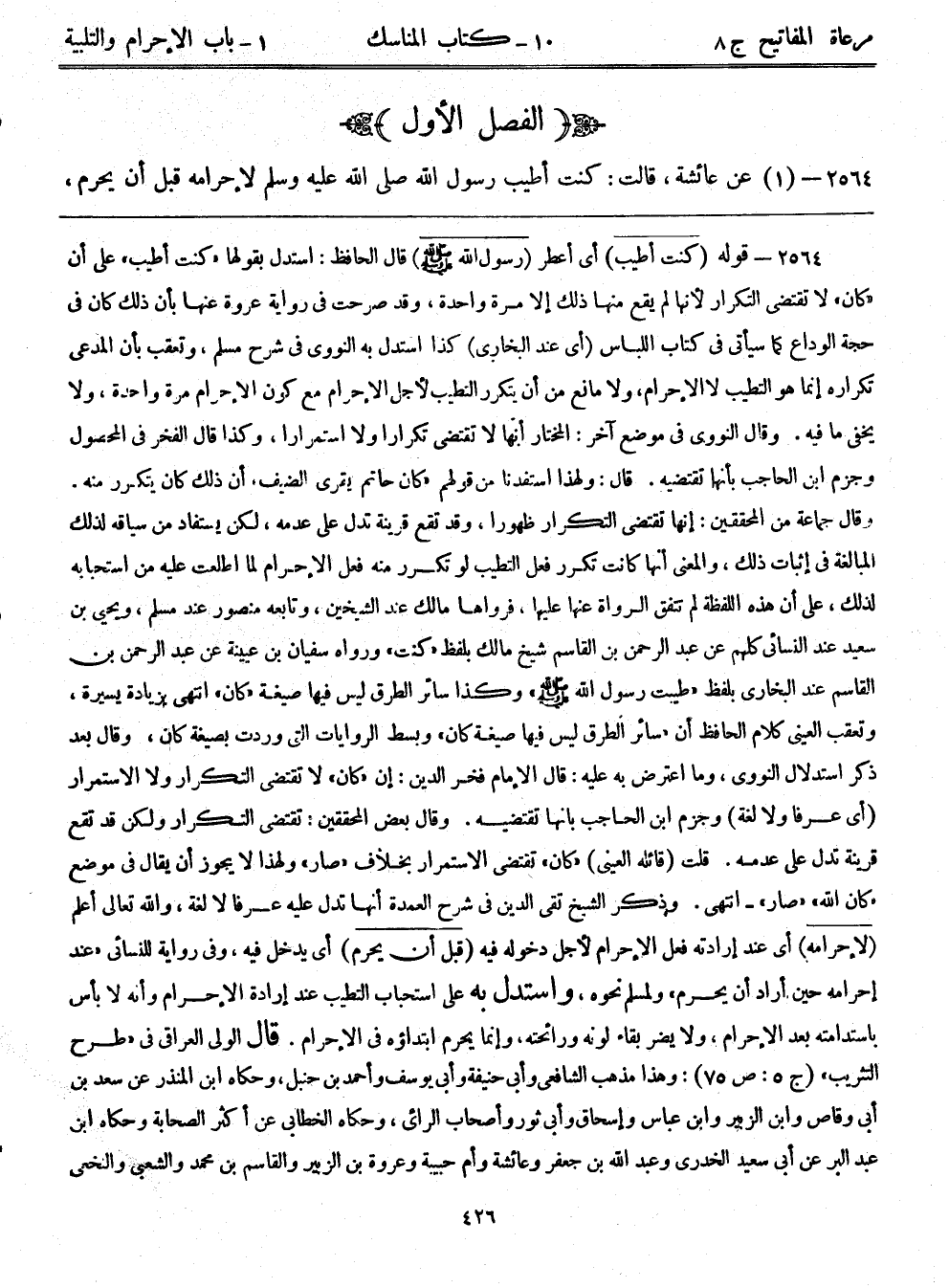 2564- (1) عن عائشة، قالت: كنت أطيب رسول الله - صلى الله عليه وسلم - لإحرامه قبل أن يحرم،