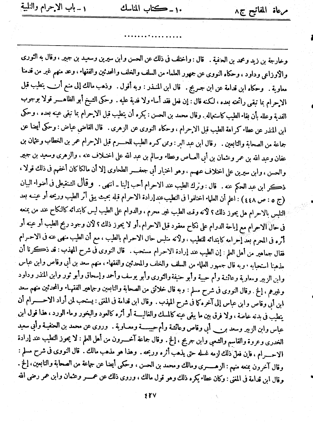 وخارجة بن زيد، ومحمد بن الحنفية. قال: واختلف في ذلك عن الحسن، وابن سيرين، وسعيد بن جبير، وقال به الثوري، والأوزاعي، وداود، وحكاه النووي عن جمهور العلماء من السلف والخلف والمحدثين والفقهاء، وعد منهم غير من قدمنا معاوية. وحكاه ابن قدامة عن ابن جريج. قال ابن المنذر: وبه أقول. وذهب مالك إلى منع أن يتطيب قبل الإحرام بما تبقى رائحته بعده، لكنه قال: إن فعل فقد أساء ولا فدية عليه. وحكى الشيخ أبو الظاهر قولاً بوجوب الفدية وعلله بأن بقاء الطيب كاستعماله، وقال محمد بن الحسن: يكره أن يتطيب قبل الإحرام بما تبقى عينه بعده، وحكى ابن المنذر عن عطاء كراهة التطيب قبل الإحرام، وحكاه النووي عن الزهري. قال القاضي عياض: وحكي أيضاً عن جماعة من الصحابة والتابعين. وقال ابن عبد البر: وممن كره الطيب للمحرم قبل الإحرام عمر بن الخطاب، وعثمان بن عفان، وعبد الله بن عمر، وعثمان بن أبى العاص، وعطاء، وسالم بن عبد الله على اختلاف عنه، والزهري، وسعيد بن جبير والحسن، وابن سيرين على اختلاف عنهم، وهو اختيار أبى جعفر الطحاوي إلا أن مالكًا كان أخفهم في ذلك قولاً، ذكر ابن عبد الحكم عنه قال: وترك الطيب عند الإحرام أحب إلينا - انتهى. وقال الشنقيطي في أضواء البيان (ج5: ص448) : اعلم أن العلماء اختلفوا في التطيب عند إرادة الإحرام قبله بحيث يبقى أثر الطيب وريحه أو عينه بعد التلبس بالإحرام هل يجوز ذلك؟ لأنه وقت الطيب غير محرم، والدوام على الطيب ليس كابتدائه كالنكاح عند من يمنعه في حال الإحرام مع إباحة الدوام على نكاح معقود قبل الإحرام، أو لا يجوز ذلك؟ لأن وجود ريح الطيب أو عينه أو أثره في المحرم بعد إحرامه كابتدائه للتطيب، ولأنه متلبس حال الإحرام بالطيب، مع أن الطيب منهي عنه في الإحرام فقال جماهير من أهل العلم: إن الطيب عند إرادة الإحرام مستحب. قال النووي في شرح المهذب: قد ذكرنا أن مذهبنا استحبابه، وبه قال جمهور العلماء من السلف والخلف والمحدثين والفقهاء، منهم: سعد بن أبى وقاص، وابن عباس، وابن الزبير، ومعاوية، وعائشة، وأم حبيبة، وأبو حنيفة، والثوري، وأبو يوسف، وأحمد وإسحاق، وأبو ثور، وابن المنذر، وداود وغيرهم إلخ. وقال النووي في شرح مسلم: وبه قال خلائق من الصحابة والتابعين وجماهير الفقهاء والمحدثين منهم: سعد بن أبى وقاص، وابن عباس إلى آخره كما في شرح المهذب. وقال ابن قدامة في المغني: يستحب لمن أراد الإحرام أن يتطيب في بدنه خاصة، ولا فرق بين ما يبقى عينه كالمسك والغالية أو أثره كالعود، والبخور، وماء الورد، هذا قول ابن عباس، وابن الزبير، وسعد بن أبى وقاص، وعائشة، وأم حبيبة، ومعاوية. وروى عن محمد بن الحنفية، وأبى سعيد الخدري، وعروة، والقاسم، والشعبي، وابن جريج إلخ. وقال جماعة آخرون من أهل العلم: لا يجوز التطيب عند إرادة الإحرام، فإن فعل ذلك لزمه غسله حتى يذهب أثره وريحه. وهذا هو مذهب مالك. قال النووي في شرح مسلم: وقال آخرون بمنعه منهم: الزهري ومالك ومحمد بن الحسن، وحكي أيضاً عن جماعة من الصحابة والتابعين إلخ. وقال ابن قدامة في المغني: وكان عطاء يكره ذلك وهو قول مالك، وروى ذلك عن عمر، وعثمان، وابن عمر رضي الله