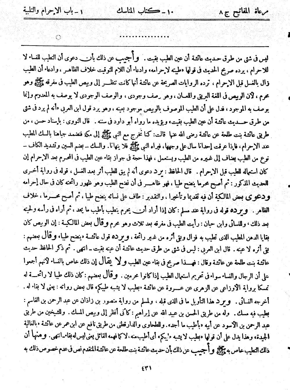ليس في شيء من طرق حديث عائشة أن عين الطيب بقيت. وأجيب عن ذلك بأن دعوى أن التطيب للنساء، يرده صريح الحديث في قولها: ((طيبته لإحرامه)) وادعاء أن اللام للتوقيت خلاف الظاهر، وادعاء أن الطيب زال بالغسل قبل الإحرام، ترده الروايات الصريحة عن عائشة أنها كانت تنظر إلى وبيص الطيب في مفرقه - صلى الله عليه وسلم - وهو محرم، لأن الوبيص في اللغة: البريق، واللمعان، وهو وصف وجودي، والوصف الوجودي لا يوصف به المعدوم وإنما يوصف به الموجود، فدل على أن الطيب الموصوف بالوبيص موجود بعينه، وهو يرد قول ابن العربي: ((أنه لم يرد في شيء من طرق حديث عائشة أن عين الطيب بقيت)) ويؤيده ما رواه أبو داود في سننه. قال النووي: بإسناد حسن، من طريق عائشة بنت طلحة عن عائشة رضي الله عنها قالت: كنا نخرج مع النبي - صلى الله عليه وسلم - إلى مكة فنضمد جباهنا بالمسك المطيب عند الإحرام، فإذا عرقت إحدانا سال علو وجهها، فيراه النبي - صلى الله عليه وسلم - فلا ينهانا. والمسك بضم السين وتشديد الكاف نوع من الطيب يضاف إلى غيره من الطيب ويستعمل، فهذا حجة في جواز بقاء عين الطيب في المحرم بعد الإحرام إن كان استعماله للطيب يضاف إلى غيره من الطيب ويستعمل، فهذا حجة في جواز بقاء عين الطيب في المحرم بعد الإحرام إن كان استعماله للطيب قبل الإحرام. قال الحافظ: يرد دعوى أنه لم يبق للطيب أثر بعد الغسل، قوله في رواية أخرى للحديث المذكور: ثم أصبح محرمًا ينضح طيبًا، فهو ظاهر في أن نضح الطيب وهو ظهور رائحته كان في حال إحرامه ودعوى بعض المالكية أن فيه تقديمًا وتأخيرًا، والتقدير: طاف على نسائه ينضح طيبًا، ثم أصبح محرمًا، خلاف الظاهر. ويرده قوله في رواية عند مسلم: كان إذا أراد أن يحرم يتطيب بأطيب ما يجد، ثم أراه في رأسه ولحيته بعد ذلك، وللنسائي وابن حبان: رأيت الطيب في مفرقه بعد ثلاث وهو محرم وقال بعض المالكية: إن الوبيص كان بقايا الدهن المطيب الذي تطيب به فزال وبقى أثره من غير رائحة، ويرده قول عائشة: ((ينضح طيبًا)) وقال بعضهم: بقى أثره لا عينه. قال ابن العربى: ليس في شتى من طرق حديث عائشة أن عينه بقيت - انتهى. ثم ذكر الحافظ حديث عائشة بنت طلحة عن عائشة وقال: فهذا صريح في بقاء عين الطيب ولا يقال: إن ذلك خاص بالنساء لأنهم أجمعوا على أن الرجال والنساء سواء في تحريم استعمال الطيب إذا كانوا محرمين. وقال بعضهم: كان ذلك طيبًا لا رائحة له تمسكًا برواية الأوزاعي عن الزهري عن عروة عن عائشة: ((بطيب لا يشبه طيبكم)) قال بعض رواته: يعني لا بقاء له. أخرجه النسائي. ويرد هذا التأويل ما في الذي قبله، ولمسلم من رواية منصور بن زاذان عن عبد الرحمن بن القاسم: بطيب فيه مسك. وله من طريق الحسن بن عبيد الله عن إبراهيم: كأني أنظر إلى وبيص المسك. وللشيخين من طريق عبد الرحمن بن الأسود عن أبيه: ((بأطيب ما أجد)) وللطحاوي، والدارقطني من طريق نافع عن ابن عمر عن عائشة: ((بالغالية الجيدة)) وهذا يدل على أن قولها: ((بطيب لا يشبه طيبكم)) أي أطيب منه، لا كما فهمه القائل يعني ليس له بقاء - انتهى. ومنها: أن ذلك التطيب خاص به - صلى الله عليه وسلم - وأجيب عن ذلك بأن حديث عائشة بنت طلحة عن عائشة المتقدم نص في عدم خصوص ذلك به