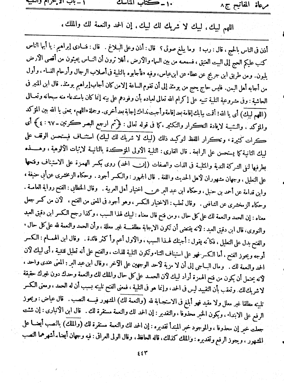 أذن في الناس بالحج، قال: رب! وما يبلغ صوتي؟ قال: أذن وعليّ البلاغ. قال: فنادى إبراهيم: يا أيها الناس كتب عليكم الحج إلى البيت العتيق، فسمعه من بين السماء والأرض، أفلا ترون أن الناس يجيئون من أقصى الأرض يلبون. ومن طريق ابن جريج عن عطاء عن ابن عباس، وفيه: ((فأجابوه بالتلبية في أصلاب الرجال وأرحام النساء)) ، وأول من أجابه أهل اليمن. فليس حاج يحج من يومئذٍ إلى أن تقوم الساعة إلا من كان أجاب إبراهيم يومئذٍ. قال ابن المنير في الحاشية: وفي مشروعيته التلبية تنبيه على إكرام الله تعالى لعباده بأن وفودهم على بيته إنما كان باستدعاء منه سبحانه وتعالى (اللهم لبيك) أي يا الله! أقمت ببابك إقامة بعد إقامة وأجبت نداءك إجابة بعد أخرى. وجملة ((اللهم)) بمعنى يا الله بين المؤكد والمؤكد، والتثنية لإفادة التكرار والتكثير، كما في قوله تعالى: {ثُمَّ ارْجِعِ الْبَصَرَ كَرَّتَيْنِ} (67: 4) أي كرات كثيرة، وتكرار اللفظ لتوكيد ذلك (لبيك لا شريك لبيك) استئناف فيستحسن الوقف على لبيك الثانية كما يستحسن على الرابعة. قال القاري: التلبية الأولى المؤكدة بالثانية لإثبات الألوهية، وهذه بطرفيها لنفي الشركة الندية والمثلية في الذات والصفات (إن الحمد) روى بكسر الهمزة على الاستيناف وفتحها على التعليل، وجهان مشهوران لأهل الحديث واللغة. قال الجمهور: والكسر أجود. وحكاه الزمخشري عن أبى حنيفة، وابن قدامة عن أحمد بن حنبل، وحكاه ابن عبد البر عن اختيار أهل العربية. وقال الخطابي: الفتح رواية العامة. وحكاه الزمخشري عن الشافعي. وقال ثعلب: الاختيار الكسر، وهو أجود في المعنى من الفتح، لأن من كسر جعل معناه: إن الحمد والنعمة لك على كل حال، ومن فتح قال معناه: لبيك لهذا السبب، وكذا رجح الكسر ابن دقيق العيد، والنووي، قال ابن دقيق العيد: لأنه يقتضي أن تكون الإجابة مطلقة غير معللة، وأن الحمد والنعمة لله على كل حال، والفتح يدل على التعليل، فكأنه يقول: أجبتك لهذا السبب، والأول أعم وأكثر فائدة. وقال ابن الهمام: الكسر أوجه ويحوز الفتح، أما الكسر فهو على استيناف الثناء وتكون التلبية للذات، والفتح على أنه تعليل للتلبية، أي لبيك لأن الحمد والنعمة لك. ومال الباجي إلى أن لا مزية لأحد الوجهين على الآخر، وقال ابن عبد البر: المعنى عندي واحد، لأنه يحتمل أن يكون من فتح الهمزة أراد لبيك لأن الحمد على كل حال، والملك لك والنعمة وحدك دون غيرك حقيقة لا شريك لك. وتعقب بأن التقييد ليس في الحمد، وإنما هو في التلبية، فمعنى الفتح تلبيته بسبب أن له الحمد، ومعنى الكسر تلبيته مطلقًا غير معلل ولا مقيد فهو أبلغ في الاستجابة لله (والنعمة لك) المشهور فيه النصب. قال عياض: ويجوز الرفع على الابتداء، ويكون الخبر محذوفًا، والتقدير: إن الحمد لك والنعمة مستقرة لك. قال ابن الأنباري: إن شئت جعلت خبر إن محذوًفا، والموجود خبر المبتدأ تقديره: إن الحمد لك والنعمة مستقرة لك (والملك) بالنصب أيضاً على المشهور، ويجوز الرفع وتقديره: والملك كذلك، قال الحافظ: وقال الولي العراقي: فيه وجهان أيضاً، أشهرهما النصب
