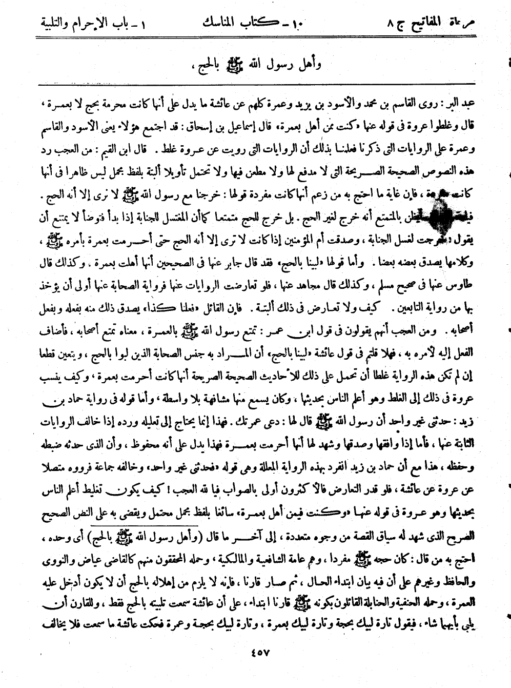 عبد البر: روى القاسم بن محمد والأسود بن يزيد وعمرة كلهم عن عائشة ما يدل على أنها كانت محرمة بحج لا عمرة، قال: وغلطوا عروة في قوله عنها: ((كنت ممن أهل بعمرة)) قال إسماعيل بن إسحاق: قد اجتمع هؤلاء يعني الأسود، والقاسم، وعمرة على الروايات التي ذكرنا فعلمنا بذلك أن الروايات التي رويت عن عروة غلط. قال ابن القيم: من العجب رد هذه النصوص الصحيحة الصريحة التي لا مدفع لها ولا مطعن فيها ولا تحتمل تأويلاً البتة بلفظ مجمل ليس ظاهرًا في أنها كانت مفردة، فإن غاية ما احتج به من زعم أنها كانت مفردة قولها: خرجنا مع رسول الله - صلى الله عليه وسلم - لا نرى إلا أنه الحج. فيا لله العجب أيظن بالمتمتع أنه خرج لغير الحج. بل خرج للحج متمتعًا كما أن المغتسل للجنابة إذا بدأ فتوضأ لا يمتنع أن يقول: خرجت لغسل الجنابة، وصدقت أم المؤمنين إذا كانت لا ترى إلا أنه الحج حتى أحرمت بعمرة بأمره - صلى الله عليه وسلم -، وكلامها يصدق بعضه بعضًا. وأما قولها: ((لبينا بالحج)) فقد قال جابر عنها في الصحيحين: أنها أهلت بعمرة. وكذلك قال طاوس عنها في صحيح مسلم، وكذلك قال مجاهد عنها، فلو تعارضت الروايات عنها فرواية الصحابة عنها أولى أن يأخذ بها من رواية التابعين. كيف ولا تعارض في ذلك البتة. فإن القائل: ((فعلنا كذا)) يصدق ذلك منه بفعله وبفعل أصحابه. ومن العجب أنهم يقولون في قول ابن عمر: تمتع رسول الله - صلى الله عليه وسلم - بالعمرة، معناه تمتع أصحابه، فأضاف الفعل إليه لأمره به، فهلا قلتم في قول عائشة: ((لبينا بالحج)) أن المراد به جنس الصحابة الذين لبوا بالحج، ويتعين قطعًا إن لم تكن هذه الرواية غلطًا أن تحمل على ذلك للأحاديث الصحيحة أنها كانت أحرمت بعمرة، وكيف ينسب عروة في ذلك إلى الغلط وهو أعلم الناس بحديثها، وكان يسمع منها مشافهة بلا واسطة، وأما قوله في رواية حماد بن زيد: حدثني غير واحد أن رسول الله - صلى الله عليه وسلم - قال لها: دعي عمرتك. فهذا إنما يحتج إلى تعليله ورده إذا خالف الروايات الثابتة عنها، فأما إذا وافقها وصدقها وشهد لها أنها أحرمت بعمرة فهذا يدل على أنه محفوظ، وأن الذي حدثه ضبطه وحفظه، هذا مع أن حماد بن زيد انفرد بهذه الرواية المعللة وهي قوله: ((فحدثني غير واحد)) وخالفه جماعة فرووه متصلاً عن عروة عن عائشة، فلو قدر التعارض فالأكثرون أولى بالصواب فيا لله العجب! كيف يكون تغليظ أعلم الناس بحديثها وهو عروة في قوله عنها: ((وكنت فيمن أهل بعمرة)) سائغًا بلفظ مجمل محتمل ويقضي به على النص الصحيح الصريح الذي شهد له سياق القصة من وجوه متعددة، إلى آخر ما قال (وأهل رسول الله - صلى الله عليه وسلم - بالحج) أي وحده، احتج به من قال: كان حجه - صلى الله عليه وسلم - مفردًا، وهم عامة الشافعية، والمالكية، وحمله المحققون منهم: كالقاضي عياض، والنووي، والحافظ وغيرهم على أن فيه بيان ابتداء الحال، ثم صار قارنًا، فإنه لا يلزم من إهلاله بالحج أن لا يكون أدخل عليه العمرة، وحمله الحنفية، والحنابلة القائلون بكونه - صلى الله عليه وسلم - قارنًا ابتداءً، على أن عائشة سمعت تلبيته بالحج فقط، وللقارن أن يلبي بأيهما شاء، فيقول: تارة لبيك بحجة، وتارة لبيك عمرة، وتارة لبيك بحجة وعمرة، فحكت عائشة ما سمعت فلا يخالف