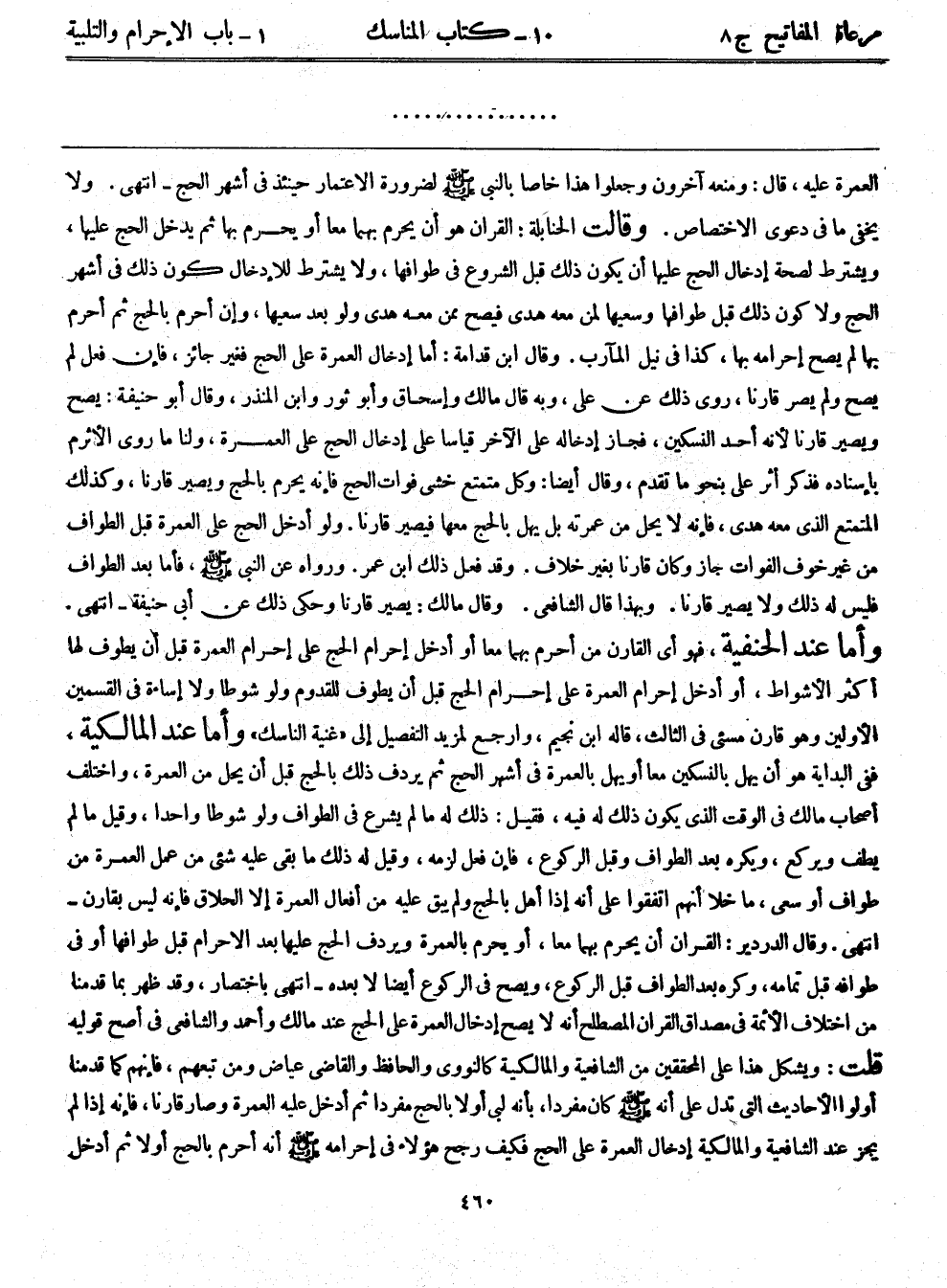 العمرة عليه، قال: ومنعه آخرون وجعلوا هذا خاصًا بالنبي - صلى الله عليه وسلم - لضرورة الاعتمار حينئذٍ في أشهر الحج - انتهى. ولا يخفى في دعوى الاختصاص. وقالت الحنابلة: القران هو أن يحرم بهما معًا أو يحرم بها ثم يدخل الحج عليها، ويشترط لصحة إدخال الحج عليها أن يكون ذلك قبل الشروع في طوافها، ولا يشترط للإدخال كون ذلك في أشهر الحج ولا كون ذلك قبل طوافها وسعيها لمن معه هدي فيصح ممن معه هدي ولو بعد سعيها، وإن أحرم بالحج ثم أحرم بها لم يصح إحرامه بها، كذا في نيل المآرب. وقال ابن قدامة: أما إدخال العمرة على الحج فغير جائز، فإن فعل لم يصح ولم يصر قارنًا، روى ذلك عن علي، وبه قال مالك، وإسحاق، وأبو ثور، وابن المنذر، وقال أبو حنيفة: يصح ويصير قارنًا لأنه أحد النسكين، فجاز على الآخر قياسًا على إدخال الحج على العمرة، ولنا ما روى الأثرم بإسناده فذكر أثر عليّ بنحو ما تقدم، وقال أيضاً: وكل متمتع خشي فوات الحج فإنه يحرم بالحج ويصير قارنًا، وكذلك المتمع الذي معه هدي، فإنه لا يحل من عمرته بل يهل بالحج معها فيصير قارنًا. ولو أدخل الحج على العمرة قبل الطواف من غير خوف الفوات جاز وكان قارنًا بغير خلاف. وقد فعل ذلك ابن عمر. ورواه عن النبي - صلى الله عليه وسلم -، فأما بعد الطواف فليس له ذلك ولا يصير قارنًا. وبهذا قال الشافعي. وقال مالك: يصير قارنًا وحكي ذلك عن أبى حنيفة - انتهى. وأما عند الحنفية، فهو أي القران من أحرم بهما معًا أو أدخل إحرام الحج على إحرام العمرة قبل أن يطوف لها أكثر الأشواط، أو أدخل العمرة على إحرام الحج قبل أن يطوف للقدوم ولو شوطًا ولا إساءة في القسمين الأولين وهو قارن مسيء في الثالث، قاله ابن نجيم، وارجع لمزيد التفصيل إلى ((غنية الناسك)) وأما عند المالكية، ففي البداية هو أن يهل بالنسكين معا أو يهل بالعمرة في أشهر الحج ثم يردف ذلك بالحج قبل أن يحل من العمرة، واختلف أصحاب مالك في الوقت الذي يكون ذلك له فيه، فقيل: ذلك له ما لم يشرع في الطواف ولو شوطًا واحدًا، وقيل ما لم يطف ويركع، ويكره بعد الطواف وقبل الركوع، فإن فعل لزمه، وقيل له ذلك ما بقي عليه شيء من عمل العمرة من طواف أو سعي، ما خلا أنهم اتفقوا على أنه إذا أهل بالحج ولم يبق عليه من أفعال العمرة إلا الحلاق فإنه ليس بقارن - انتهى. وقال الدردير: القران أن يحرم بهما معًا، أو يحرم بالعمرة ويردف الحج عليها بعد الإحرام قبل طوافها أو في طوافه قبل تمامه، وكره بعد الطواف قبل الركوع، ويصح في الركوع أيضاً لا بعده - انتهى باختصار. وقد ظهر بما قدمنا من اختلاف الأئمة في مصداق القران المصطلح أنه لا يصح إدخال العمرة على الحج عند مالك، وأحمد، والشافعي في أصح قوليه قلت: ويشكل هذا على المحققين من الشافعية، والمالكية: كالنووي، والحافظ، والقاضي عياض ومن تبعهم، فإنهم كما قدمنا أولوا الأحاديث التي تدل على أنه - صلى الله عليه وسلم - كان مفردًا، بأنه لبى أولاً بالحج مفردًا ثم أدخل عليه العمرة وصار قارنًا، فإنه إذا لم يجز عند الشافعية والمالكية إدخال العمرة على الحج فكيف رجح هؤلاء في إحرامه - صلى الله عليه وسلم - أنه أحرم بالحج أولاً ثم أدخل