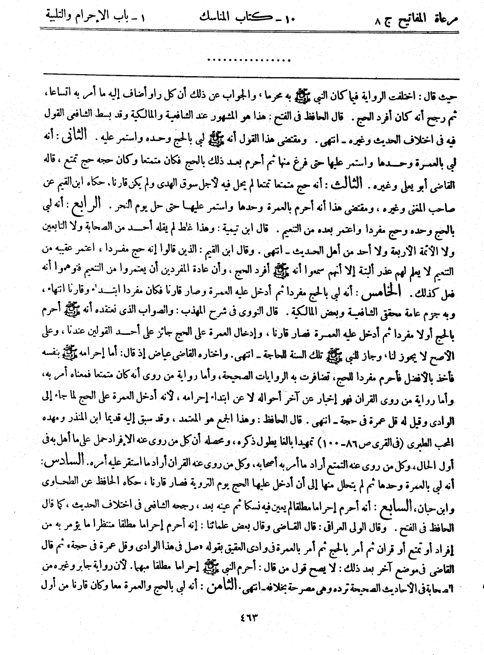 حيث قال: اختلفت الروايات فيما كان النبي - صلى الله عليه وسلم - به محرمًا، والجواب عن ذلك أن كل راو أضاف إليه ما أمر به اتساعًا، ثم رجح أنه كان أفرد الحج. قال الحافظ في الفتح: هذا هو المشهور عند الشافعية والمالكية وقد بسط الشافعي القول فيه في اختلاف الحديث وغيره - انتهى. ومقتضى هذا القول أنه - صلى الله عليه وسلم - لبى بالحج وحده واستمر عليه. الثاني: أنه لبى بالعمرة وحدها واستمر عليها حتى فرغ منها ثم أحرم بعد ذلك بالحج فكان متمتعًا وكان حجه حج تمتع، قاله القاضي أبو يعلى وغيره. الثالث: أنه حج متمتعًا تمتعًا لم يحل فيه لأجل سوق الهدي ولم يكن قارنًا، حكاه ابن القيم عن صاحب المغني وغيره، ومقتضى هذا أنه أحرم بالعمرة وحدها واستمر عليها حتى حل يوم النحر. الرابع: أنه لبى بالحج وحده وحج مفردًا واعتمر بعده من التنعيم. قال ابن تيمية: وهذا غلط لم يقله أحد من الصحابة، ولا التابعين، ولا الأئمة الأربعة، ولا أحد من أهل الحديث - انتهى. وقال ابن القيم: الذين قالوا: إنه حج مفردًا، اعتمر عقيبه من التنعيم لا يعلم لهم عذر ألبته إلا أنهم سمعوا أنه - صلى الله عليه وسلم - أفرد الحج، وأن عادة المفردين أن يعتمروا من التنعيم فتوهموا أنه فعل كذلك. الخامس: أنه لبى بالحج مفردًا ثم أدخل عليه العمرة وصار قارنًا فكان مفردًا ابتداءً وقارنًا انتهاءً، وبه جزم عامة محققي الشافعية وبعض المالكية، قال النووي في شرح المهذب: والصواب الذي نعتقده أنه - صلى الله عليه وسلم - أحرم بالحج أولاً مفردًا ثم أدخل عليه العمرة فصار قارنًا، وإدخال العمرة على الحج جائز على أحد القولين عندنا، وعلى الأصح لا يجوز لنا، وجاز للنبي - صلى الله عليه وسلم - تلك السنة للحاجة - انتهى. واختاره القاضي عياض إذ قال: أما إحرامه - صلى الله عليه وسلم - بنفسه فأخذ بالأفضل فأحرم مفردًا للحج، تضافرت به الروايات الصحيحة، وأما رواية من روى أنه كان متمتعًا فمعناه أمر به، وأما رواية من روى القران فهو إخبار عن آخر أحواله لا عن ابتداء إحرامه، لأنه أدخل العمرة على الحج لما جاء إلى الوادي وقيل له: قل عمرة في حجة - انتهى. قال الحافظ: وهذا الجمع هو المعتمد، وقد سبق إليه قديمًا ابن المنذر، ومهده المحب الطبرى (في القرى ص86 - 100) تمهيدًا بالغًا يطول ذكره، ومحصله أن كل من روي عنه الإفراد حمل على ما أهل به في أول الحال، وكل من روي عنه التمتع أراد ما أمر به أصحابه، وكل من روي عنه القران أراد ما استقر عليه أمره. السادس: أنه لبى بالعمرة وحدها ثم لم يتحلل منها إلى أن أدخل عليها الحج يوم التروية فصار قارنًا، حكاه الحافظ عن الطحاوي، وابن حبان، السابع: أنه أحرم إحرامًا مطلقًا لم يعين فيه نسكًا ثم عينه بعد، رجحه الشافعي في اختلاف الحديث، كما قال الحافظ في الفتح. وقال الولي العراقي: قال القاضي وقال بعض علمائنا: إنه أحرم إحرامًا مطلقًا منتظرًا ما يؤمر به من إفراد، أو تمتع، أو قران، ثم أمر بالحج، ثم أمر بالعمرة في وادي العقيق بقوله: ((صل في هذا الوادي وقل: عمرة في حجة)) ثم قال القاضي في موضع آخر بعد ذلك: لا يصح قول من قال: أحرم النبي - صلى الله عليه وسلم - إحرامًا مبهمًا. لأن رواية جابر وغيره من الصحابة في الأحاديث الصحيحة ترده وهي مصرحة بخلافه - انتهى. الثامن: أنه لبى بالحج والعمرة معًا وكان قارنًا من أول