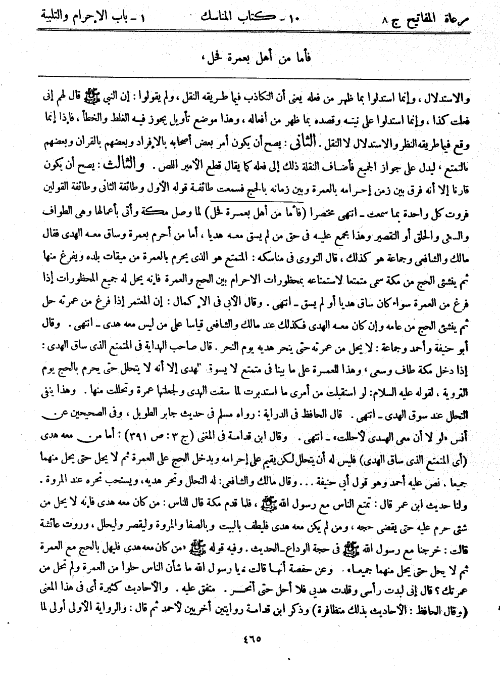والاستدلال، وإنما استدلوا بما ظهر من فعله يعني أن التكاذب فيما طريقه النقل، ولم يقولوا: إن النبي - صلى الله عليه وسلم - قال لهم إني فعلت كذا، وإنما استدلوا على نيته وقصده بما ظهر من أفعاله، وهذا موضع تأويل يجوز فيه الغلط والخطأ، فإذا إنما وقع فيما طريقه النظر والاستدلال لا النقل. الثاني: يصح أن يكون أمر بعض أصحابه بالإفراد وبعضهم بالقران وبعضهم بالتمتع، ليدل على جواز الجميع فأضاف النقلة ذلك إلى فعله كما يقال: قطع الأمير اللص. والثالث: يصح أن يكون قارنًا إلا أنه فرق بين زمن إحرامه بالعمرة وبين زمانه بالحج فسمعت طائفة قوله الأول، وطائفة الثاني، وطائفة القولين، فروت كل واحدة بما سمعت انتهى مختصرًا. (فأما من أهل بعمرة فحل) لما وصل مكة وأتى بأعمالها وهي الطواف والسعي والحلق أو التقصير وهذا مجمع عليه في حق من لم يسق معه هديًا، أما من أحرم بعمرة وساق معه الهدي فقال مالك، والشافعي، وجماعة هو كذلك، قال النووي في مناسكه: المتمتع هو الذي يحرم بالعمرة من ميقات بلده ويفرغ منها ثم ينشئ الحج من مكة سمي متمتعًا لاستمتاعه بمحظورات الإحرام بين الحج والعمرة فإنه يحل له جميع المحظورات إذا فرغ من العمرة سواء كان ساق هاديًا أو لم يسق - انتهى. وقال الأبي في الإكمال: إن المعتمر إذا فرغ من عمرته حل ثم ينشئ الحج من عامه وإن كان معه الهدي، فكذلك عند مالك، والشافعي قياسًا على من ليس معه هدي - انتهى. وقال أبو حنيفة، وأحمد وجماعة: لا يحل من عمرته حتى ينحر هديه يوم النحر. قال صاحب الهداية في المتمتع الذي ساق الهدي: إذا دخل مكة طاف وسعى، وهذا للعمرة على ما بينا في متمتع لا يسوق الهدي إلا أنه لا يتحلل حتى يحرم بالحج يوم التورية، لقوله عليه السلام: لو استقبلت من أمري ما استدبرت لما سقت الهدي ولجعلتها عمرة وتحللت منها. وهذا ينفي التحلل عند سوق الهدي - انتهى. قال الحافظ في الدراية: رواه مسلم في حديث جابر الطويل، وفي الصحيحين عن أنس: ((لولا أن معي الهدى لأحللت)) - انتهى. وقال ابن قدامة في المغني (ج3: 391) : أما من معه هدي (أي المتمتع الذي ساق الهدي) فليس له أن يتحلل لكن يقيم على إحرامه ويدخل الحج على العمرة ثم لا يحل حتى يحل منهما جميعًا، نص عليه أحمد وهو قول أبى حنيفة ... وقال مالك، والشافعي: له التحلل ونحر هديه، ويستحب نحره عند المروة. ولنا حديث ابن عمر قال: تمتع الناس مع رسول الله - صلى الله عليه وسلم -، فلما قدم مكة قال للناس: من كان معه هدي فإنه لا يحل من شيء حرم عليه حتى يقضي حجه، ومن لم يكن معه هدي فليطف بالبيت وبالصفا والمروة وليقصر وليحلل. وروت عائشة قالت: خرجنا مع رسول الله - صلى الله عليه وسلم - في حجة الوداع - الحديث. وفيه قوله - صلى الله عليه وسلم -: ((من كان معه هدي فليهل بالحج مع العمرة ثم لا يحل حتى يحل منهما جميعًا)) وعن حفصة أنها قالت: يا رسول الله ما شأن الناس حلوا من العمرة ولم تحل من عمرتك؟ قال: إني لبدت رأسي وقلدت هدي فلا أحل حتى أنحر. متفق عليه. والأحاديث كثيرة أي في هذا المعنى. (وقال الحافظ: الأحاديث بذلك متضافرة) وذكر ابن قدامة روايتين أخريين لأحمد ثم قال: والرواية الأولى أولى لما