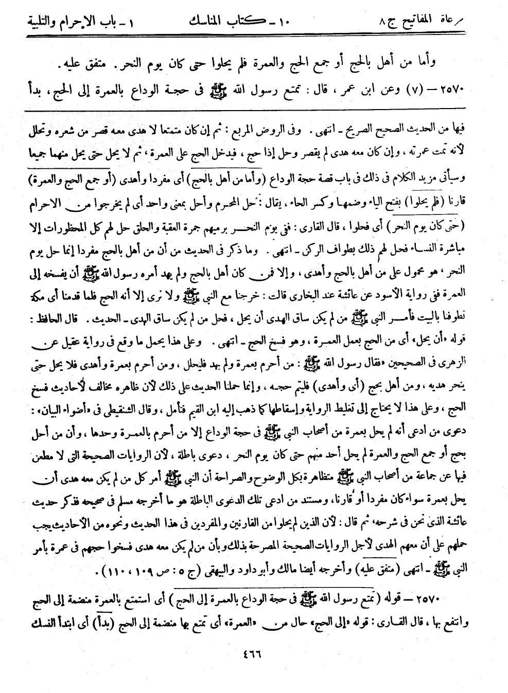 2570- (7) وعن ابن عمر، قال: تمتع رسول الله - صلى الله عليه وسلم - في حجة الوداع بالعمرة إلى الحج، بدأ