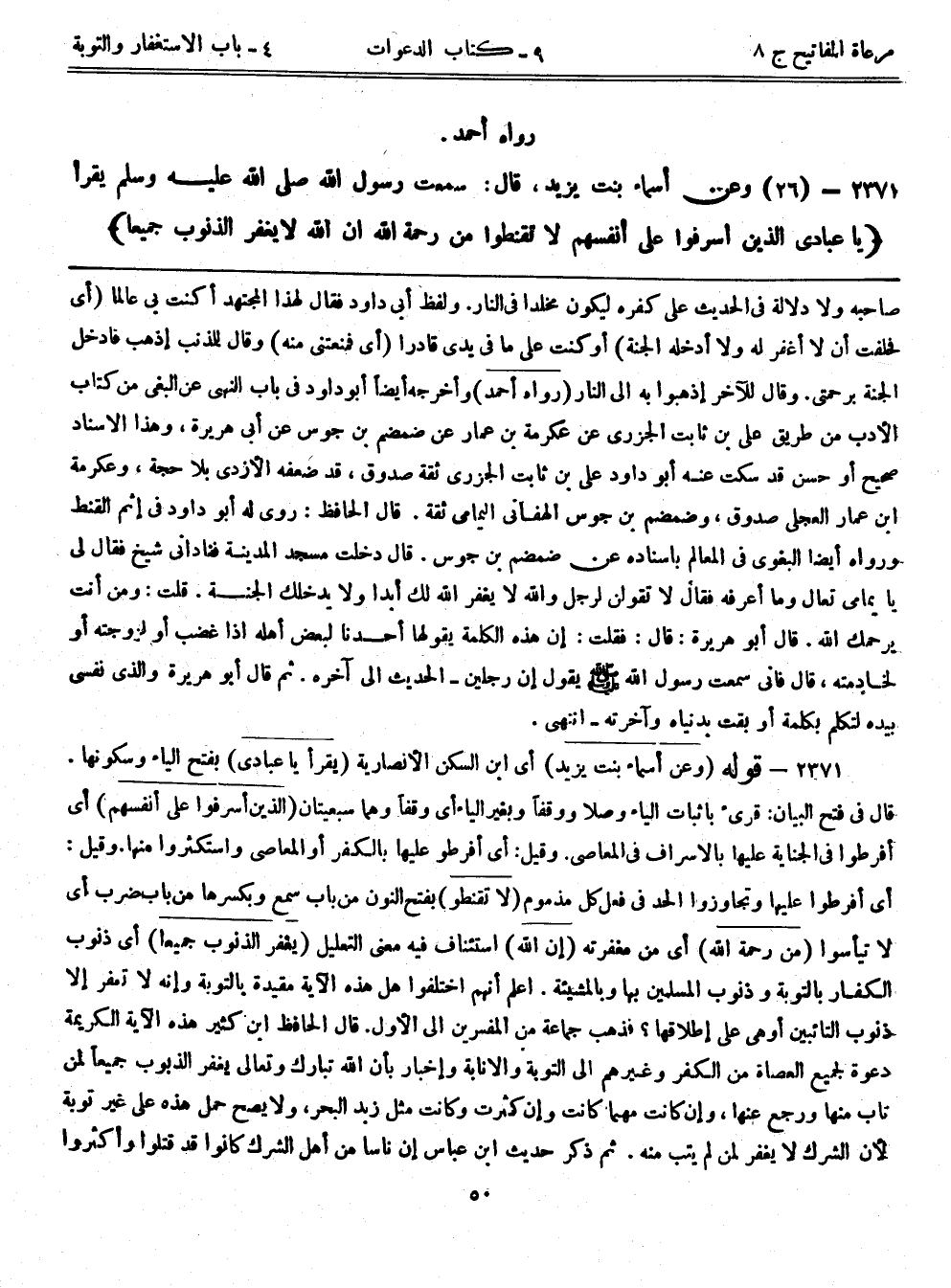 2371- (26) وعن أسماء بنت يزيد، قالت سمعت رَسُولُ اللَّهِ صَلَّى اللَّهُ عَلَيْهِ وَسَلَّمَ: يقرأ: {يَا عِبَادِيَ الَّذِينَ أَسْرَفُوا عَلَى أَنْفُسِهِمْ لا تَقْنَطُوا مِنْ رَحْمَةِ اللَّهِ إِنَّ اللَّهَ يَغْفِرُ الذُّنُوبَ جَمِيعًا}