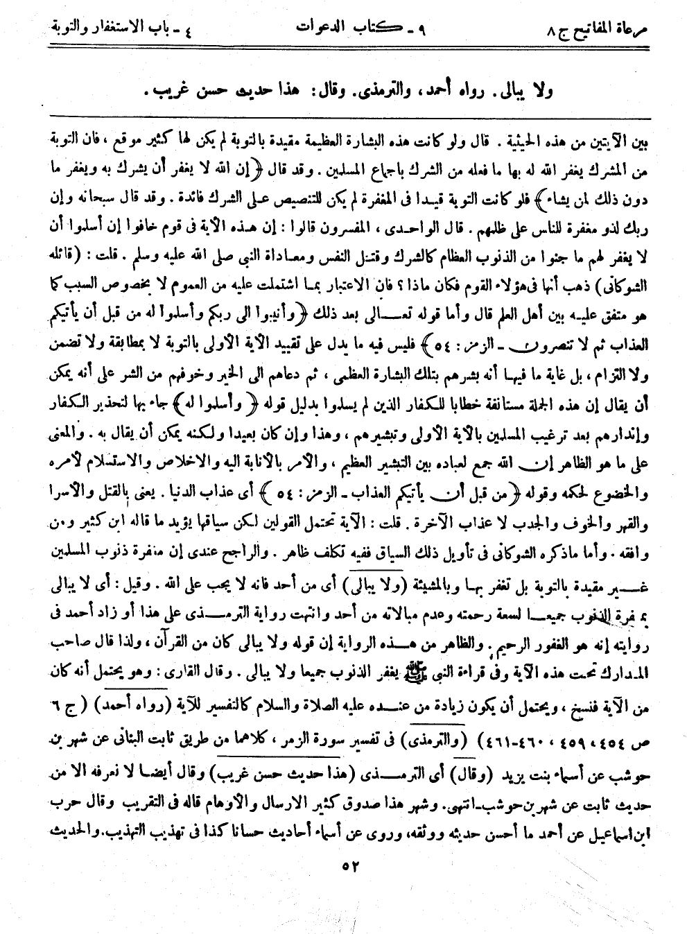 بين الآيتين من هذه الحيثية. قال ولو كانت هذه البشارة العظيمة مقيدة بالتوبة لم يكن لها كثير موقع، فإن التوبة من المشرك يغفر الله له بها ما فعله من الشرك بإجماع المسلمين. وقد قال: {إِنَّ اللهَ لاَ يَغْفِرُ أَن يُشْرَكَ بِهِ وَيَغْفِرُ مَا دُونَ ذَلِكَ لِمَن يَشَاءُ} فلو كانت التوبة قيدًا في المغفرة لم يكن للتنصيص على الشرك فائدة. وقد قال سبحانه وإن ربك لذو مغفرة للناس على ظلمهم. قال الواحدي: المفسرون قالوا: إن هذه الآية في قوم خافوا إن أسلموا أن لا يغفر لهم ما جنوا من الذنوب العظام كالشرك وقتل النفس ومعاداة النبي - صلى الله عليه وسلم -. قلت: (قائله الشوكاني ذهب أنها في هؤلاء القوم فكان ماذا؟ فإن الاعتبار بما اشتملت عليه من العموم لا بخصوص السبب كما هو متفق عليه بين أهل العلم قال وأما قوله تعالى بعد ذلك {وَأَنِيبُوا إِلَى رَبِّكُمْ وَأَسْلِمُوا لَهُ مِن قَبْلِ أَن يَأْتِيَكُمُ الْعَذَابُ ثُمَّ لَا تُنصَرُونَ} (الزمر: 54) فليس فيه ما يدل على تقييد الآية الأولى بالتوبة لا بمطابقة ولا تضمن ولا التزام، بل غاية ما فيها أنه بشرهم بتلك البشارة العظمى، ثم دعاهم إلى الخير وخوفهم من الشر على أنه يمكن أن يقال إن هذه الجملة مستأنفة خطابًا للكفار الذين لم يسلموا بدليل قوله: {وَأَسْلِمُوا لَهُ} جاء بها لتحذير الكفار وإنذارهم بعد ترغيب المسلمين بالآية الأولى وتبشيرهم، وهذا وإن كان بعيدًا ولكنه يمكن أن يقال به. والمعنى على ما هو الظاهر إن الله جمع لعباده بين التبشير العظيم والأمر بالإنابة إليه والإخلاص والاستسلام لأمره والخضوع لحكمه وقوله: {مِن قَبْلِ أَن يَأْتِيَكُمُ الْعَذَابُ} (الزمر: 54) أي: عذاب الدنيا. يعني بالقتل والأسر والقهر والخوف والجدب لا عذاب الآخرة. قلت: الآية تحتمل القولين لكن سياقها يؤيد ما قاله ابن كثير ومن وافقه. وأما ما ذكره الشوكاني في تأويل ذلك السياق ففيه تكلف ظاهر. والراجح عندي إن مغفرة ذنوب المسلمين غير مقيدة بالتوبة بل تغفر بها وبالمشيئة (ولا يبالي) أي: من أحد فإنه لا يجب على الله. وقيل: أي: لا يبالي بمغفرة الذنوب جميعًا لسعة رحمته وعدم مبالاته من أحد وانتهت رواية الترمذي على هذا أو زاد أحمد في روايته إنه هو الغفور الرحيم. والظاهر من هذه الرواية إن قوله ولا يبالي. كان من القرآن، ولذا قال صاحب المدارك تحت هذه الآية: وفي قراءة النبي - صلى الله عليه وسلم - يغفر الذنوب جميعًا ولا يبالي. وقال القاري: وهو يحتمل أنه كان من الآية فنسخ، ويحتمل أن يكون زيادة من عنده عليه الصلاة والسلام كالتفسير للآية (رواه أحمد) (ج6: ص454: 459، 460، 461) ، (والترمذي) في تفسير سورة الزمر، كلاهما من طريق ثابت البناني عن شهر بن حوشب عن أسماء بنت يزيد (وقال) أي: الترمذي (هذا حديث حسن غريب) وقال أيضًا: لا نعرفه إلا من حديث ثابت عن شهر بن حوشب - انتهى. وشهر هذا صدوق كثير الإرسال والأوهام قاله في التقريب وقال حرب بن إسماعيل عن أحمد ما أحسن حديثه ووثقه وروى عن أسماء أحاديث حسانًا كذا في تهذيب التهذيب. والحديث