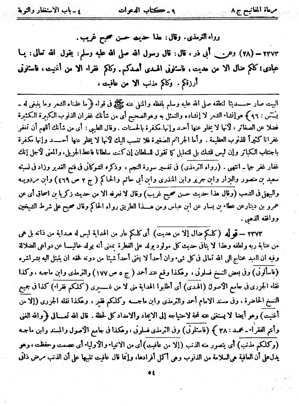 2373- (28) وعَنْ أَبِي ذر، قال: قال رَسُول الله صَلَّى اللهُ عَلَيْهِ وَسَلَّمَ: يَقُولُ الله تعالى: يا عبادي كلكم ضال إلا من هديت، فاسئلوني الهدى أهدكم. وكلكم فقراء إلا من أغنيت، فاسئلوني أرزقكم. وكلكم مذنب إلا من عافيت،