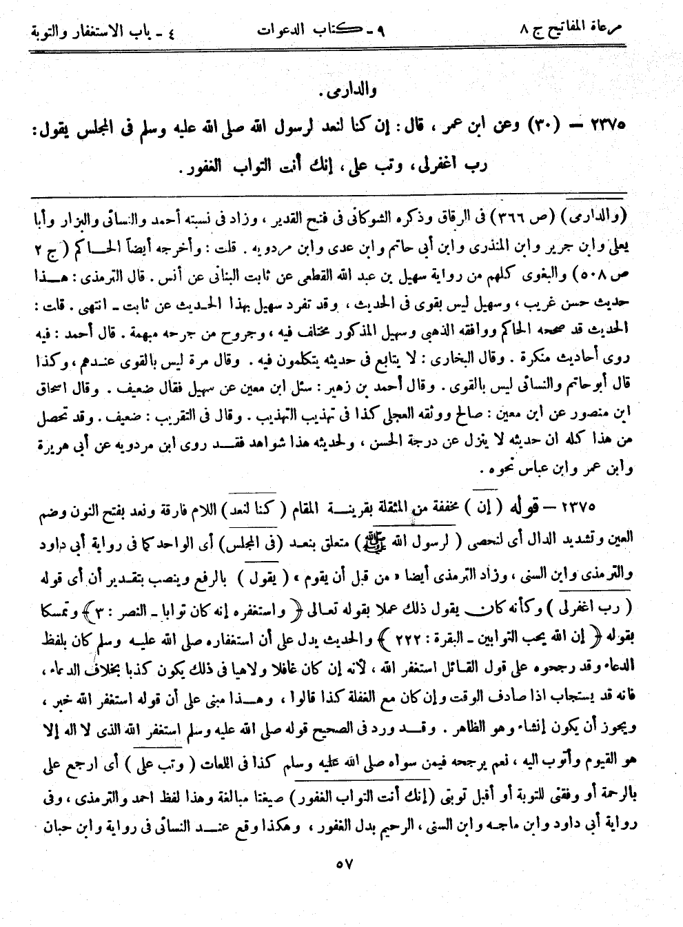 2375- (30) وعن ابن عمر، قال: إن كنا لنعد لرسول الله صلى الله عليه وسلم في المجلس يقول: رب اغفر لي، وتب عليَّ، إنك أنت التواب الغفور.