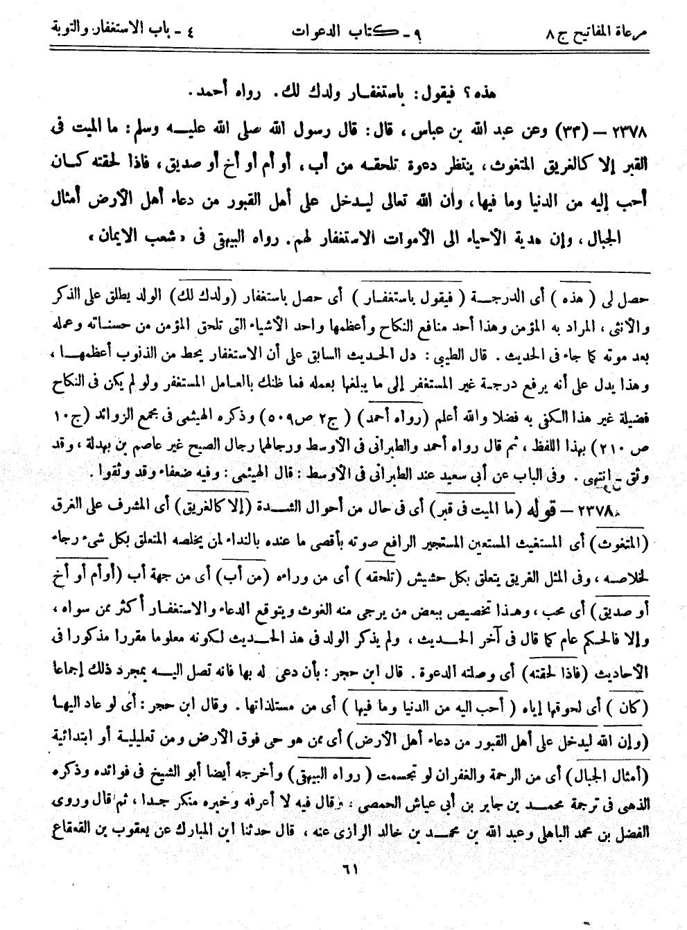 2378- قوله: (ما الميت في قبر) أي: في حال من أحوال الشدة (إلا كالغريق) أي المشرف على الغرق (المتغوث) أي المستغيث المستعين المستجير الرافع صوته بأقصى ما عنده بالنداء لمن يخلصه المتعلق بكل شيء رجاءً لخلاصه، وفي المثل الغريق يتعلق بكل حشيش (تلحقه) أي من وراءه (من أب) أي من جهة أب (أو أم أو أخ أو صديق) أي محب وهذا تخصيص ببعض من يرجى منه الغوث ويتوقع الدعاء والاستغفار أكثر ممن سواه، وإلا فالحكم عام كما قال في آخر الحديث، ولم يذكر الولد في هذا الحديث لكونه معلومًا مقررًا مذكورًا في الأحاديث (فإذا لحقته) أي وصلته الدعوة. قال ابن حجر: بأن دعى له بها فإنه تصل إليه بمجرد ذلك إجماعًا (كان) أي لحوقها إياه (أحب إليه من الدنيا وما فيها) أي من مستلذاتها. وقال ابن حجر: أي: لو عاد إليها (وإن الله ليدخل على أهل القبور من دعاء أهل الأرض) أي: ممن هو حي فوق الأرض ومن تعليلية أو ابتدائية (أمثال الجبال) أي: من الرحمة والغفران لو تجسمت (رواه البيهقي) ، وأخرجه أيضًا أبو الشيخ في فوائده وذكره الذهبي في ترجمة محمد بن جابر بن أبي عياش الحمصي، وقال فيه: لا أعرفه وخبره منكر جدًا، ثم قال وروى الفضل بن محمد الباهلي وعبد الله بن محمد بن خالد الرازي عنه، قال حدثنا ابن المبارك عن يعقوب بن القعقاع