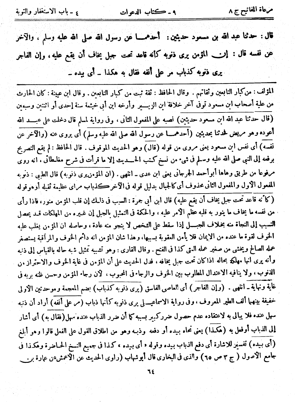 المؤلف: من كبار التابعين وثقاتهم. وقال الحافظ: ثقة ثبت من كبار التابعين. وقال ابن عيينة: كان الحارث من علية أصحاب ابن مسعود توفى آخر خلافة ابن الزبير وأرخه ابن أبي خيثمة سنة إحدى أو اثنتين وسبعين. (قال: حدثنا عبد الله بن مسعود حديثين) نصبه على المفعول الثاني، وفي رواية لمسلم قال: دخلت على عبد الله أعوده وهو مريض فحدثنا بحديثين (أحدهما عن رسول الله - صلى الله عليه وسلم -) أي: يروى عنه (والآخر عن نفسه) أي: نفس ابن مسعود يعني مروي من قوله (قال) وهو الحديث الموقوف. قال الحافظ: لم يقع التصريح برفعه إلى النبي - صلى الله عليه وسلم - في شيء من نسخ كتب الحديث إلا ما قرأت في شرح مغلطائي، إنه روي مرفوعًا من طريق وهاها أبو أحمد الجرحاني يعني ابن عدي - انتهى. (أن المؤمن يرى ذنوبه) قال الطيبي: ذنوبه المفعول الأول والمفعول الثاني محذوف أي كالجبال بدليل قوله في الآخر: كذباب مراى عظيمة ثقيله أو هو قوله: (كأنه قاعد تحت جبل يخاف أن يقع عليه) قال ابن أبي جمرة: السبب في ذلك إن قلب المؤمن منور، فإذا رأى من نفسه ما يخاف ما ينور به قلبه عظم الأمر عليه، والحكمة في التمثيل بالجبل إن غيره من المهلكات قد يحصل النسبب إلى النجاة منه بخلاف الجبل إذا سقط على الشخص لا ينجو منه عادة، وحاصله أن المؤمن يغلب عليه الخوف لقوة ما عنده من الإيمان فلا يأمن العقوبة بسببها، وهذا شأن المؤمن أنه دائم الخوف والمراقبة يستصغر عمله الصالح ويخشى من صغير عمله السيئ كذا في الفتح. وقال القاري: وهو تشبيه تمثيل شبه حاله بالقياس إلى ذنبه وأنه يرى أنها مهلكة بحاله إذا كان تحت جبل يخافه، فدل الحديث على أن المؤمن في غاية الخوف والاحتراز من الذنوب، ولا ينافيه الاعتدال المطلوب بين الخوف والرجاء في المحبوب، لأن رجاء المؤمن وحسن ظنه بربه في غاية ونهاية - انتهى. (وإن الفاجر) أي: العاصي الفاسق (يرى ذنوبه كذباب) بضم المعجمة وموحدتين الأولى خفيفة بينهما ألف الطير المعروف، وفي رواية الإسماعيلي يرى ذنوبه كأنها ذباب (مر على أنفه) أراد أن ذنبه سهل عنده فلا يبالي به لاعتقاده عدم حصول ضرر كبير بسببه كما أن ضرر الذباب عنده سهل (فقال به) أي: أشار إلى الذباب أو فعل به (هكذا) يعني نحاه بيده أو دفعه وذبه وهو من إطلاق القول على الفعل قالوا: وهو أبلغ (أي: بيده) تفسير للإشارة أي دفع الذباب بيده. وقوله: ((أي: بيده)) كذا في جميع النسخ الحاضرة وهكذا في جامع الأصول (ج3: ص65) والذي في البخاري قال أبو شهاب (راوي الحديث عن الأعمش عن عمارة بن