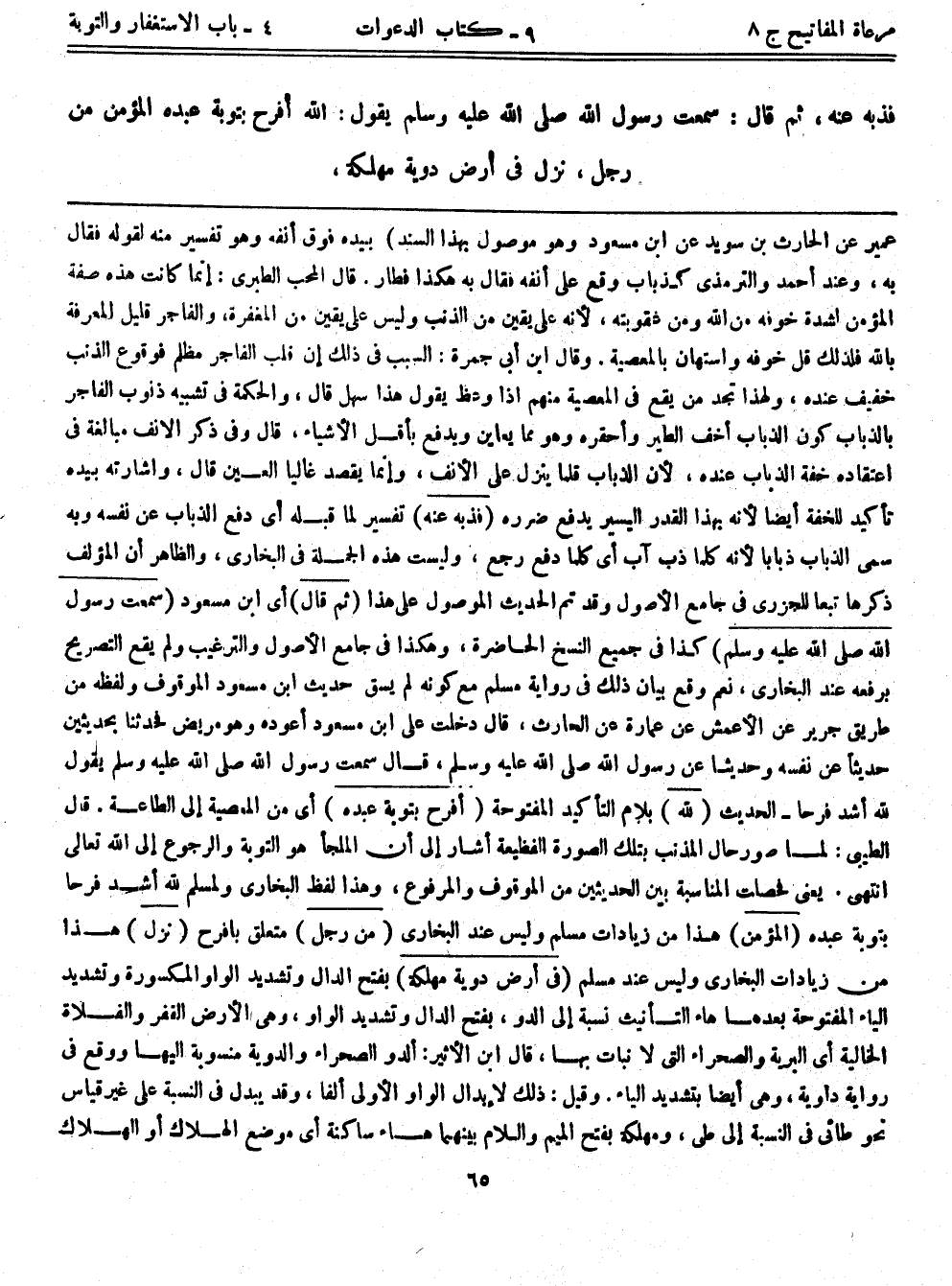 عمير عن الحارث بن سويد عن ابن مسعود وهو موصول بهذا السند) بيده فوق أنفه وهو تفسير منه لقوله فقال به، وعند أحمد، والترمذي كذباب وقع على أنفه فقال به هكذا فطار. قال المحب الطبري: إنما كانت هذه صفة المؤمن لشدة خوفه من الله ومن عقوبته، لأنه على يقين من الذنب وليس على يقين من المغفرة، والفاجر قليل المعرفة بالله فلذلك قل خوفه واستهان بالمعصية. وقال ابن أبي جمرة: السبب في ذلك إن قلب الفاجر مظلم فوقوع الذنب خفيف عنده، ولهذا تجد من يقع في المعصية منهم إذا وعظ يقول هذا سهل قال: والحكمة في تشبيه ذنوب الفاجر بالذباب كون الذباب أخف الطير وأحقره وهو مما يعاين ويدفع بأقل الأشياء، قال: وفي ذكر الأنف مبالغة في اعتقاده خفة الذباب عنده، لأن الذباب قلما ينزل على الأنف، وإنما يقصد غاليًا العين قال: وإشارته بيده تأكيد للخفة أيضًا لأنه بهذا القدر اليسير يدفع ضرره (فذبه عنه) تفسير لما قبله أي: دفع الذباب عن نفسه وبه سمي الذباب ذبابًا لأنه كلما ذب آب أي: كلما دفع رجع، وليست هذه الجملة في البخاري. والظاهر أن المؤلف ذكرها تبعًا للجزري في جامع الأصول وقد تم الحديث الموصول على هذا (ثم قال) أي: ابن مسعود (سمعت رسول الله - صلى الله عليه وسلم -) كذا في جميع النسخ الحاضرة، وهكذا في جامع الأصول والترغيب ولم يقع التصريح برفعه عند البخاري، نعم وقع بيان ذلك في رواية مسلم مع كونه لم يسق حديث ابن مسعود الموقوف ولفظه من طريق جرير عن الأعمش عن عمارة عن الحارث، قال: دخلت على ابن مسعود أعوده وهو مريض فحدثنا بحديثين حديثًا عن نفسه وحديثًا عن رسول الله - صلى الله عليه وسلم -، قال: سمعت رسول الله - صلى الله عليه وسلم - يقول: لله أشد فرحًا - الحديث (لله) بلام التأكيد المفتوحة (أفرح بتوبة عبده) أي: من المعصية إلى الطاعة. قال الطيبي: لما صور حال المذنب بتلك الصورة الفظيعة أشار إلى أن الملجأ هو التوبة والرجوع إلى الله تعالى انتهى. يعني فحصلت المناسبة بين الحديثين من الموقوف والمرفوع، وهذا لفظ البخاري، ولمسلم: لله أشد فرحًا بتوبة عبده (المؤمن) . هذا من زيادات مسلم وليس عند البخاري (من رجل) متعلق بأفرح (نزل) هذا من زيادات البخاري وليس مسلم وليس عند مسلم (في أرض دوية مهلكة) بفتح الدال وتشديد الواو المكسورة وتشديد الياء المفتوحة بعدها هاء التأنيث نسبة إلى الدو، بفتح الدال وتشديد الواو، وهي الأرض الفقر والفلاة الخالية أي البرية والصحراء التي لا نبات بها، قال ابن الأثير: ألدو الصحراء، والدوية منسوبة إليها ووقع في رواية داويّة، وهي أيضًا بتشديد الياء. وقيل: ذلك لإبدال الواو الأولى ألفًا، وقد يبدل في النسبة على غير قياس نحو طائي في النسبة إلى طي، ومهلكة بفتح الميم واللام بينهما هاء ساكنة أي موضع الهلاك أو الهلاك