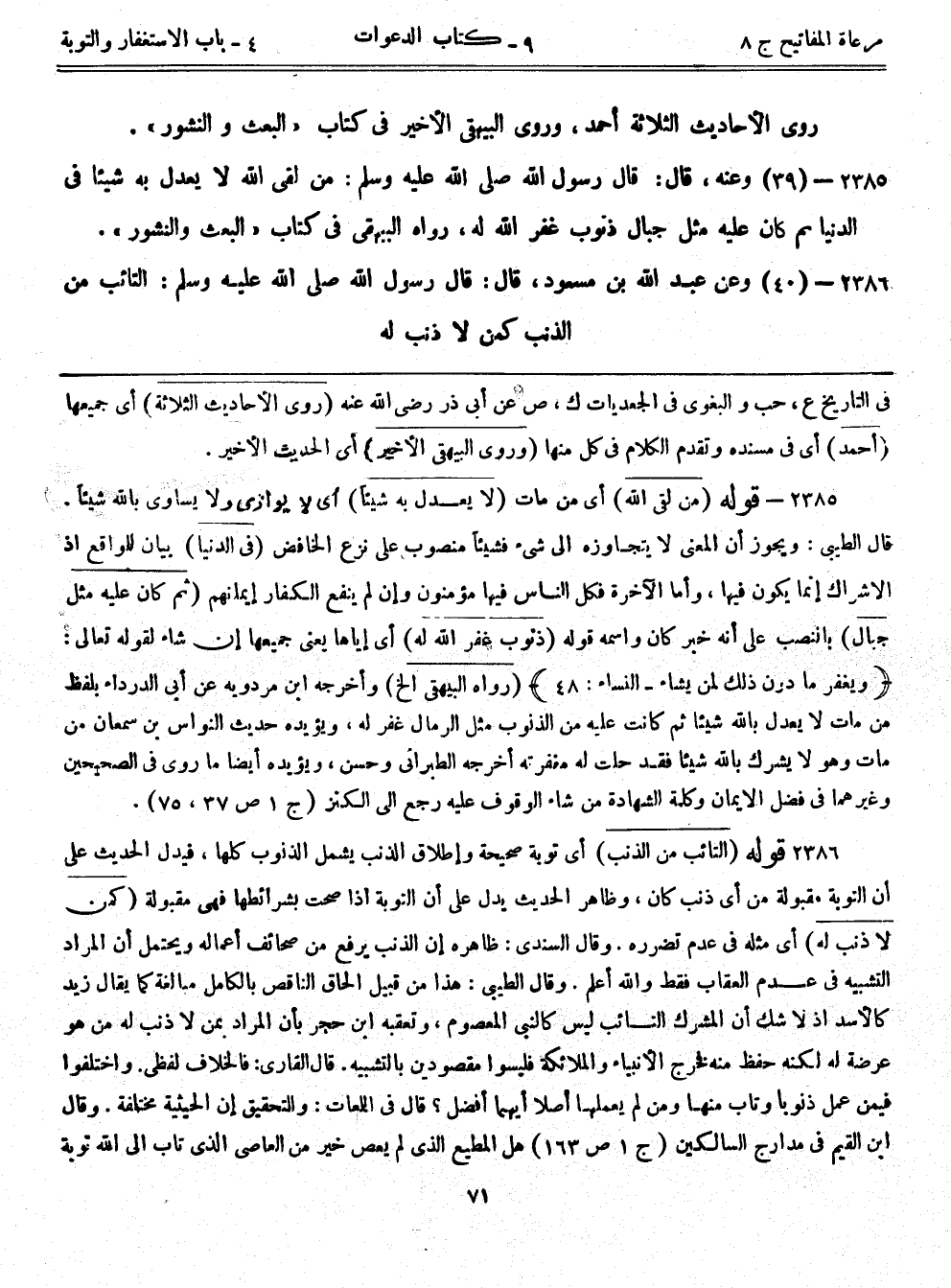 2386- (40) وعن عبد الله بن مسعود قال: قال رسول الله صلى الله عليه وسلم: التائب من الذنب كمن لا ذنب له.