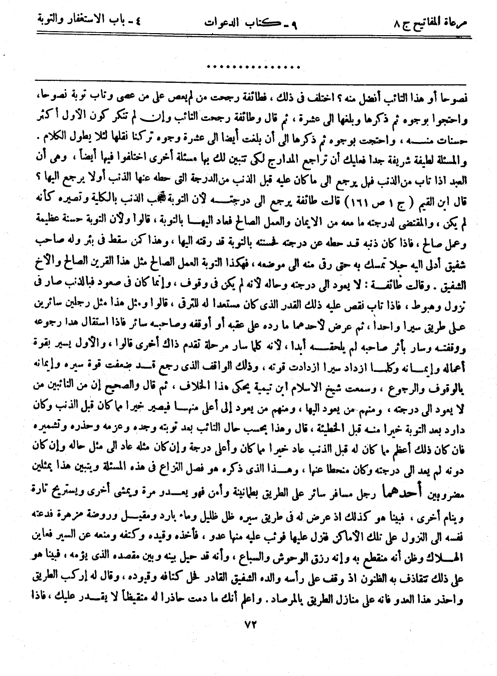 نصوحًا أو هذا التائب أفضل منه؟ اختلف في ذلك، فطائفة رجحت من لم يعص على من عصى وتاب توبة نصوحًا واحتجوا بوجوه ثم ذكرها وبلغها إلى عشرة، ثم قال: وطائفة رجحت التائب وإن لم تنكر كون الأول أكثر حسنات منه، واحتجت بوجوه ثم ذكرها إلى أن بلغت أيضًا إلى عشرة وجوه تركنا نقلها لئلا يطول الكلام. والمسألة لطيفة شريفة جدًا فعليك أن تراجع المدارج لكي تتبين لك بها مسألة أخرى اختلفوا فيها أيضًا، وهي: أن العبد إذا تاب من الذنب فهل يرجع إلى ما كان عليه قبل الذنب من الدرجة التي حطه عنها الذنب أولا يرجع إليها؟ قال ابن القيم (ج1 ص161) : قالت: طائفة يرجع إلى درجته لأن التوبة تجب الذنب بالكلية وتصيره كأنه لم يكن، والمقتضي لدرجته ما معه من الإيمان والعمل الصالح فعاد إليها بالتوبة، قالوا: ولأن التوبة حسنة عظيمة وعمل صالح، فإذا كان ذنبه قد حطه عن درجته فحسنته بالتوبة قد رقته إليها، وهذا كمن سقط في بئر وله صاحب شفيق أدلى إليه حبلاً تمسك به حتى رقى منه إلى موضعه، فهكذا التوبة العمل الصالح مثل هذا القرين الصالح والأخ الشفيق. وقالت طائفة: لا يعود إلى درجته وحاله لأنه لم يكن في وقوف، وإنما كان في صعود فبالذنب صار في نزول وهبوط، فإذا تاب نقص عليه ذلك القدر الذي كان مستعدًا له للترقي، قالوا: ومثل هذا مثل رجلين سائرين على طريق سيرًا واحدًا، ثم عرض لأحدهما ما رده على عقبه أو أوقفه وصاحبه سائر فإذا استقال هدا رجوعه ووقفته وسار بأثر صاحبه لم يلحقه أبدًا لأنه كلما سار مرحلة تقدم ذاك أخرى قالوا: والأول يسير بقوة أعماله وإيمانه وكلما ازداد سيرًا ازدادت قوته، وذلك الواقف الذي رجع قد ضعفت قوة سيره وإيمانه بالوقوف والرجوع، وسمعت شيخ الإسلام ابن تيمية يحكي هذا الخلاف، ثم قال: والصحيح إن من التائبين من لا يعود إلى درجته، ومنهم من يعود إليها، ومنهم من يعود إلى أعلى منها فيصير خيرًا مما كان قبل الذنب وكان داود بعد التوبة خيرًا منه قبل الخطيئة، قال: وهذا بحسب حال التائب بعد توبته وجده وعزمه، وحذره وتشميره فإن كان ذلك أعظم مما كان له قبل الذنب عاد خيرًا مما كان وأعلى درجة وإن كان مثله عاد إلى مثل حاله وإن كان دونه لم يعد إلى درجته وكان منحطًا عنها. وهذا الذي ذكره هو فصل النزاع في هذه المسألة ويتبين هذا بمثلين مضروبين أحدهما: رجل مسافر سائر على الطريق بطمأنينة وأمن فهو يعدو مرة ويمشي أخرى ويستريح تارة، وينام أخرى، فبينا هو كذلك إذ عرض له في طريق سيره ظل ظليل، وماء بارد ومقيل، وروضة مزهرة فدعته نفسه إلى النزول على تلك الأماكن فنزل عليها فوثب عليه منها عدو، فأخذه وقيده وكتفه ومنعه عن السير فعاين الهلاك وظن أنه منقطع به وإنه رزق الوحوش والسباع، وأنه قد حيل بينه وبين مقصده الذي يؤمه، فبينا هو على ذلك تتقاذف به الظنون إذ وقف على رأسه والده الشفيق القادر فحل كتافه وقيوده، وقال له: اركب الطريق واحذر هذا العدو فإنه على منازل الطريق بالمرصاد. واعلم أنك ما دمت حاذرًا له متيقظًا لا يقدر عليك، فإذا