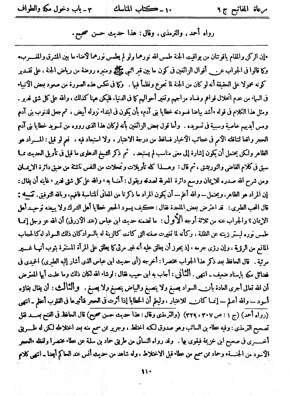((إن الركن والمقام ياقوتتان من يواقيت الجنة طمس الله نورهما ولو لم يطمس نورهما لأضاء ما بين المشرق والمغرب)) . وكما قالوا في الجواب عن أقوال الزائغين في كون ما بين قبر النبي - صلى الله عليه وسلم - ومنبره روضة من رياض الجنة، على تقدير كونه محمولاً على الحقيقة أنه لو كان من الجنة لما نجوع ونظمأ فيها. وكما في عكس هذه الصورة من صعود بعض الأنبياء في السماء من عدم انحلال قواهم وفساد مزاجهم وتغير أحوالهم كما في الدنيا، فليكن ها هنا كذلك، والله على كل شيء قدير. ومثل هذا الكلام في قوله ((أشد بياضًا فسودته خطايا بني آدم)) بأن يكون في ابتداء نزوله أبيض، ثم جعل لذنوب بني آدم ومس أيديهم خاصية وسببية في تسويده. وأما قول بعض الزائغين بأنه لو كان هذا الذي رووه من تسويد خطايا بني آدم الحجر واقعًا لتناقلته الأمم في عجائب الأخبار فساقط من درجة الاعتبار، ولا استبعاد فيه، نعم لو قيل: المراد هو الظاهر ولكن يحتمل أن يكون إشارة إلى معنى مناسب لم يستعبد. ثم ذكر الشيخ الدهلوي ما قيل في تأويل الحديث مما سبق في كلام القاضي والتوربشتي، ثم قال: وهذا كله تأويلات وتمحلات من النفس ناشئة من ضيق دائرة الإيمان ومن شرح الله صدره للإيمان ووسع دائرة المعرفة لصدقه ويقول: آمنا به، والله على كل شيء قدير، غايته أن يقال: إن المراد هو الظاهر، ويحتمل – والله أعلم – أن يكون المراد ما ذكرنا من المعاني المتناسبة فافهم، وبالله التوفيق. تنبيه: قال المحب الطبري: قد اعترض بعض الملحدة فقال: كيف يسود الحجر خطايا أهل الشرك ولا يبيضه توحيد أهل الإيمان؟ والجواب عنه من ثلاثة أوجه، الأول: ما تضمنه حديث ابن عباس (عند الأزرقي) أن الله عز وجل إنما طمس نوره ليستر زينته عن الظلمة، وكأنه لما تغيرت صفته التي كانت كالزينة له بالسواد كان ذلك السواد له كالحجاب المانع من الرؤية، وإن رُؤي جرمه، إذ يجوز أن يطلق عليه أنه غير مريء كما يطلق على المرأة المستترة بثوب أنها غير مرئية. قال الحافظ بعد ذكر هذا الجواب مختصرًا: أخرجه (أي حديث ابن عباس الذي أشار إليه الطبري) الحميدي في فضائل مكة بإسناد ضعيف – انتهى. الثاني: أجاب به ابن حبيب فقال: لو شاء الله لكان ذلك وما علمت أيها المعترض أن الله تعالى أجر العادة بأن السواد يصبغ ولا ينصبغ والبياض ينصبغ ولا يصبغ. والثالث: أن يقال بقاؤه أسود – والله أعلم – إنما كان للاعتبار، وليعلم أن الخطايا إذا أثرت في الحجر فتأثيرها في القلوب أعظم – انتهى. (رواه أحمد) (ج 1: ص 307، 329) (والترمذي وقال: هذا حديث حسن صحيح) قال الحافظ في الفتح بعد نقل تصحيح الترمذي: وفيه عطاء بن السائب وهو صدوق لكنه اختلط، وجرير ممن سمع منه بعد اختلاطه، لكن له طريق أخرى في صحيح ابن خزيمة فيقوى بها. وقد رواه النسائي من طريق حماد بن سلمة عن عطاء مختصرًا ولفظه ((الحجر الأسود من الجنة)) وحماد ممن سمع من عطاء قبل الاختلاط، وله شاهد من حديث أنس عند الحاكم أيضًا - انتهى كلام
