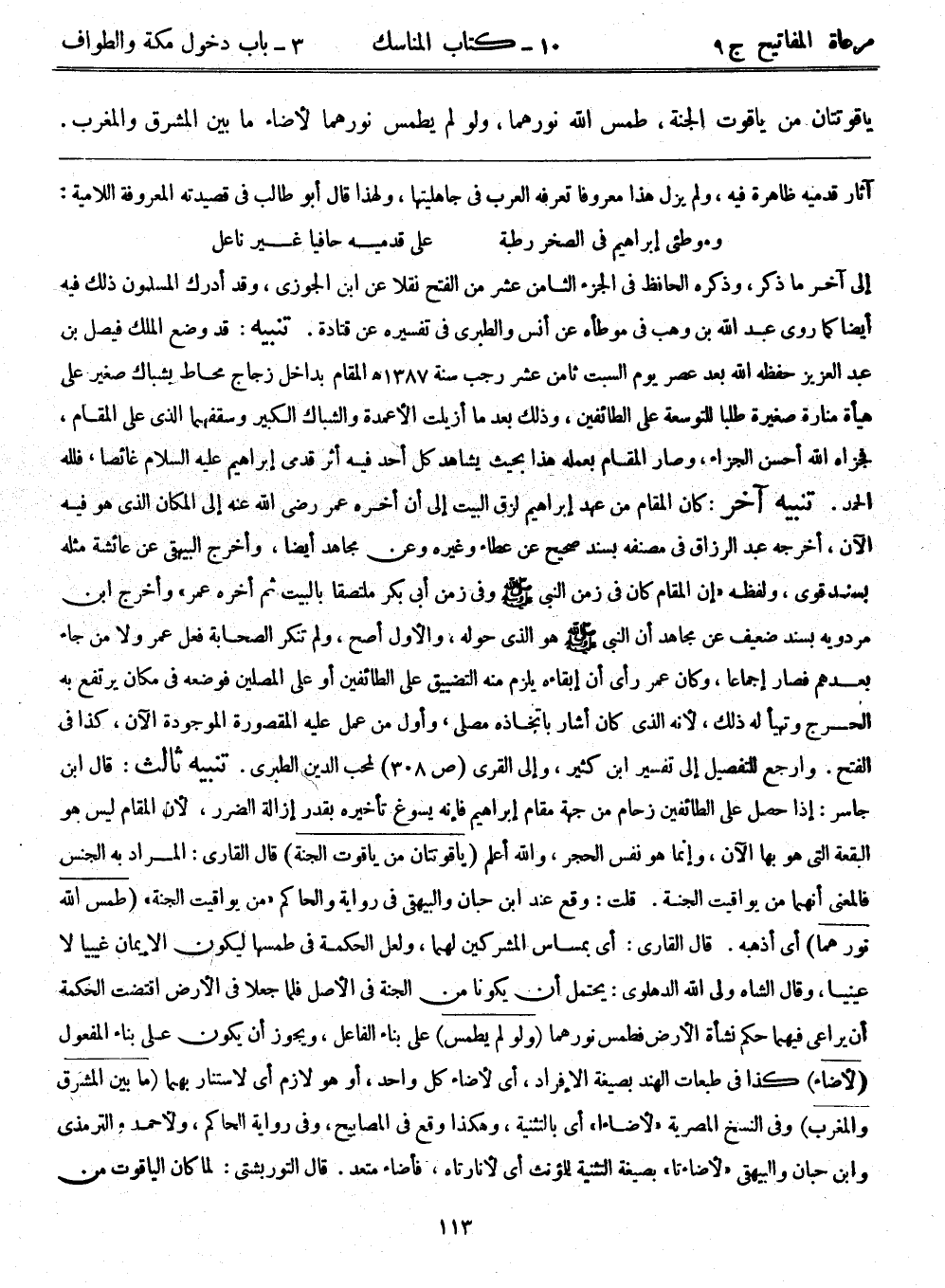 إلى آخر ما ذكر، وذكره الحافظ في الجزء الثامن عشر من الفتح نقلاً عن ابن الجوزي، وقد أدرك المسلمون ذلك فيه أيضًا كما روى عبد الله بن وهب في موطأه عن أنس والطبري في تفسيره عن قتادة. تنبيه: قد وضع الملك فيصل بن عبد العزيز حفظه الله بعد عصر يوم السبت ثامن عشر رجب سنة 1387 هـ المقام بداخل زجاج محاط بشباك صغير على هيأة منارة صغيرة طلبًا للتوسعة على الطائفين، وذلك بعد ما أزيلت الأعمدة والشباك الكبير وسقفهما الذي على المقام، فجزاه الله أحسن الجزاء، وصار المقام بعمله هذا بحيث يشاهد كل أحد فيه أثر قدمي إبراهيم عليه السلام غائصًا، فلله الحمد. تنبيه آخر: كان المقام من عهد إبراهيم لزق البيت إلى أن أخره عمر رضي الله عنه إلى المكان الذي هو فيه الآن، أخرجه عبد الرزاق في مصنفه بسند صحيح عن عطاء وغيره وعن مجاهد أيضًا، وأخرج البيهقي عن عائشة مثله بسند قوي، ولفظه ((إن المقام كان في زمن النبي - صلى الله عليه وسلم - وفي زمن أبي بكر ملتصقًا بالبيت ثم أخرجه عمر)) وأخرج ابن مردويه بسند ضعيف عن مجاهد أن النبي - صلى الله عليه وسلم - هو الذي حوله، والأول أصح، ولم تنكر الصحابة فعل عمر ولا من جاء بعدهم فصار إجماعًا، وكان عمر رأى أن إبقاءه يلزم منه التضييق على الطائفين أو على المصلين فوضعه في مكان يرتفع به الحرج وتهيأ له ذلك، لأنه الذي كان أشار باتخاذه مصلى، وأول من عمل عليه المقصورة الموجودة الآن، كذا في الفتح. وارجع للتفصيل إلى تفسير ابن كثير، وإلى القرى (ص 308) لمحب الدين الطبري. تنبيه ثالث: قال ابن جاسر: إذا حصل على الطائفين زحام من جهة مقام إبراهيم فإنه يسوغ تأخيره بقدر إزالة الضرر، لأن المقام ليس هو البقعة التي هو بها الآن، وإنما هو نفس الحجر، والله أعلم (ياقوتتان من ياقوت الجنة) قال القاري: المراد به الجنس فالمعنى أنهما من يواقيت الجنة. قلت: وقع عند ابن حبان والبيهقي في رواية والحاكم ((من يواقيت الجنة)) (طمس الله نورهما) أي أذهبه. قال القاري: أي بمساس المشركين لهما، ولعل الحكم في طمسهم ليكون الإيمان غيبيًا لا عينيًا، وقال الشاه ولي الدهلوي: يحتمل أن يكونا من الجنة في الأصل فلما جعلا في الأرض اقتضت الحكمة أن يرعى فيهما حكم نشأة الأرض فطمس نورهما (ولو لم يطمس) على بناء الفاعل، ويجوز أن يكون على بناء المفعول (لأضاء) كذا في طبعات الهند بصيغة الإفراد أي لأضاء كل واحد، أو هو لازم أي لاستنار بهما (ما بين المشرق والمغرب) وفي النسخ المصرية ((لأضاءا)) أي بالتثنية، وهكذا وقع في المصابيح، وفي رواية للحاكم، ولأحمد، وللترمذي وابن حبان والبيهقي ((لأضاءتا)) بصيغة التثنية للمؤنث أي لأنارتاه، فأضاء متعد. قال التوربشتي: لما كان الياقوت من