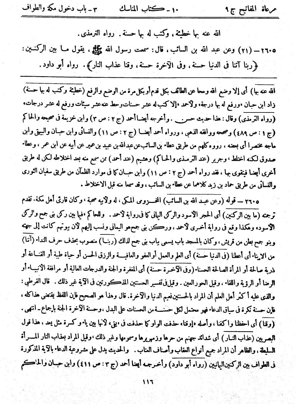 2605- (21) وعن عبد الله بن السائب، قال سمعت رسول الله - صلى الله عليه وسلم -، يقول ما بين الركنين: {ربنا آتنا في الدنيا حسنة وفي الآخرة حسنة وقنا عذاب النار} . رواه أبو داود.