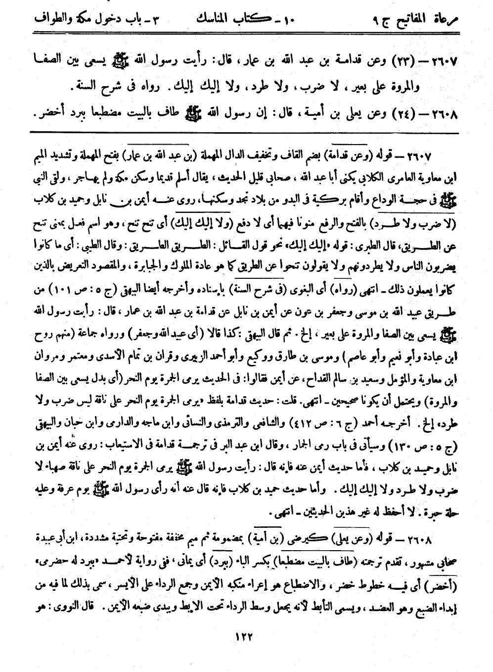 2607 – (23) وعن قدامة بن عبد الله بن عمار قال: رأيت رسول الله - صلى الله عليه وسلم - يسعى بين الصفا والمروة على بعير لا ضرب ولا طرد ولا إليك. رواه في شرح السنة.