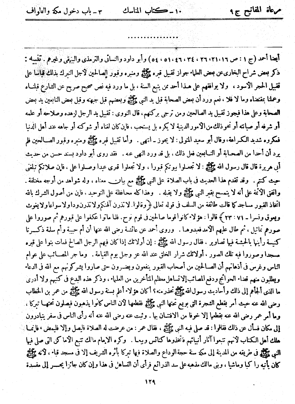 أيضًا أحمد (ج 1: ص 16، 21، 26، 34، 46، 51، 54) وأبو داود والنسائي والترمذي والبيهقي وغيرهم. تنبيه: ذكر بعض شراح البخاري عن بعض العلماء جواز تقبيل قبره - صلى الله عليه وسلم - ومنيره وقبور الصالحين لأجل التبرك بذلك قياسًا على تقبيل الحجر الأسود، ولا يوافقهم على هذا أحد ممن يتبع السنة، بل ما ورد فيه نص صحيح صريح عن الشارع قبلناه وعملنا بمقتضاه وما لا فلا، نعم ورد أن بعض الصحابة قبل يد النبي - صلى الله عليه وسلم - وبعضهم قبل جهته وقبل بعض التابعين يد بعض الصحابة وعلى هذا فيجوز تقبيل يد الصالحين ومن ترجى بركتهم، قال النووي: تقبيل يد الرجل لزهده وصلاحه أو علمه أو شرفه أو صيانته أو نحو ذلك من الأمور الدينية لا يكره بل يستحب، فإن كان لغناه أو شوكته أو جاهه عند أهل الدنيا فمكروه شديد الكراهة، وقال أبو سعيد المتولي: لا يجوز – انتهى. وأما تقبيل قبره - صلى الله عليه وسلم - ومنبره وقبور الصالحين فلم يرد أن أحدًا من الصحابة أو التابعين فعل ذلك، بل قد ورد النهي عنه. فقد روى أبو داود بسند حسن من حديث أبي هريرة قال: قال رسول الله - صلى الله عليه وسلم -: " لا تجعلوا بيوتكم قبورًا، ولا تجعلوا قبري عيدًا وصلوا عليَّ، فإن صلاتكم تبلغني حيث كنتم ". وقد تقدم هذا الحديث في باب الصلاة على النبي - صلى الله عليه وسلم - مع بيان معناه وله شواهد من أوجه مختلفة. واتفق الأئمة على أنه لا يتمسح بقبر النبي - صلى الله عليه وسلم - ولا يقبله. وهذا كله محافظة على التوحيد. فإن من أصول الشرك بالله اتخاذ القبور مساجد كما قالت طائفة من السلف في قوله تعالى: {وقالوا لا تذرن آلهتكم ولا تذرن ودًا ولا سواعًا ولا يغوث ويعوق ونسرًا} (71: 23) قالوا: هؤلاء كانوا قومًا صالحين في قوم نوح. فلما ماتوا عكفوا على قبورهم ثم صوروا على صورهم تماثيل، ثم طال عليهم الأمد فعبدوها. وروى أحمد عن عائشة رضي الله عنها أن أم حبيبة وأم سلمة ذكرتا كنيسة رأينها بالحبشة فيها تصاوير، فقال رسول الله - صلى الله عليه وسلم -: " إن أولئك إذا كان فيهم الرجل الصالح فمات بنو على قبره مسجدًا وصوروا فيه تلك الصور. أولئك شرار الخلق عند الله عز وجل يوم القيامة ". وما جر المصائب على عوام الناس وغرس في أذانهم أن الصالحين من أصحاب القبور ينفعون ويضرون حتى صاروا يشركونهم مع الله في الدعاء ويطلبون منهم قضاء الحوائج ودفع المصائب إلا تساهل معظم المتأخرين من العلماء، وذكر هذه البدع في كتبهم ولا أدري ما الذي ألجأهم إلى ذلك وأحاديث رسول الله - صلى الله عليه وسلم - تحذر منه؟ أكان هؤلاء أعلم بسنة رسول الله - صلى الله عليه وسلم - من عمر بن الخطاب رضي الله عنه حيث أمر بقطع الشجرة التي بويع تحتها النبي - صلى الله عليه وسلم - فقطعها لأن الناس كانوا يذهبون فيصلون تحتها تبركًا. وما أمر عمر رضي الله عنه بقطعها إلا خوفًا من الافتتان بها. وثبت عنه رضي الله عنه أنه رأى الناس في سفر يتبادرون إلى مكان فسأل عن ذلك فقالوا: قد صلى فيه النبي - صلى الله عليه وسلم -، فقال عمر: من عرضت له الصلاة فليصل وإلا فليمض، فإنما هلك أهل الكتاب لأنهم تتبعوا آثار أنبيائهم فاتخذوها كنائس وبيعًا. وكره الإمام مالك تتبع الأماكن التي صلى فيها النبي - صلى الله عليه وسلم - في طريقه من المدينة إلى مكة سنة حجة الوداع والصلاة فيها تبركًا بأثره الشريف إلا في مسجد قباء، لأنه - صلى الله عليه وسلم - كان يأتيه راكبًا وماشيًا، وبني مالك مذهبه على سد الذرائع فرأى أن التساهل في هذا وإن كان جائزًا يجر إلى مفسدة