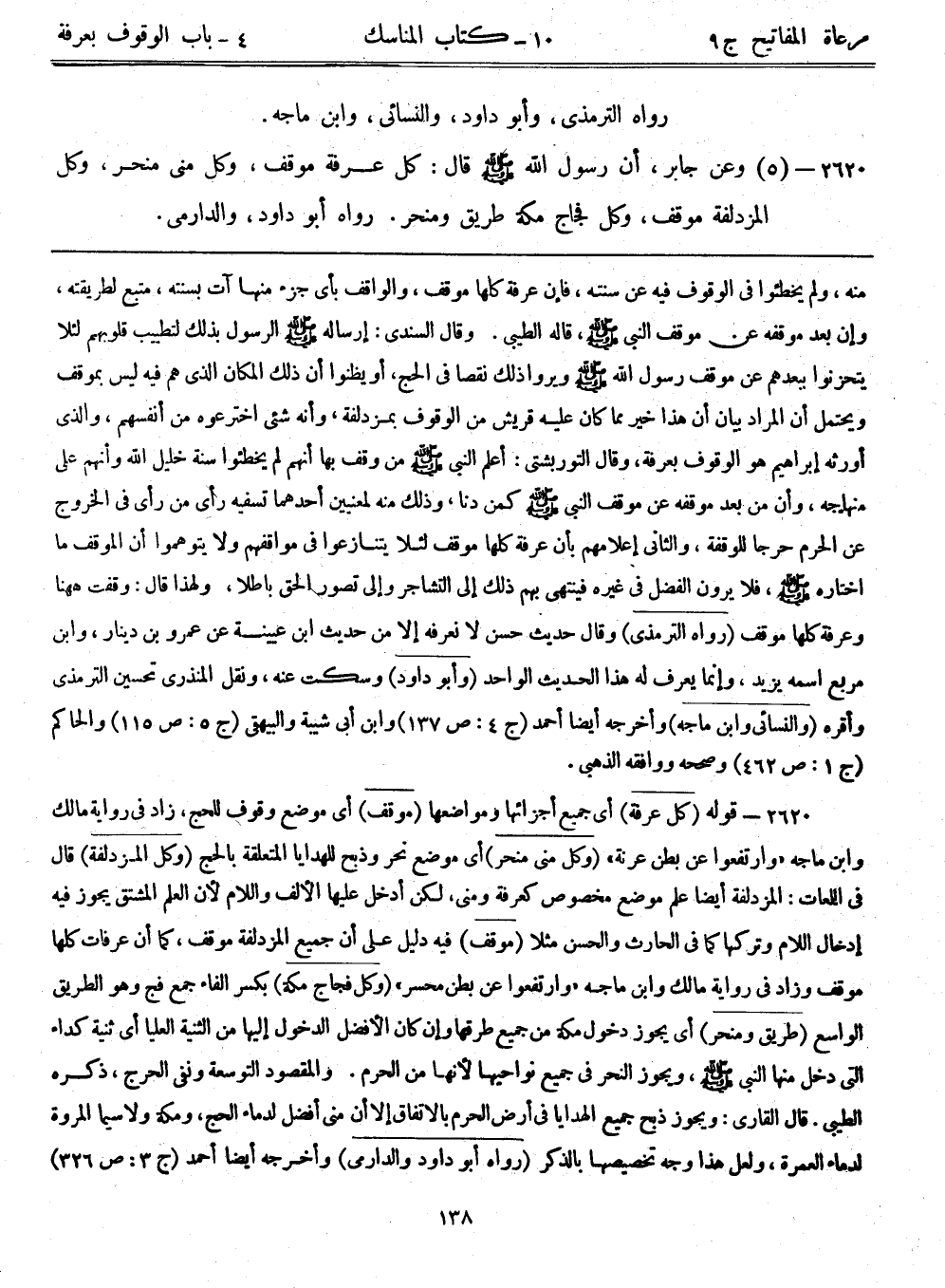 2620 – (5) وعن جابر، أن رسول الله - صلى الله عليه وسلم - قال: " كل عرفة موقف، وكل منى منحر، وكل المزدلفة موقف، وكل فجاج مكة طريق ومنحر ". رواه أبو داود والدارمي.