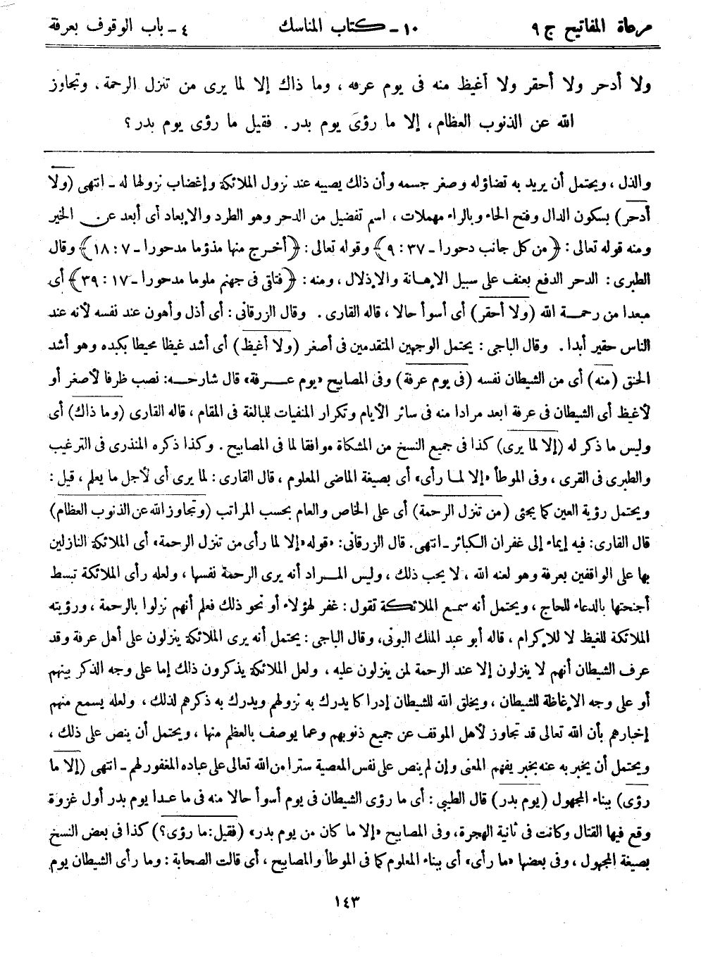 والذل، ويحتمل أن يريد به تضاؤله وصغر جسمه وأن ذلك يصيبه عند نزول الملائكة وإغضاب نزولها له – انتهى. (ولا أدْحَر) بسكون الدال وفتح الحاء وبالراء مهملات، اسم تفضيل من الدحر وهو الطرد والإبعاد أي أبعد عن الخير ومنه قوله تعالى: {من كل جانب دحورًا} (37: 8، 9) وقوله تعالى {اخرج منها مذؤمًا مدحورًا} (7: 18) وقال الطبري: الدحر الدفع بعنف على سبيل الإهانة والإذلال، ومنه: {فتلقى في جهنم ملومًا مدحورًا} (17: 39) أي مبعدًا من رحمة الله (ولا أحقر) أي أسوأ حالاً، قاله القاري. وقال الزرقاني: أي أذل وأهون عند نفسه لأنه عند الناس حقير أبدًا. وقال الباجي: يحتمل الوجهين المتقدمين في أصغر (ولا أغيظ) أي أشد غيظًا محيطًا بكبده وهو أشد الحنق (منه) أي من الشيطان نفسه (في يوم عرفة) وفي المصابيح ((يوم عرفة)) قال شارحه: نصب ظرفًا لأصغر أو لأغيظ أي الشيطان في عرفة أبعد مرادًا منه في سائر الأيام وتكرار المنفيات للمبالغة في المقام، قاله القاري (وما ذاك) أي وليس ما ذكر له (إلا لما يرى) كذا في جميع النسخ من المشكاة موافقًا لما في المصابيح. وكذا ذكره المنذري في الترغيب والطبري في القرى، وفي الموطأ ((إلا لما رأى)) أي بصيغة الماضي المعلوم، قال القاري: لما يرى أي لأجل ما يعلم، قيل: ويحتمل رؤية العين كما يجيء (من تنزل الرحمة) أي على الخاص والعام بحسب المراتب (وتجاوز الله عن الذنوب العظام) قال القاري: فيه إيماء على غفران الكبائر – انتهى. قال الزرقاني: ((قوله: ((إلا لما رأى من تنزل الرحمة)) أي الملائكة النازلين بها على الواقفين بعرفة وهو لعنه الله، لا يحب ذلك، وليس المراد أنه يرى الرحمة نفسها، ولعله رأى الملائكة تبسط أجنحتها بالدعاء للحاج، ويحتمل أنه سمع الملائكة تقول: غفر لهؤلاء أونحو ذلك فعلم أنهم نزلوا بالرحمة، ورؤيته الملائكة للغيظ لا للإكرام، قاله أبو عبد الملك البوني، وقال الباجي: يحتمل أنه يرى الملائكة ينزلون على أهل عرفة وقد عرف الشيطان أنهم لا ينزلون إلا عند الرحمة لمن ينزلون عليه، ولعل الملائكة يذكرون ذلك أما على وجه الذكر بينهم أو على وجه الإغاظة للشيطان، ويخلق الله للشيطان إدراكًا يدرك به نزولهم ويدرك به ذكرهم لذلك، ولعله يسمع منهم إخبارهم بأن الله تعالى قد تجاوز لأهل الموقف عن جميع ذنوبهم وعما يوصف بالعظم منها، ويحتمل أن ينص على ذلك، ويحتمل أن يخبر به عنه بخبر يفهم المعنى وإن لم ينص على نفس المعصية سترًا من الله تعالى على عباده المغفور لهم – انتهى. (إلا ما رُؤي) ببناء المجهول (يوم بدر) قال الطيبي: أي ما رُؤي الشيطان في يوم أسوأ حالاً منه في ما عدا يوم بدر أول غزوة وقع فيها القتال وكانت في ثانية الهجرة، وفي المصابيح ((إلا ما كان من يوم بدر)) (فقيل: ما رُؤي؟) كذا في بعض النسخ بصيغة المجهول، وفي بعضها ((ما رأى)) أي ببناء المعلوم كما في الموطأ والمصابيح، أي قالت الصحابة: وما رأى الشيطان يوم