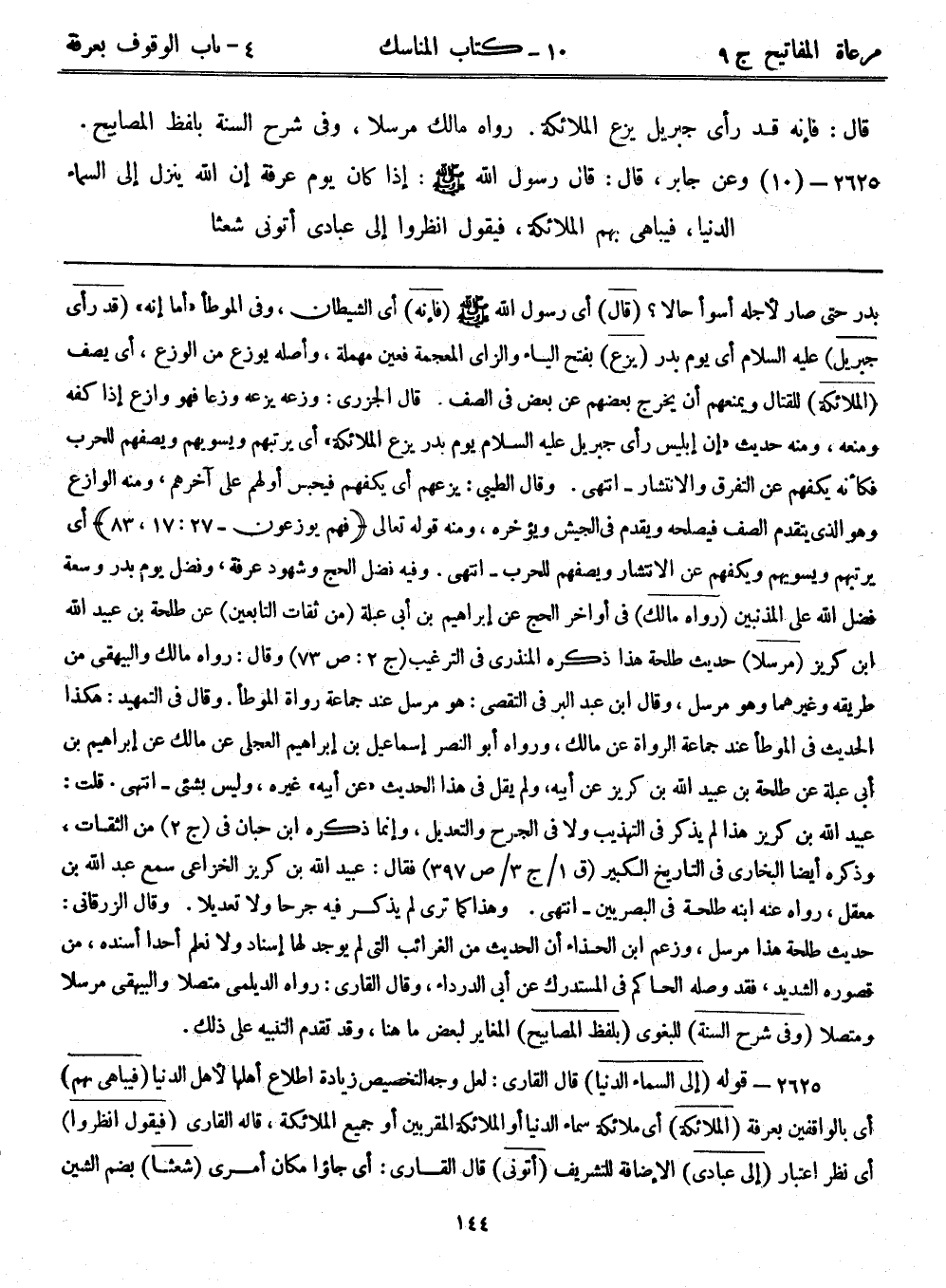 2625 – قوله (إلى السماء الدنيا) قال القاري: لعل وجه التخصيص زيادة اطلاع أهلها لأهل الدنيا (فيباهي بهم) أي بالواقفين بعرفة (الملائكة) أي ملائكة سماء الدنيا أو الملائكة المقربين أو جميع الملائكة، قاله القاري (فيقول انظروا) أي نظر اعتبار (إلى عبادي) الإضافة للتشريف (أتوني) قال القاري: أي جاءوا مكان أمري (شُعثًا) بضم الشين