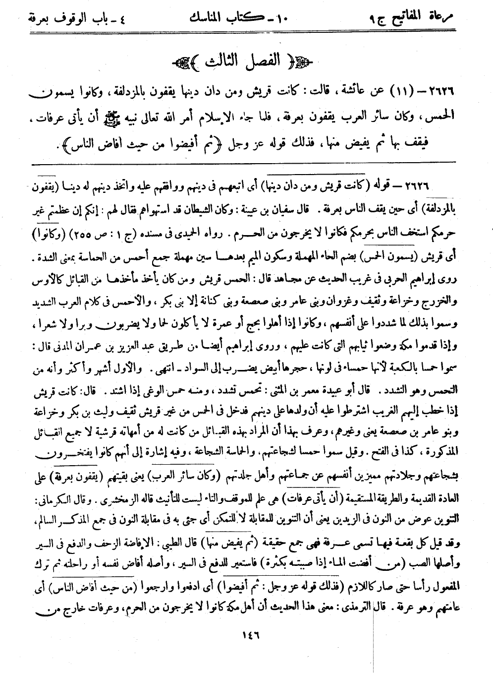 2626 - قوله (كانت قريش ومن دان دينها) أي اتبعهم في دينهم ووافقهم عليه واتخذ دينهم له ديناً (يقفون بالمزدلفة) أي حين يقف الناس بعرفة. قال سفيان بن عيينة: وكان الشيطان قد استهواهم فقال لهم: إنكم إن عظَّمتم غير حرمكم استخف الناس بحرمكم فكانوا لا يخرجون من الحرم. رواه الحميدي في مسنده (ج 1: ص 255) (وكانوا) أي قريش (يسمون الحُمْس) بضم الحاء المهملة وسكون الميم بعدها سين مهملة جمع أحمس من الحماسة بمعنى الشدة. روى إبراهيم الحربي في غريب الحديث عن مجاهد قال: الحمس قريش ومن كان يأخذ مأخذها من القبائل كالأوس والخزرج وخزاعة وثقيف وغزوان وبني عامر وبني صعصعة وبني كنانة إلا بني بكر، والأحمس في كلام العرب الشديد، وسموا بذلك لما شددوا على أنفسهم، وكانوا إذا أهلوا بحج أو عمرة لا يأكلون لحمًا ولا يضربون وبرًا ولا شعرًا، وإذا قدموا مكة وضعوا ثيابهم التي كانت عليهم، وروى إبراهيم أيضًا من طريق عبد العزيز بن عمران المدني قال: سموا حمسًا بالكعبة لأنها حمساء في لونها، حجرها أبيض يضرب إلى السواد - انتهى. والأول أشهر وأكثر وأنه من التحمس وهو التشدد. قال أبو عبيدة معمر بن المثنى: تحمس تشدد، ومنه حمس الوغى إذا اشتد. قال: كانت قريش إذا خطب إليهم الغريب اشترطوا عليه أن ولدها على دينهم فدخل في الحمس من غير قريش ثقيف وليث بن بكر وخزاعة وبنو عامر بن صعصعة يعني وغيرهم، وعرف بهذا المراد بهذه القبائل من كانت له من أمهاته قرشية لا جميع القبائل المذكورة، كذا في الفتح. وقيل سموا حمسًا لشجاعتهم، والحماسة الشجاعة، وفيه إشارة إلى أنهم كانوا يفتخرون بشجاعتهم وجلادتهم مميزين أنفسهم عن جماعتهم وأهل جلدتهم (وكان سائر العرب) يعني بقيتهم (يقفون بعرفة) على العادة القديمة والطريقة المستقيمة (أن يأتي عرفات) هي علم للموقف والتاء ليست للتأنيث قاله الزمخشري. وقال الكرماني: التنوين عوض من النون في الزيدين يعني أن التنوين للمقابلة لا للتمكن أي جيء به في مقابلة النون في جمع المذكر السالم، وقد قيل كل بقعة فيها تسمى عرفة فهي جمع حقيقة (ثم يفيض منها) قال الطيبي: الإفاضة الزحف والدفع في السير وأصلها الصب (من أفضت الماء إذا صببته بكثرة) فاستعير للدفع في السير، وأصله أفاض نفسه أو راحلته ثم ترك المفعول رأساً حتى صار كاللازم (فذلك قوله عز وجل: ثم أفيضوا) أي ادفعوا وارجعوا (من حيث أفاض الناس) أي عامتهم وهو عرفة. قال الترمذي: معنى هذا الحديث أن أهل مكة كانوا لا يخرجون من الحرم، وعرفات خارج من.