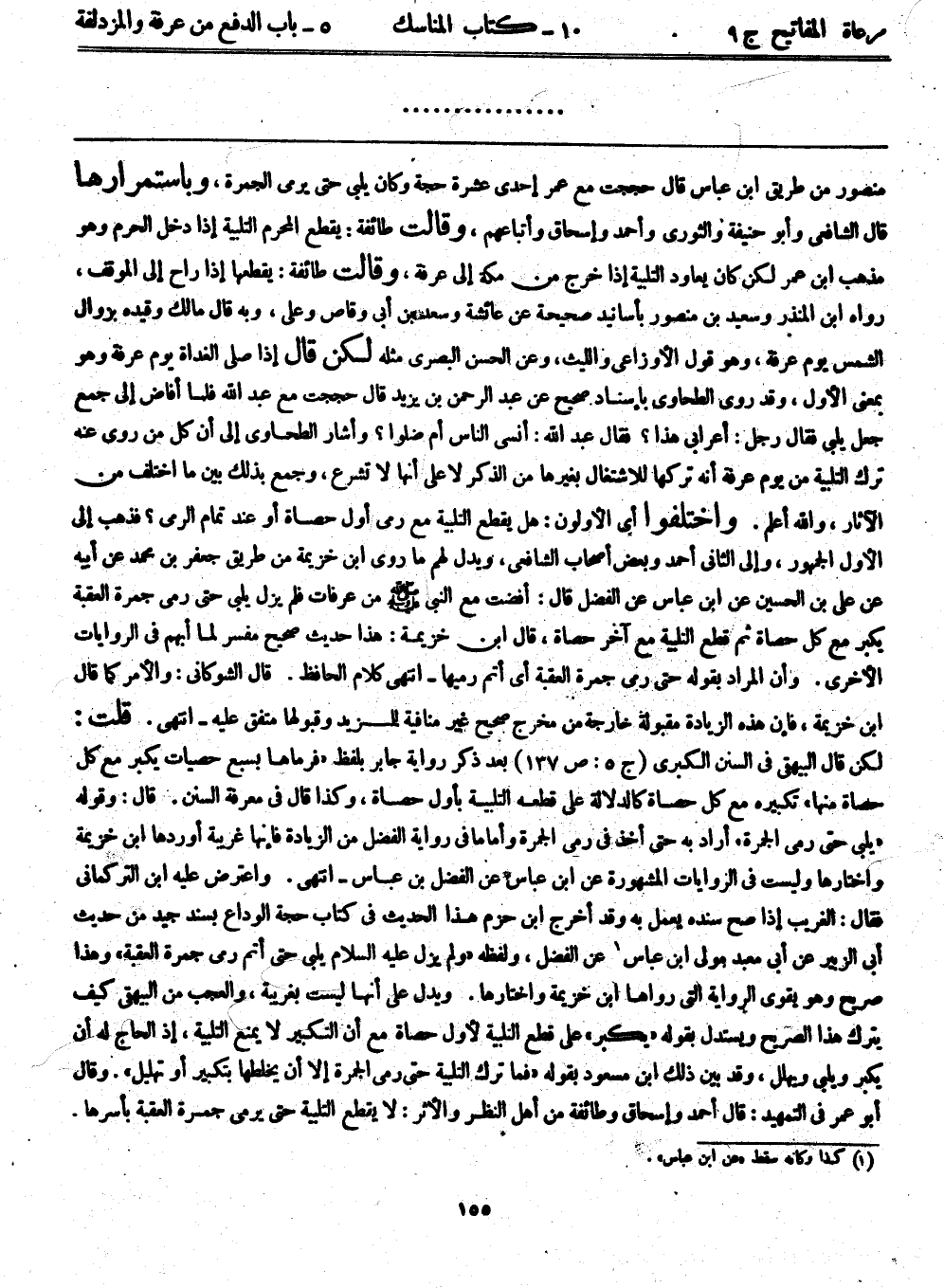 منصور من طريق ابن عباس قال: حججت مع عمر إحدى عشرة حجة وكان يلبي حتى يرمي الجمرة، وباستمرارها قال الشافعي وأبو حنيفة والثوري وأحمد وإسحاق وأتباعهم، وقالت طائفة: يقطع المحرم التلبية إذا دخل الحرم وهو مذهب ابن عمر لكن كان يعاود التلبية إذا خرج من مكة إلى عرفة، وقالت طائفة: يقطعها إذا راح الموقف، رواه ابن المنذر وسعيد بن منصور بأسانيد صحيحة عن عائشة وسعد بن أبي وقاص وعلي، وبه قال مالك وقيده بزوال الشمس يوم عرفة، وهو قول الأوزاعي والليث، وعن الحسن البصري مثله لكن قال: إذا صلى الغداة يوم عرفة وهو بمعنى الأول، وقد روى الطحاوي بإسناد صحيح عن عبد الرحمن بن يزيد قال: حججت مع عبد الله فلما أفاض إلى جمع جعل يلبي فقال رجل: أعرابي هذا؟ فقال عبد الله: أنسي الناس أم ضلوا؟ وأشار الطحاوي إلى أن كل من روى عنه ترك التلبية من يوم عرفة أنه تركها للاشتغال بغيرها من الذكر لا على أنها لا تشرع، وجمع بذلك بين ما اختلف من الآثار، والله اعلم. واختلفوا أي الأولون: هل يقطع التلبية مع رمي أول حصاة أو عند تمام الرمي؟ فذهب إلى الأول الجمهور، وإلى الثاني أحمد وبعض أصحاب الشافعي، ويدل لهم ما روى ابن خزيمة من طريق جعفر بن محمد عن أبيه عن علي بن الحسين عن ابن عباس عن الفضل قال: أفضت مع النبي - صلى الله عليه وسلم - من عرفات فلم يزل يلبي حتى رمى جمرة العقبة يكبر مع كل حصاة ثم قطع التلبية مع آخر حصاة، قال ابن خزيمة: هذا حديث صحيح مفسر لما أبهم في الروايات الأخرى. وأن المراد بقوله حتى رمى جمرة العقبة أي أتم رميها - انتهى كلام الحافظ. قال الشوكاني: والأمر كما قال ابن خزيمة، فإن هذه الزيادة مقبولة خارجة من مخرج صحيح غير منافية للمزيد وقبولها متفق عليه - انتهى. قلت: لكن قال البيهقي في السنن الكبرى (ج 5: ص 137) بعد ذكر رواية جابر بلفظ ((فرماها بسبع حصيات يكبر مع كل حصاة منها)) تكبيرة مع كل حصاة كالدلالة على قطعه التلبية بأول حصاة، وكذا قال في معرفة السنن. قال: وقوله ((يلبي حتى رمى الجمرة)) أراد به حتى أخذ في رمي الجمرة وأما ما في رواية الفضل من الزيادة فإنها غريبة أوردها ابن خزيمة واختارها وليست في الروايات المشهورة عن ابن عباس عن الفضل بن عباس - انتهى. واعترض عليه ابن التركماني فقال: الغريب إذا صح سنده يعمل به. وقد أخرج ابن حزم هذا الحديث في كتاب حجة الوداع بسند جيد من حديث أبي الزبير عن أبي معبد مولى ابن عباس (1) . عن الفضل، ولفظه ((ولم يزل عليه السلام يلبي حتى أتم رمي جمرة العقبة)) ، وهذا صريح وهو يقوي الرواية التي رواها ابن خزيمة واختارها. ويدل على أنها ليست بغريبة، والعجب من البيهقي كيف يترك هذا الصريح ويستدل بقوله ((يكبر)) على قطع التلبية لأول حصاة مع أن التكبير لا يمنع التلبية، إذ الحاج له أن يكبر ويلبي ويهلل، وقد بين ذلك ابن مسعود بقوله ((فما ترك التلبية حتى رمى الجمرة إلا أن يخلطها بتكبير أو تهليل)) . وقال أبو عمر في التمهيد: قال أحمد وإسحاق وطائفة من أهل النظر والأثر: لا يقطع التلبية حتى يرمي جمرة العقبة بأسرها.