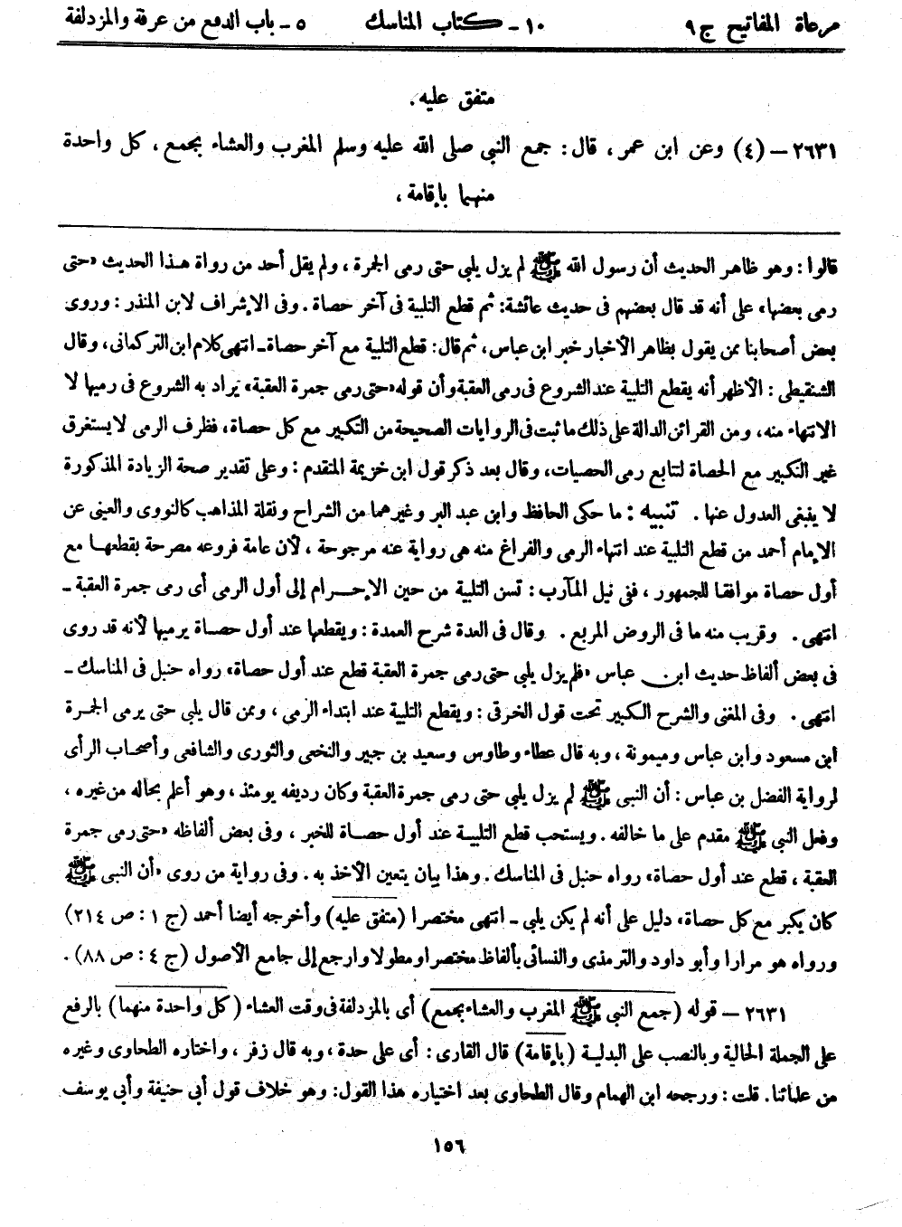 2631 – (4) وعن ابن عمر، قال: جمع النبي - صلى الله عليه وسلم - المغرب والعشاء بجمع، كل واحدة منهما بإقامة،