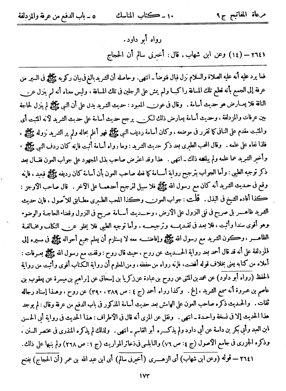 فما يرد عليه أنه عليه الصلاة والسلام نزل فبال فتوضأ – انتهى. وحاصله أن الشريد بالغ في بيان ركوبه - صلى الله عليه وسلم - في السير من عرفة إلى الجمع بأنه قطع تلك المسافة راكبًا ولم يمش على الرجلين في تلك المسافة، وليس معناه أنه لم ينزل عن الناقة فلا يعارض هو حديث أسامة. وقال في عون المعبود: حديث الشريد يدل على أن النبي - صلى الله عليه وسلم - لم ينزل لحاجة بين عرفات والمزدلفة، وحديث أسامة يعارض ذلك لكن يرجع حديث أسامة على حديث الشريد لأنه المثبت أي والمثبت مقدم على النافي كما تقرر في موضعه، وكان أسامة رديف النبي - صلى الله عليه وسلم - فهو أعلم بحاله ولم ير الشريد نزوله - صلى الله عليه وسلم -، فلذا نفاه على علمه. وقال المحب الطبري بعد ذكر حديث الشريد: وما رواه أسامة أثبت فإنه كان ردف النبي - صلى الله عليه وسلم -، وأخبر الشريد عما علمه ولم يبلغه ذلك – انتهى. هذا. وقد اعترض صاحب بذل المجهود على جواب العون فقال بعد ذكر توجيه الطيبي: وأما الجواب بترجيح رواية أسامة كما فعله صاحب العون بأن أسامة كان رديفه - صلى الله عليه وسلم - فبعيد، فأنه وقع في حديث الشريد أنه كان مع رسول الله - صلى الله عليه وسلم - فلا سبيل لترجيح أحدهما على الآخر. قال صاحب الأوجز: كذا أفاده الشيخ في البذل. قلت: جواب العون وكذا المحب الطبري مطابق للأصول، فإن حديث الشريد ظاهر بل صريح في نفي النزول على الأرض، وحديث أسامة صريح في النزول وقضاء الحاجة والوضوء وهو أقوي سندًا وأثبت، فلا بعد في تقديمه وترجيحه، وأما توجيه الطيبي فلا يخلو عن التكلف ومخالفة الظاهر، وكون الشريد مع رسول الله - صلى الله عليه وسلم - وإفاضته معه لا يستلزم أن يعلم جميع أحواله - صلى الله عليه وسلم - في مسيره إلى المزدلفة على أنه قد قال أحمد بعد رواية الحديث عن روح، حيث قال روح: وقفت مع رسول الله - صلى الله عليه وسلم - بعرفات: أملاه من كتابه يعنى بخلاف قوله أفضت، فإنه رواه من حفظه، ومن المعلوم أن رواية الكتاب أقوي وأثبت من رواية الحفظ (رواه أبو داود) عن محمد بن المثني عن روح بن عبادة عن زكريا بن إسحاق عن إبراهيم بن ميسرة عن يعقرب بن عاصم بن عروة أنه سمع الشريد، إلخ. وكذا رواه أحمد (ج 4: ص 389، 390) عن روح، وهذا إسناد رجاله ثقات. والحديث ذكره صاحب العون على الهامش بعد حديث أسامة المذكور في باب الدفع من عرفة وقال: لم يوجد هذا الحديث إلا في نسخة واحدة – انتهى. ونقل عن المزي أنه قال في الأطراف: هذا الحديث في رواية أبي الحسن بن العبد وأبي بكر بن داسة عن أبي داود ولم يذكره أبو القاسم – انتهى. ولذلك لم يذكره المنذري في مختصر السنن، وذكره الجزري في جامع الأصول (ج 4: ص 76) والنابلسي في ذخائر المواريث (ج 1: ص 268) ولم ينبها على ذلك.