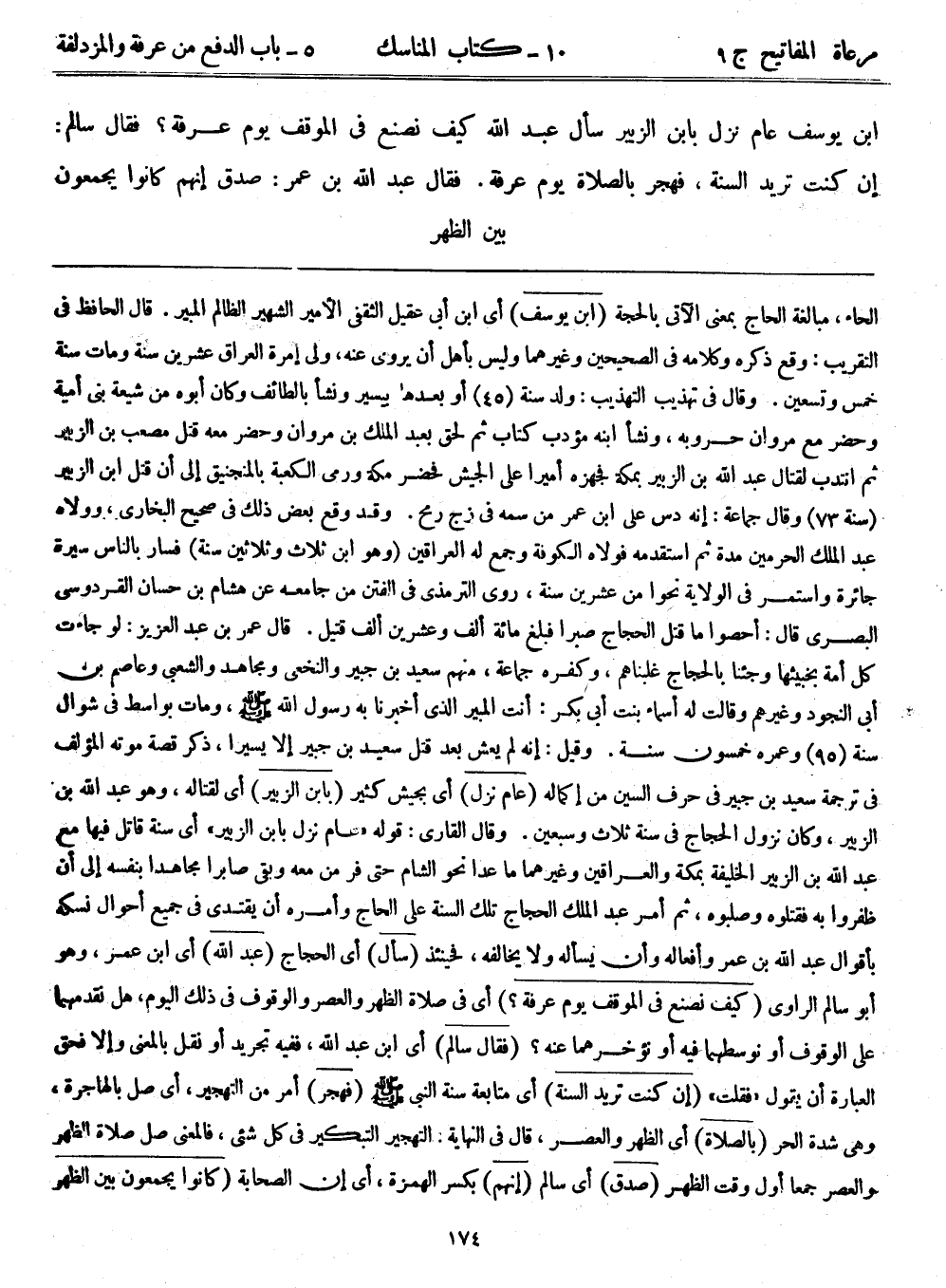 ابن يوسف عام نزل بابن الزبير سأل عبد الله: كيف نصنع في الموقف يوم عرفة؟ فقال سالم: إن كنت تريد السنة، فهجر بالصلاة يوم عرفة. فقال عبد الله بن عمر: صدق إنهم كانوا يجمعون بين الظهر