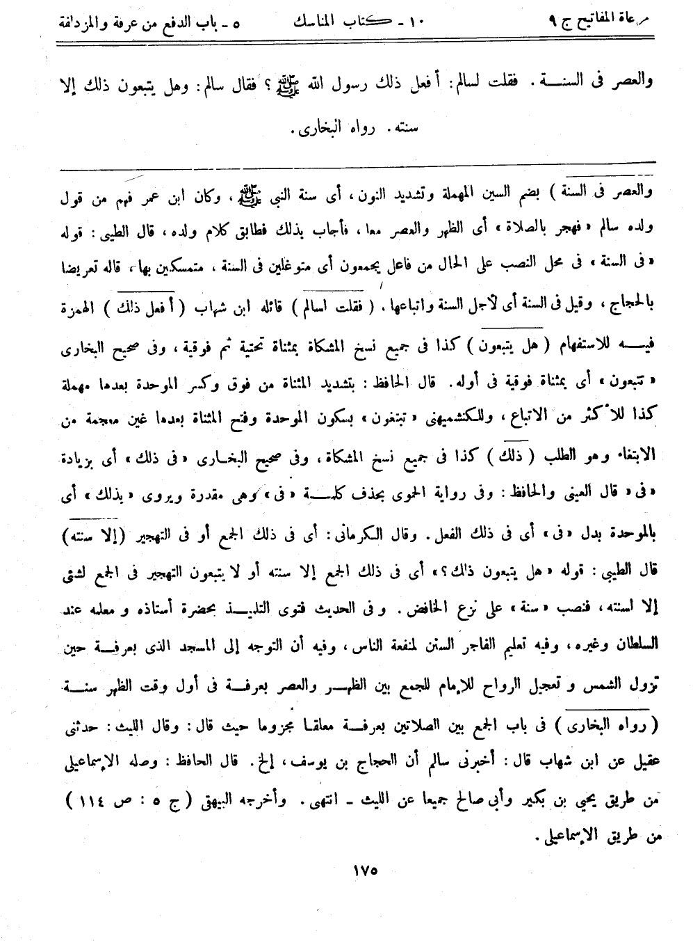 والعصر في السنة) بضم السين المهملة وتشديد النون، أي سنة النبي - صلى الله عليه وسلم -، وكان ابن عمر فهم من قول ولده سالم " فهجر بالصلاة " أي الظهر والعصر معًا، فأجاب بذلك فطابق كلام ولده، قال الطيبي: قوله " في السنة " في محل النصب على الحال من فاعل يجمعون أي متوغلين في السنة، متمسكين بها، قاله تعريضًا بالحجاج، وقيل في السنة أي لأجل السنة وإتباعها. (فقلت لسالم) قائله ابن شهاب (أفعل ذلك) الهمزة فيه للاستفهام (هل يتبعون) كذا في جميع نسخ المشكاه بمثناة تحتية ثم فوقية، وفي صحيح البخاري " تتبعون " أي بمثناة فوقية في أوله. قال الحافظ: بتشديد المثناة من فوق وكسر الموحدة بعدها مهملة كذا للأكثر من الإتباع، وللكشميهني " تبتغون " بسكون الموحدة وفتح المثناة بعدها غين معجمة من الابتغاء وهو الطلب (ذلك) كذا في جميع نسخ المشكاة، وفي صحيح البخاري " في ذلك " أي بزيادة " في " قال العيني والحافظ: وفي رواية الحموي بحذف كلمة " في " وهي مقدرة ويروى " بذلك " أي بالموحدة بدل " في " أي في ذلك الفعل. وقال الكرماني: أي في ذلك الجمع أو في التهجير (إلا سنته) قال الطيبي: قوله " هل يتبعون ذلك؟ " أي في ذلك الجمع إلا سنته أو لا يتبعون التهجير في الجمع لشيء إلا لسنته، فنصب ((سنة)) على نزع الخافض. وفي الحديث فتوى التلميذ بحضرة أستاذه ومعلمه عند السلطان وغيره، وفيه تعليم الفاجر السنن لمنفعة الناس، وفيه أن التوجه إلى المسجد الذي بعرفة حين تزول الشمس وتعجيل الرواح للإمام للجمع بن الظهر والعصر بعرفة في أول وقت الظهر سنة. (رواه البخاري) في باب الجمع بين الصلاتين بعرفة معلقًا مجزومًا حيث قال: وقال الليث: حدثني عقيل عن ابن شهاب قال: أخبرني سالم أن الحجاج بن يوسف، إلخ. قال الحافظ: وصله الإسماعيلي من طريق يحيى بن بكير وأبي صالح جميعًا عن الليث – انتهى. وأخرجه البيهقي (ج 5: ص 114) من طريق الإسماعيلي.