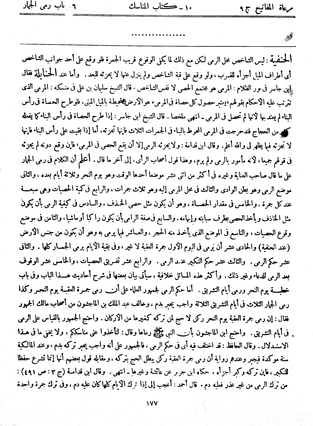 الحنيفة: ليس الشاخص محل الرمي لكن مع ذلك لما يكفي الوقوع قريب الجمرة، فلو وقع على أحد جوانب الشاخص أي أطراف الميل أجزأه للقرب، ولو وقع على قبة الشاخص ولم ينزل عنها لا يجزئه للبعد. وأما عند الحنابلة فقال ابن جاسر في نور الظلام: المرمى هو مجتمع الحصى لا نفس الشاخص. قال الشيخ سليمان بن علي في منسكه: المرمى الذي تترتب عليه الأحكام بقولهم ((يعتبر حصول كل حصاة في المرمى)) ، هو الأرض المحيطة بالميل المبني، فلو طرح الحصاة في رأس البناء لم يعتد بها لأنها لم تحصل في المرمى – انتهى ملخصًا. قال الشيخ ابن جاسر: إذا طرح الحصاة في رأس البناء كما يفعله كثير من الحجاج فتدحرجت في المرمى المحوط بالبناء في الجمرات الثلاث فإنها تجزئه، أما إذا بقيت على رأس البناء فإنها لا تجزئه فيما يظهر لي والله أعلم. وقال ابن قدامة: ولا يجزئه الرمي إلا أن يقع الحصى في المرمى، فإن وقع دونه لم يجزئه في قولهم جميعًا، لأنه مأمور بالرمي ولم يرم، وهذا قول أصحاب الرأي، إلى آخر ما قال. اعلم أن الكلام في رمي الجمار على ما قال صاحب العناية وغيره في أكثر من اثني عشر موضعًا أحدها الوقت وهو يوم النحر وثلاثة أيام بعده، والثاني موضع الرمي وهو بطن الوادي والثالث في محل المرمى إليه وهو ثلاث جمرات، والرابع في كمية الحصيات وهي سبعة عند كل جمرة، والخامس في مقدار الحصاة، وهو أن يكون مثل حصى الخذف، والسادس في كيفية الرمي بأن يكون مثل الخاذف ويأخذ الحصى بطرف سبابته وإبهامه، والسابع في صفة الرامي بأن يكون راكبًا أو ماشيًا، والثامن في موضع وقوع الحصيات، والتاسع في الموضع الذي يأخذ منه الحجر، والعاشر فيما يرمى به وهو أن يكون من جنس الأرض (عند الحنفية) والحادي عشر أن يرمي في اليوم الأول جمرة العقبة لا غير، وفي بقية الأيام يرمى الجمار كلها. والثاني عشر حكم الرمي. والثالث عشر حكم التكبير عند الرمي. والرابع عشر تفريق الحصيات، والخامس عشر الوقوف بعد الرمي للدعاء وغير ذلك. وأكثر هذه المسائل خلافية، سيأتي بيان بعضها في شرح أحاديث هذا الباب وفي باب خطبة يوم النحر ورمي أيام التشريق. أما حكم الرمي فجمهور العلماء على أن رمي جمرة العقبة يوم النحر وكذا رمي الجمار الثلاث في أيام التشريق الثلاثة واجب يجبر بدم، وخالف عبد الملك بن الماجشون من أصحاب مالك الجمهور فقال: إن رمي جمرة العقبة يوم النحر ركن لا حج لمن تركه كغيرها من الأركان. واحتج الجمهور بالقياس على الرمي في أيام التشريق. واحتج ابن الماجشون بأن النبي - صلى الله عليه وسلم - رماها وقال: لتأخذوا عني مناسككم، ولا يخف ما في هذا الاستدلال. وقال الحافظ: قد اختلف فيه أي في حكم الرمي، فالجمهور على أنه واجب يجبر تركه بدم، وعند المالكية سنة مؤكدة فيجبر، وعندهم رواية أن رمي جمرة العقبة ركن يبطل الحج بتركه، ومقابله قول بعضهم أنها إنما تشرع حفظاً للتكبير، فإن تركه وكبر أجزاه، حكاه ابن جرير عن عائشة وغيرها – انتهى. وقال ابن قدامة (ج 3: ص 491) : من ترك الرمي من غير عذر فعليه دم قال أحمد: أعجب إلي إذا ترك الأيام كلها كان عليه دم، وفي ترك جمرة واحدة