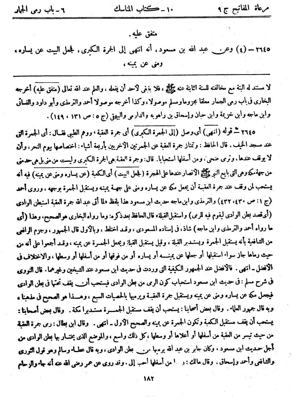 2645 – (4) وعن عبد الله بن مسعود، أنه انتهى إلى الجمرة الكبرى، فجعل البيت عن يساره، ومنى عن يمينه،