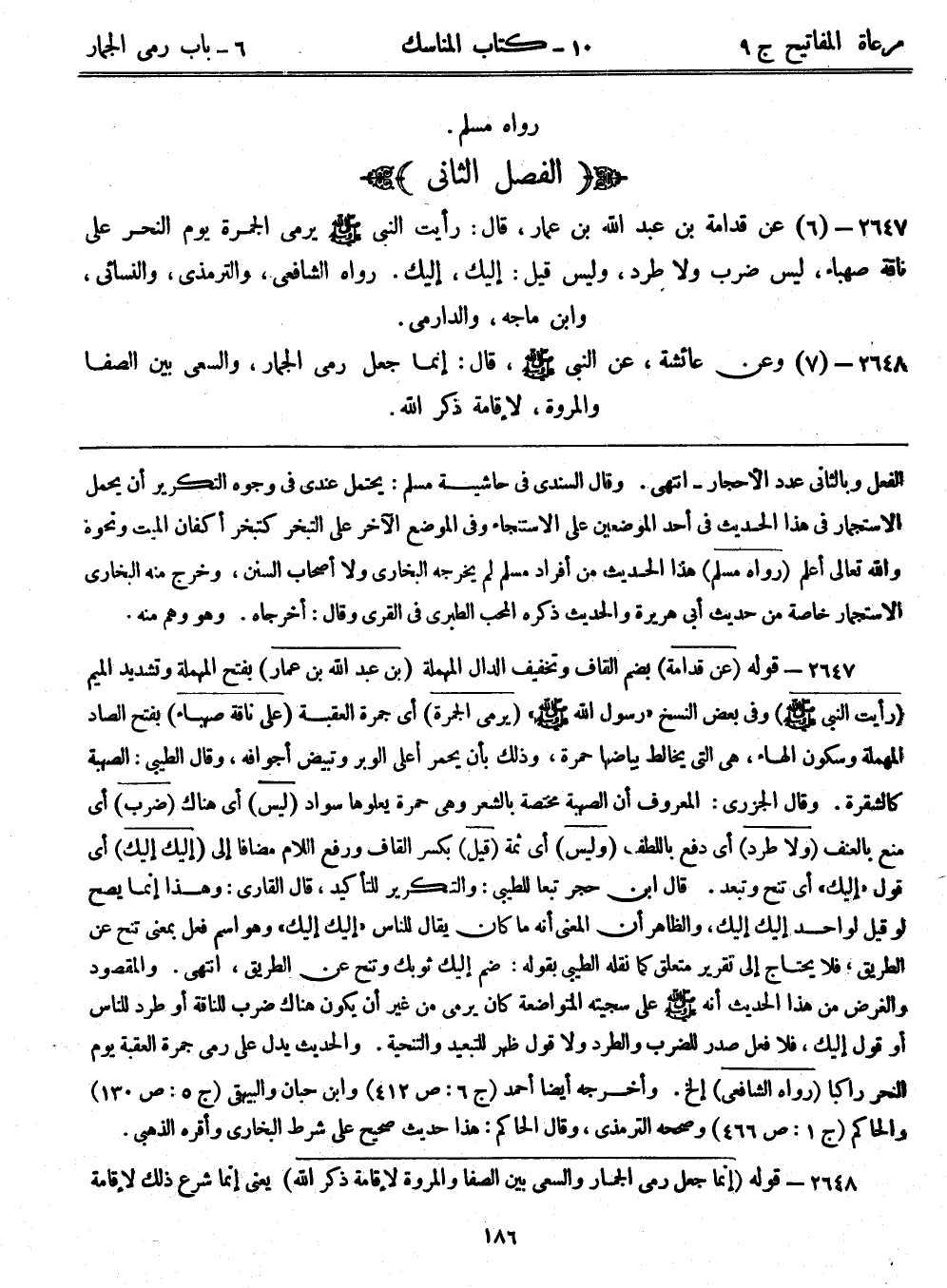 2647 – (6) عن قدامة بن عبد الله بن عمار، قال: رأيت النبي - صلى الله عليه وسلم - يرمي الجمرة يوم النحر على ناقة صهباء، ليس ضرب ولا طرد، وليس قيل: إليك، إليك. رواه الشافعي، والترمذي، والنسائي، وابن ماجة، والدارمي.