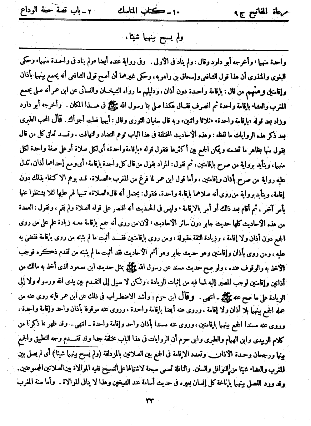 واحدة منهما، وأخرجه أبو داود وقال: ولم يناد في الأولى. وفي رواية عنده أيضًا ((ولم يناد في واحدة منهما)) وحكى البغوي والمنذري أن هذا قول الشافعي وإسحاق بن راهويه، وحكى غيرهما أن أصح قولي الشافعي أنه يجمع بينهما بأذان وإقامتين ومنهم من قال: بإقامة واحدة دون أذان، ودليلهم ما رواه الشيخان والنسائي عن ابن عمر أنه صلى بجمع المغرب والعشاء بإقامة واحدة ثم انصرف فقال هكذا صلى بنا رسول الله - صلى الله عليه وسلم - في هذا المكان، وأخرجه أبو داود وزاد بعد قوله ((بإقامة واحدة)) ((ثلاثًا واثنين)) وبه قال سفيان الثوري وقال: أيهما فعلت أجزأك. قال المحب الطبري بعد ذكر هذه الروايات ما لفظه: وهذه الأحاديث المختلفة في هذا الباب توهم التضاد والتهافت، وقد تعلق كل من قال بقول منها بظاهر ما تضمنه ويمكن الجمع بين أكثرها فنقول قوله ((بإقامة واحدة)) أي لكل صلاة أو على صفة واحدة لكل منهما، ويتأيد برواية من صرح بإقامتين، ثم نقول: المراد بقول من قال كل واحدة يإقامة، أي ومع إحداهما أذان، تدل عليه رواية من صرح بأذان وإقامتين، وأما قول ابن عمر لما فرغ من المغرب ((الصلاة)) قد يوهم الاكتفاء بذلك دون إقامة، ويتأيد برواية من روى أنه صلاهما بإقامة واحدة، فنقول: يحتمل أنه قال ((الصلاة)) تنبيهًا لهم عليها لئلا يشتغلوا عنها بأمر آخر، ثم أقام بعد ذلك أو أمر بالإقامة، وليس في الحديث أنه اقتصر على قوله الصلاة ولم يقم، ونقول: العمدة من هذه الأحاديث كلها حديث جابر دون سائر الأحاديث، لأن من روى أنه جمع بإقامة معه زيادة علم على من روى الجمع دون أذان ولا إقامة، وزيادة الثقة مقبولة، ومن روى بإقامتين فقد أثبت ما لم يثبته من روى بإقامة فقضى به عليه، ومن روى بأذان وإقامتين وهو حديث جابر وهو أتم الأحاديث فقد أثبت ما لم يثبته من تقدم ذكره فوجب الأخذ به والوقوف عنده، ولو صح حديث مسند عن رسول الله - صلى الله عليه وسلم - بمثل حديث ابن مسعود الذي أخذ به مالك من أذانين وإقامتين لوجب المصير إليه لما فيه من إثبات الزيادة، ولكن لا سبيل إلى التقدم بين يدي الله ورسوله ولا إلى الزيادة على ما صح عنه - صلى الله عليه وسلم - انتهى. وقال ابن حزم: وأشد الاضطراب في ذلك عن ابن عمر فإنه روي عنه من عمله الجمع بينهما بلا أذان ولا إقامة، وروي عنه أيضًا بإقامة واحدة، وروي عنه موقوفاً بأذان واحد وإقامة واحدة، وروي عنه مسندًا الجمع بينهما بإقامتين، وروي عنه مسندًا بأذان واحد وإقامة واحدة – انتهى. وقد ظهر مما ذكرنا من كلام الزبيدي وابن الهمام والطبري وابن حزم أن الروايات في هذا الباب مختلفة جدًا وقد تقدم وجه التطبيق والجمع بينهما ورجحان وحدة الأذان لإقامة في الجمع بين الصلاتين بالمزدلفة (ولم يسبح بينهما شيئًا) أي لم يصل بين المغرب والعشاء شيئًا من النوافل والسنن. والنافلة تسمى سبحة لاشتمالها على التسبيح ففيه المولاة بين الصلاتين المجموعتين. وقد ورد الفصل بينهما بإناخة كل إنسان بعيره في حديث أسامة عند الشيخين وهذا لا ينافي الموالاة. وأما سنة المغرب