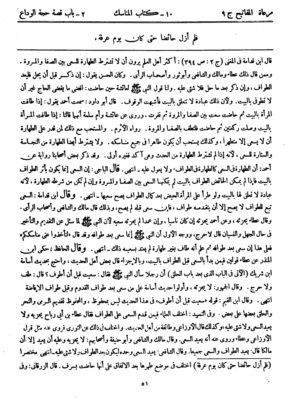 قال ابن قدامة في المغني (ج2: ص394) : أكثر أهل العلم يرون أن لا تشترط الطهارة للسعي بين الصفا والمروة. وممن قال ذلك عطاء ومالك والشافعي وأبو ثور وأصحاب الرأي. وكان الحسن يقول: إن ذكر قبل أن يحل فليعد الطواف، وإن ذكر بعد ما حل فلا شيء عليه. ولنا قول النبي - صلى الله عليه وسلم - لعائشة حين حاضت: اقضي ما يقضي الحاج غير أن لا تطوفي بالبيت. ولأن ذلك عبادة لا تتعلق بالبيت فأشبهت الوقوف. قال أبو داود: سمعت أحمد يقول: إذا طافت المرأة بالبيت ثم حاضت سعت بين الصفا والمروة ثم نفرت. ورُوِيَ عن عائشة وأم سلمة أنهما قالتا: إذا طافت المرأة بالبيت وصلت ركعتين ثم حاضت فلتطف بالصفا والمروة. رواه الأثرم. والمستحب مع ذلك لمن قدر على الطهارة أن لا يسعى إلا متطهرًا، وكذلك يستحب أن يكون طاهرًا في جميع مناسكه. ولا يشترط أيضًا الطهارة من النجاسة والستارة للسعي، لأنه إذا لم تشترط الطهارة من الحدث وهي آكد فغيره أولى. وقد ذكر بعض أصحابنا رواية عن أحمد: أن الطهارة في السعي كالطهارة في الطواف، ولا يعول عليه - انتهى. قال الباجي: إن السعي إنما يكون بأثر الطواف بالبيت، فإذا لم يمكن الحائض الطواف بالبيت لم يمكنها السعي بين الصفا والمروة، وإن لم تكن من شرطه الطهارة، لأنه عبادة لا تعلق لها بالبيت ولو طرأ على المرأة الحيض بعد كمال الطواف يصح سعيها - انتهى. وقال ابن قدامة: السعي تبع للطواف لا يصح إلا أن يتقدمه طواف، فإن سعى قبله لم يصح. وبذلك قال مالك والشافعي وأصحاب الرأي. وقال عطاء: يجزئه، وعن أحمد يجزئه إن كان ناسيًا، وإن عمدًا لم يجزئه سعيه لأن النبي - صلى الله عليه وسلم - لما سئل عن التقديم والتأخير في حال الجهل والنسيان قال: لا حرج. ووجه الأول أن النبي - صلى الله عليه وسلم - إنما سعى بعد طوافه وقد قال: " لتأخذوا عنى مناسككم ". فعلى هذا إن سعى بعد طوافه ثم علم أنه طاف بغير طهارة لم يعتد بسعيه ذلك – انتهى. وقال الحافظ: حكى ابن المنذر عن عطاء قولين فيمن بدأ بالسعي قبل الطواف بالبيت، وبالإجزاء قال بعض أهل الحديث، واحتج بحديث أسامة بن شريك (الآتي في الباب الذي بعد باب الحلق) أن رجلاً سأل النبي - صلى الله عليه وسلم - فقال: سعيت قبل أن أطوف؟ قال: طف ولا حرج. وقال الجمهور: لا يجزئه، وأولوا حديث أسامة على من سعى بعد طواف القدوم وقبل طواف الإفاضة انتهى. وقال ابن القيم: قوله ((سعيت قبل أن أطواف)) في هذا الحديث ليس بمحفوظ، والمحفوظ تقديم الرمي والنحر والحلق بعضها على بعض. وفي التمهيد: اختلف العلماء فيمن قدم السعي على الطواف فقال عطاء بن أبي رباح يجزيه ولا يعيد السعي ولا شيء عليه، وكذلك قال الأوزاعي وطائفة من أهل الحديث. واختلف في ذلك عن النووي فرُوي عنه مثل قول الأوزاعي وعطاء ورُوي عنه أنه يعيد السعي. وقال مالك والشافعي وأبو حنيفة وأصحابهم: لا يجزيه وعليه أن يعيد إلا أن مالكاً قال: يعيد الطواف والسعي جميعًا. وقال الشافعي: يعيد السعي وحده ليكون بعد الطواف ولا شيء عليه – انتهى مختصرًا. (فلم أزل حائضاً حتى كان يوم عرفة) اختلف في موضع طهرها بعد الاتفاق على أنها حاضت بسرف. قال الزرقاني: وفي