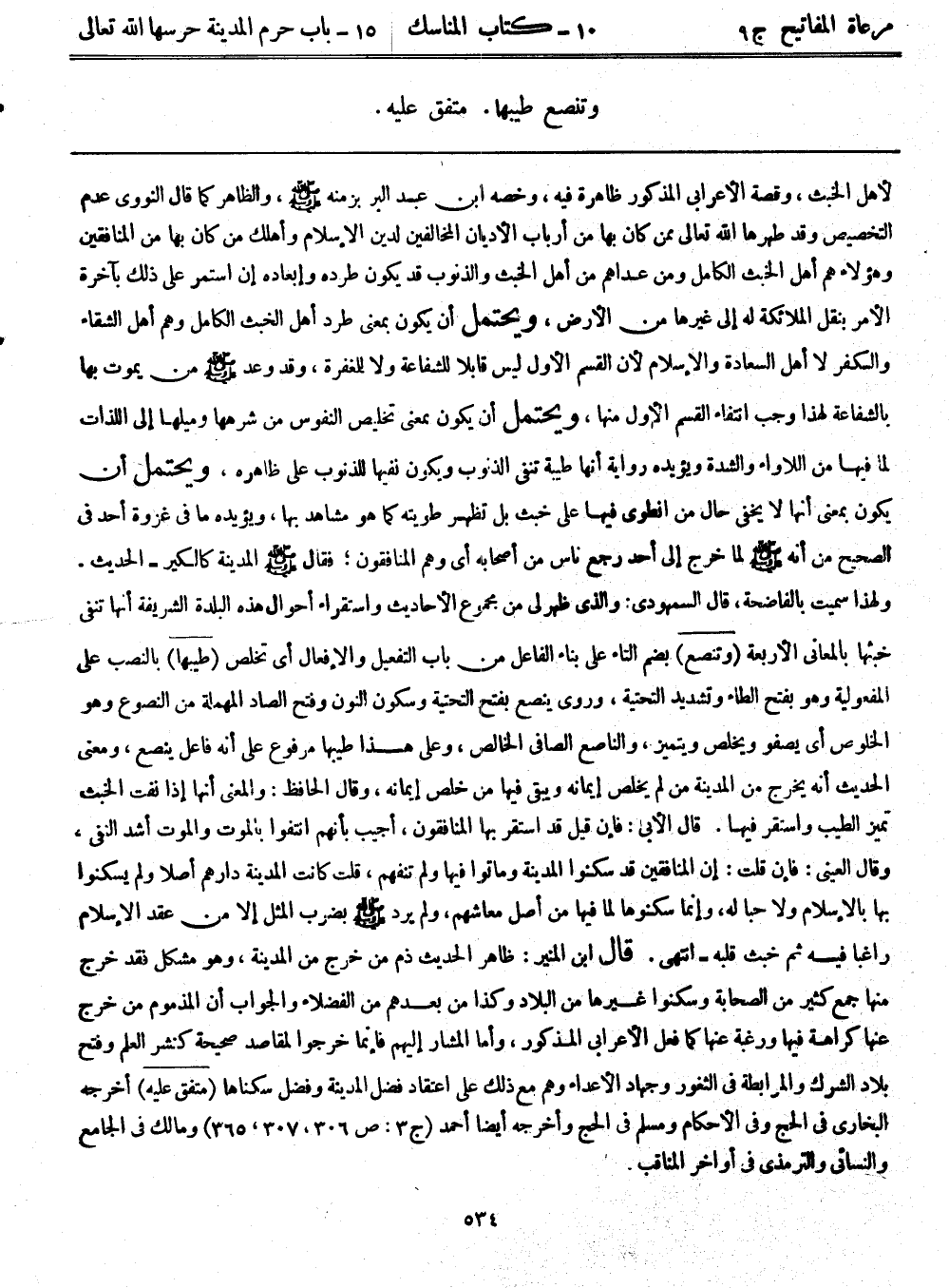 لأهل الخبث وقصة الأعرابي المذكور ظاهرة فيه، وخصه ابن عبد البر بزمنه - صلى الله عليه وسلم -، والظاهر كما قال النووي عدم التخصيص وقد طهرها الله تعالى ممن كان بها من أرباب الأديان المخالفين لدين الإسلام وأهلك من كان بها من المنافقين وهؤلاء هم أهل الخبث الكامل ومن عداهم من أهل الخبث والذنوب قد يكون طرده وإبعاده إن استمر على ذلك بآخرة الأمر بنقل الملائكة له إلى غيرها من الأرض، ويحتمل أن يكون بمعنى طرد أهل الخبث الكامل وهم أهل الشقاء والكفر لا أهل السعادة والإسلام لأن القسم الأول ليس قابلاً للشفاعة ولا للمغفرة، وقد وعد - صلى الله عليه وسلم - من يموت بها بالشفاعة لهذا وجب انتفاء القسم الأول منها، ويحتمل أن يكون بمعنى تخليص النفوس من شرها وميلها إلى اللذات لما فيها من اللأواء والشدة ويؤيده رواية أنها طيبة تنفي الذنوب ويكون نفيها للذنوب على ظاهره، ويحتمل أن يكون بمعنى أنها لا يخفى حال من انطوى فيها على خبث بل تظهر طويته كما هو مشاهد بها، ويؤيده ما في غزوة أحد في الصحيح من أنه - صلى الله عليه وسلم - لما خرج إلى أحد رجع ناس من أصحابه أي وهم المنافقون؛ فقال النبي - صلى الله عليه وسلم -: " المدينة كالكير ... " – الحديث. ولهذا سميت بالفاضحة، قال السمهودي: والذي ظهر لي من مجموع الأحاديث واستقراء أحوال هذه البلدة الشريفة أنها تنفي خبثها بالمعاني الأربعة (وتنصع) بضم التاء على بناء الفاعل من باب التفعيل والإفعال أي تخلص (طيبها) بالنصب على المفعولية وهو بفتح الطاء وتشديد التحتية، وروي ينصع بفتح التحتية وسكون النون وفتح الصاد المهملة من النصوع وهو الخلوص أي يصفو ويخلص ويتميز، والناصع الصافي الخالص، وعلى هذا طيبها مرفوع على أنه فاعل ينصع، ومعنى الحديث أنه يخرج من المدينة من لم يخلص إيمانه، ويبقى فيها من خلص إيمانه، وقال الحافظ: والمعنى أنها إذا نفت الخبث تميز الطيب واستقر فيها. قال الأبي: فإن قيل قد استقر بها المنافقون، أجيب بأنهم انتفوا بالموت، والموت أشد النفي، وقال العيني: فإن قلت: إن المنافقين قد سكنوا المدينة وماتوا فيها ولم تنفهم، قلت: كانت المدينة دارهم أصلاً ولم يسكنوا بها بالإسلام ولا حبًا له، وإنما سكنوها لما فيها من أصل معاشهم، ولم يرد - صلى الله عليه وسلم - بضرب المثل إلا من عقد الإسلام راغبًا فيه ثم خبث قلبه – انتهى. قال ابن المنير: ظاهر الحديث ذم من خرج من المدينة، وهو مشكل فقد خرج منها جمع كثير من الصحابة وسكنوا غيرها من البلاد، وكذا من بعدهم من الفضلاء، والجواب أن المذموم من خرج عنها كراهة فيها ورغبة عنها كما فعل الأعرابي المذكور، وأما المشار إليهم فإنما خرجوا لمقاصد صحيحة كنشر العلم وفتح بلاد الشرك والمرابطة في الثغور وجهاد الأعداء وهم مع ذلك على اعتقاد فضل المدينة وفضل سكانها (متفق عليه) أخرجه البخاري في الحج وفي الأحكام، ومسلم في الحج، وأخرجه أيضًا أحمد (ج 3: ص 306، 307، 365) ومالك في الجامع والنسائي والترمذي في أواخر المناقب.