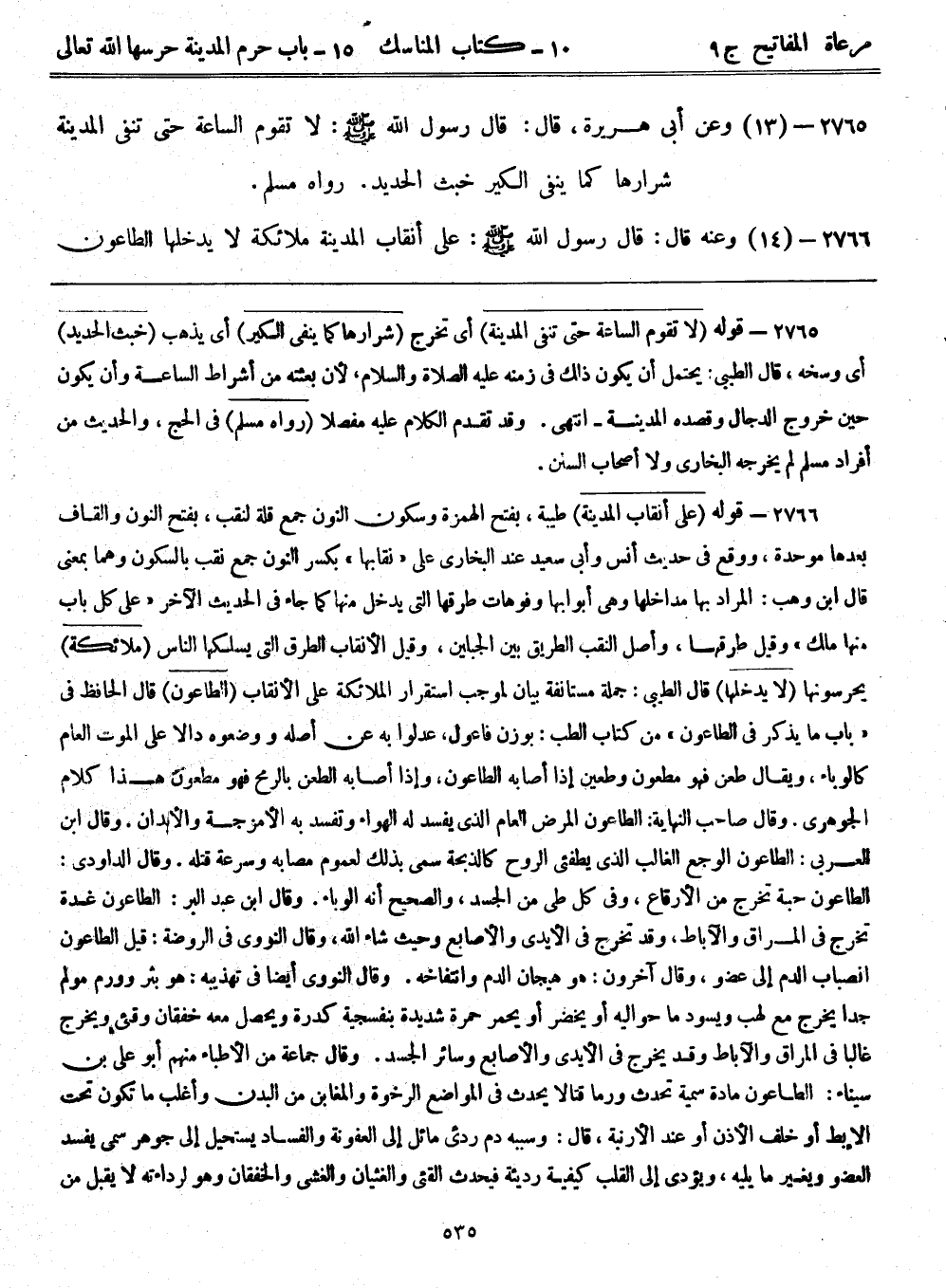 2766- قوله (على أنقاب المدينة) طيبة، بفتح الهمزة وسكون النون جمع قلة لنَقَب، بفتح النون والقاف بعدها موحدة، ووقع في حديث أنس وأبي سعيد عند البخاري على ((نقابها)) بكسر النون جمع نقب بالسكون، وهما بمعنى. قال ابن وهب: المراد بها مداخلها وهي أبوابها وفوهات طرقها التي يدخل منها كما جاء في الحديث الآخر ((على كل باب منها ملك، وقيل طرقها، وأصل النقب الطريق بين الجبلين، وقيل الأنقاب الطرق التي يسكنها الناس (ملائكة) يحرسونها (لا يدخلها) قال الطيبي: جملة مستأنفة بيان لموجب استقرار الملائكة على الأنقاب (الطاعون) قال الحافظ في ((باب ما يذكر في الطاعون)) من كتاب الطب: بوزن فاعول، عدلوا به عن أصله ووضعوه دالاً على الموت العام كالوباء، ويقال طعن فهو مطعون وطعين إذا أصابه الطاعون، وإذا أصابه الطعن بالرمح فهو مطعون، هذا كلام الجوهري. وقال صاحب النهاية: الطاعون المرض العام الذي يفسد له الهواء وتفسد به الأمزجة والأبدان. وقال ابن العربي: الطاعون الوجع الغالب الذي يطفئ الروح كالذبحة، وسمي بذلك لعموم مصابه وسرعة قتله. وقال الداودي: الطاعون حبة تخرج من الأرقاع، وفي كل طي من الجسد، والصحيح أنه الوباء. وقال ابن عبد البر: الطاعون غدة تخرج في المراق والآباط، وقد تخرج في الأيدي والأصابع وحيث شاء الله، وقال النووي في الروضة: قبل الطاعون انصباب الدم إلى عضو، وقال آخرون: وهو هيجان الدم وانتفاخه. وقال النووي أيضًا في تهذيبه: هو بثر وورم مؤلم جدًا يخرج مع لهب ويسود ما حواليه أو يخضر أو يحمر حمرة شديدة بنفسجية كدرة ويحصل معه خفقان وقيء ويخرج غالبًا في المراق والآباط وقد يخرج في الأيدي والأصابع وسائر الجسد. وقال جماعة من الأطباء منهم أبو علي بن سيناء: الطاعون مادة سمية تحدث ورمًا قتالاً يحدث في المواضع الرخوة والمغابن من البدن، وأغلب ما تكون تحت الإبط أو خلف الأذن أو عند الأرنبة. قال: وسببه دم رديء مائل إلى العفونة والفساد يستحيل إلى جوهر سمي يفسد العضو ويغير ما يليه، ويؤدي إلى القلب كيفية رديئة فيحدث القيء والغثيان والغشي والخفقان وهو لرداءته لا يقبل من